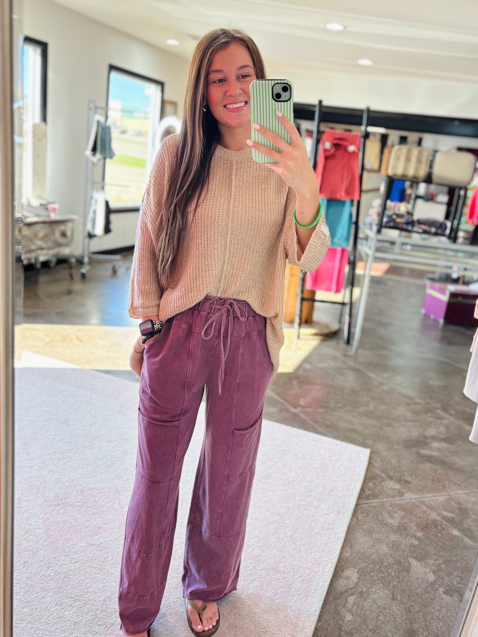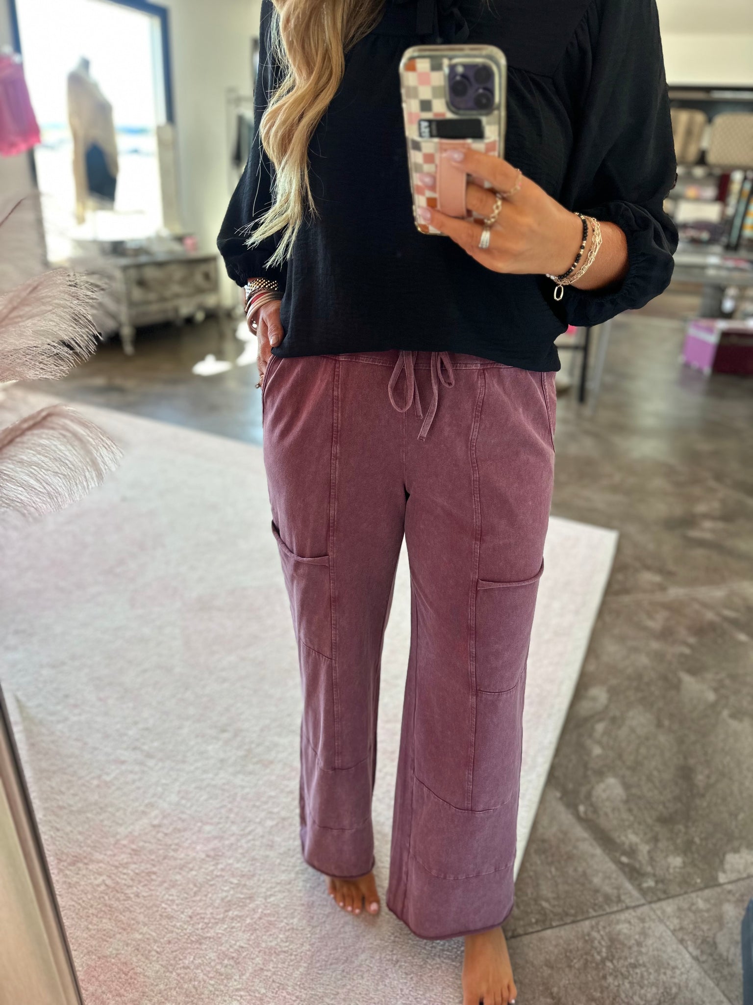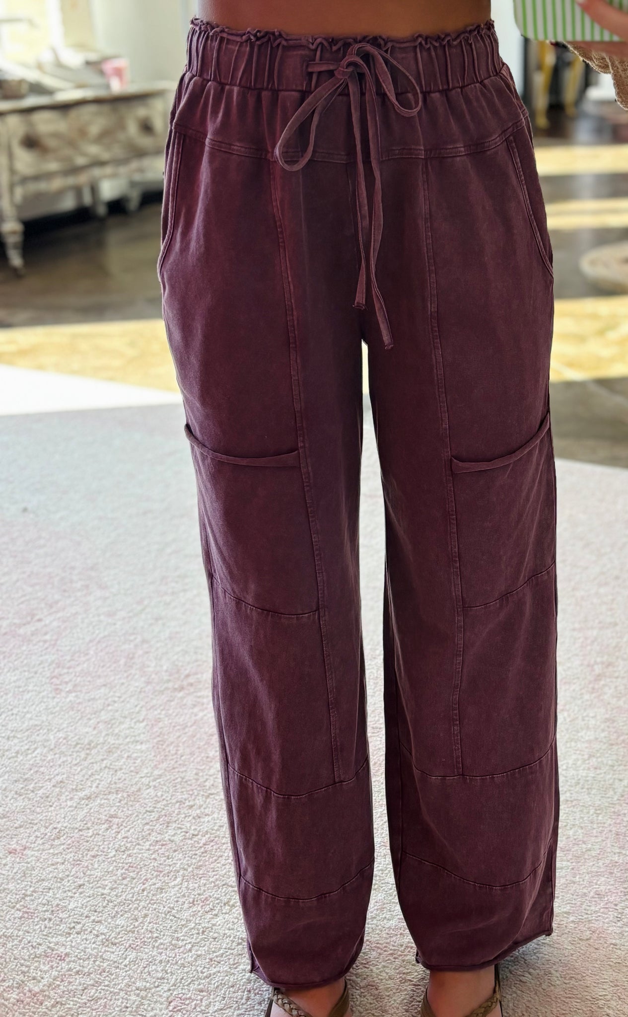 These are a wild berry mineral wash wide leg pant. They have patchwork pockets and a high waisted raw hem. These are so comfy!