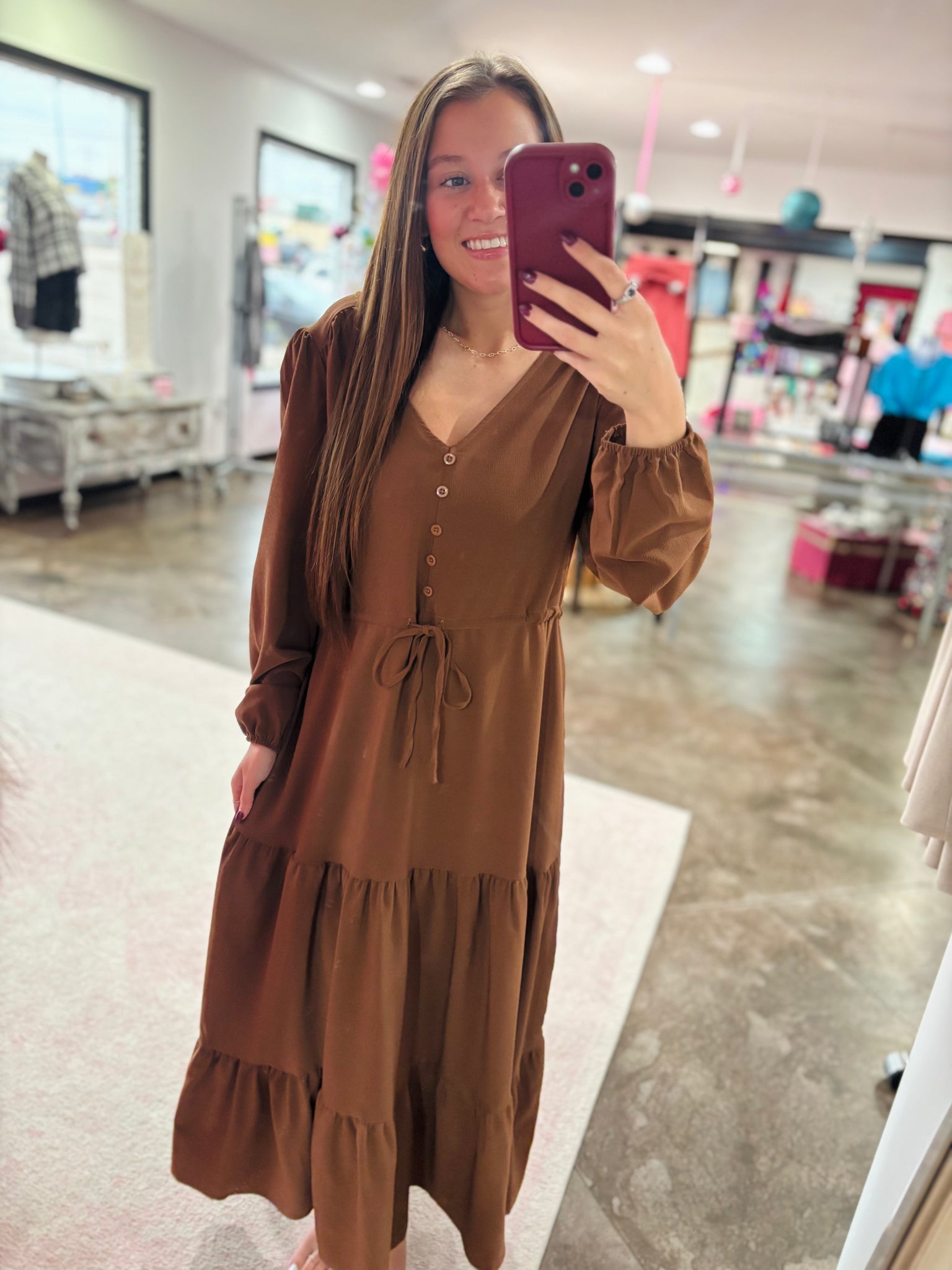 This is a chestnut brown maxi dress is so gorgeous! It has button v-neck and long sleeves. This is the perfect tiered maxi dress!