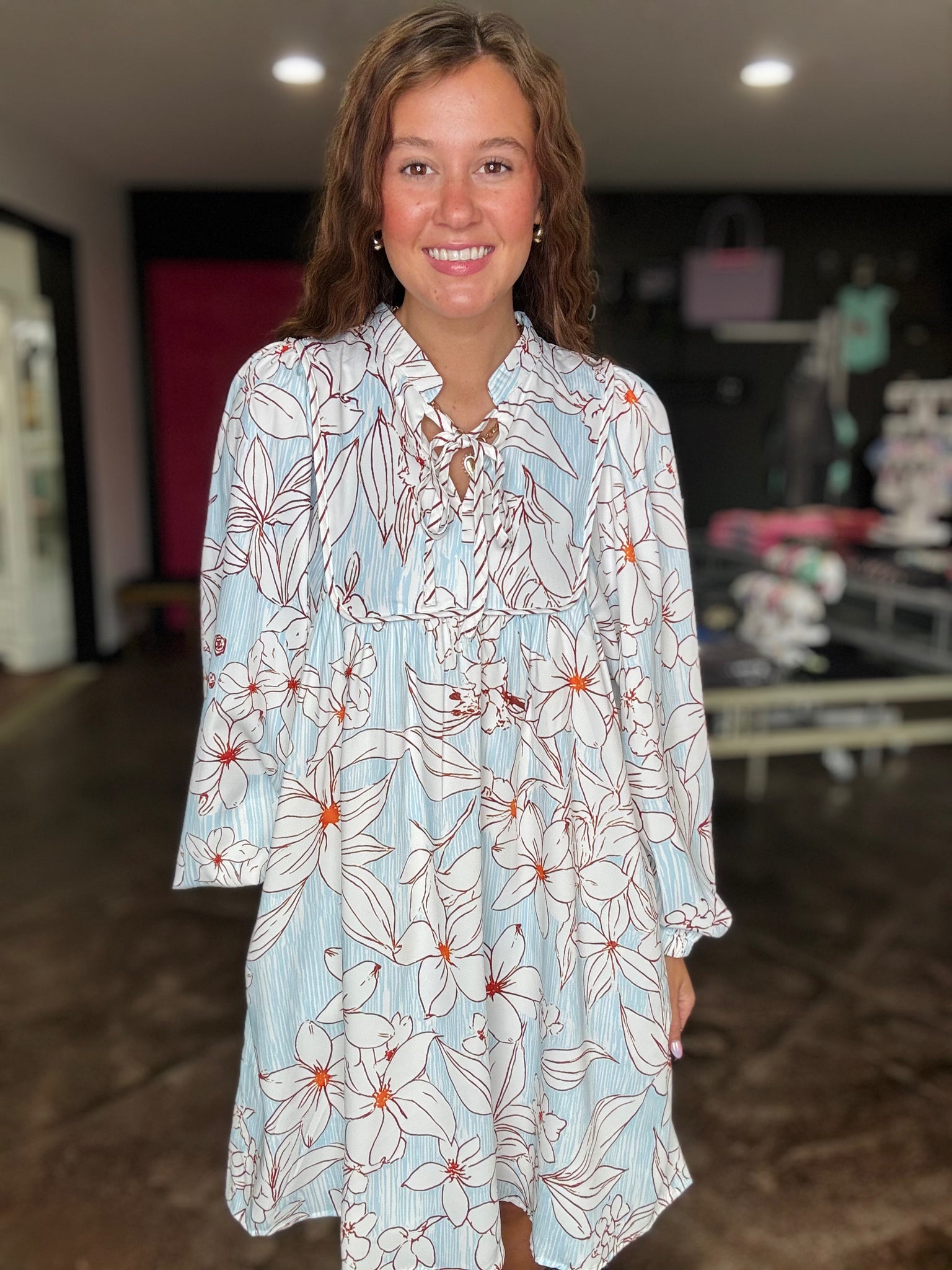 This light blue dress with brown florals is beautiful! It has a tie neck and sleeves! This is such a cute mini dress!