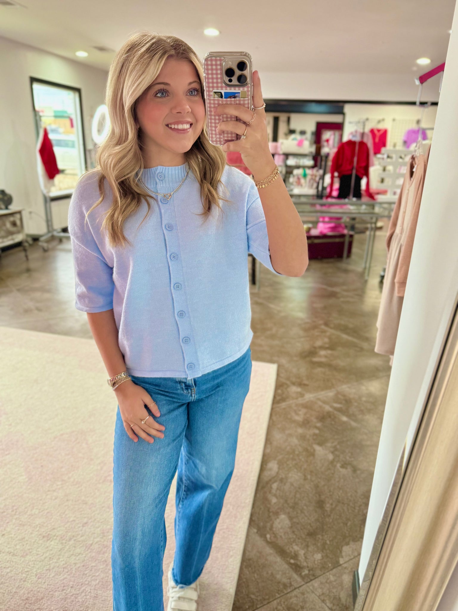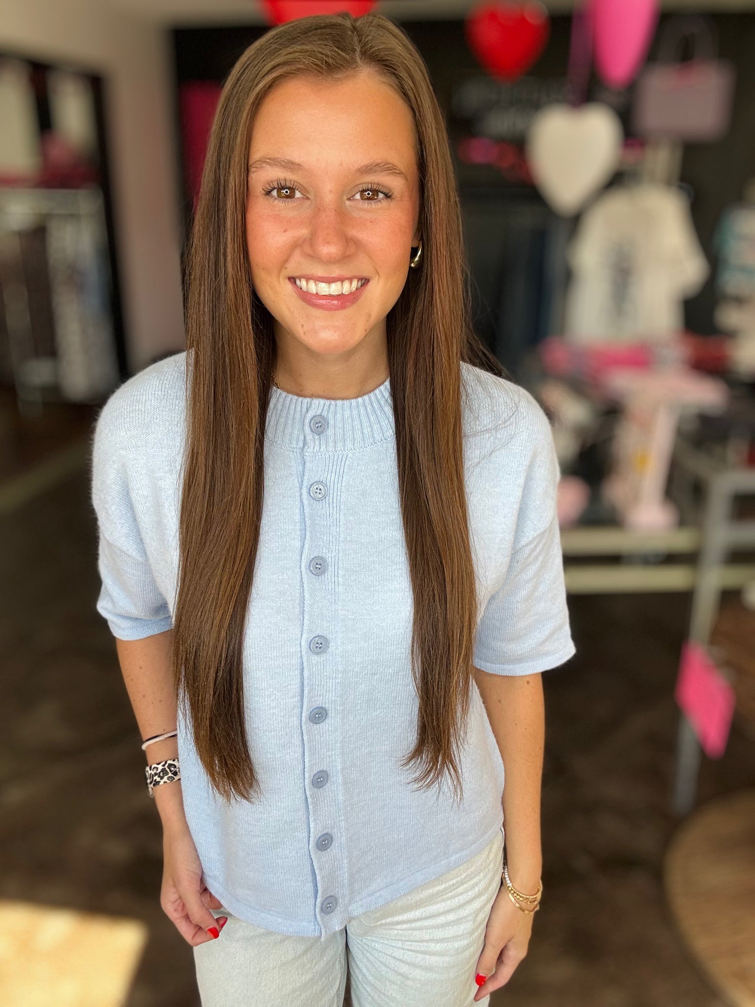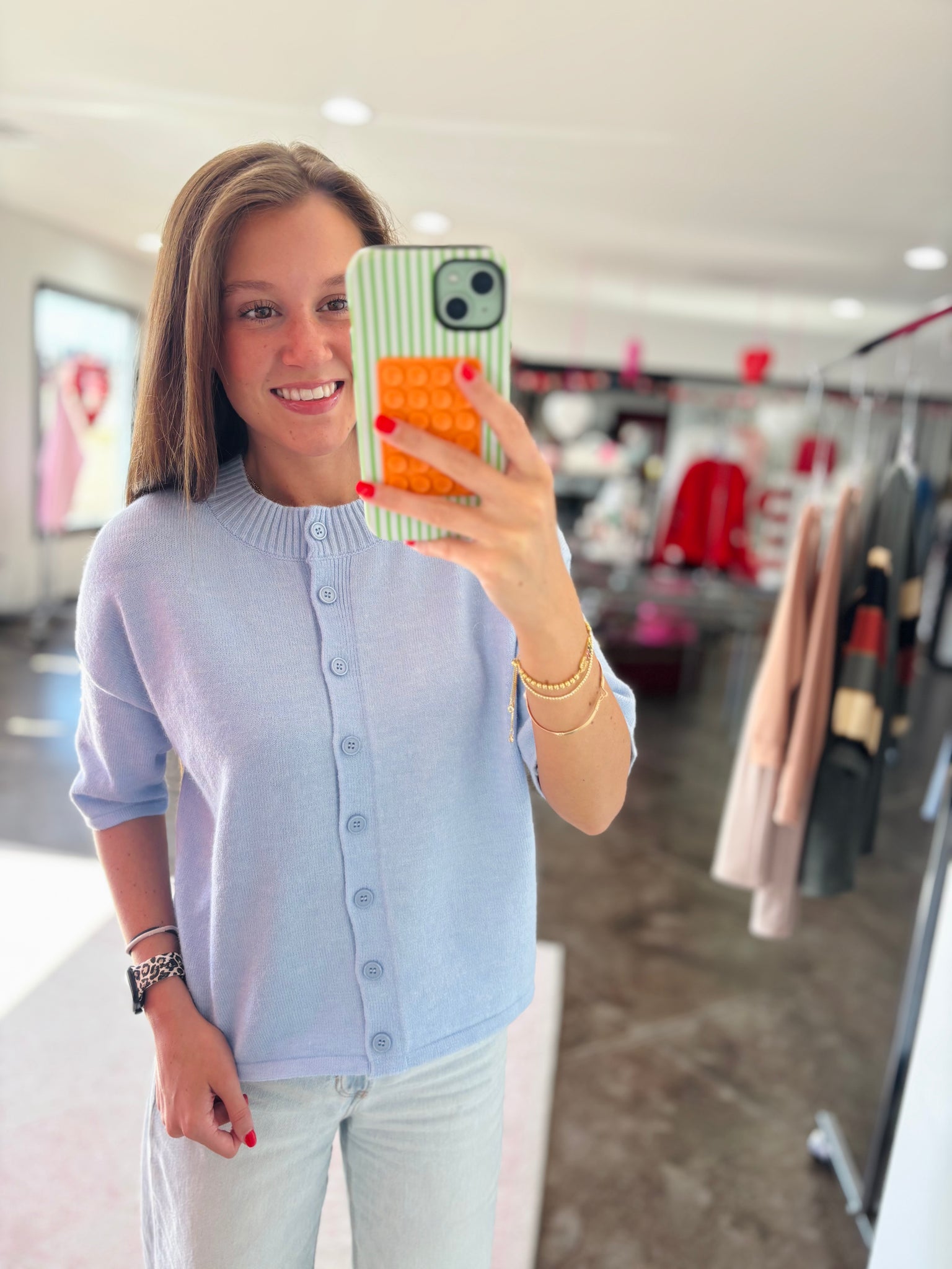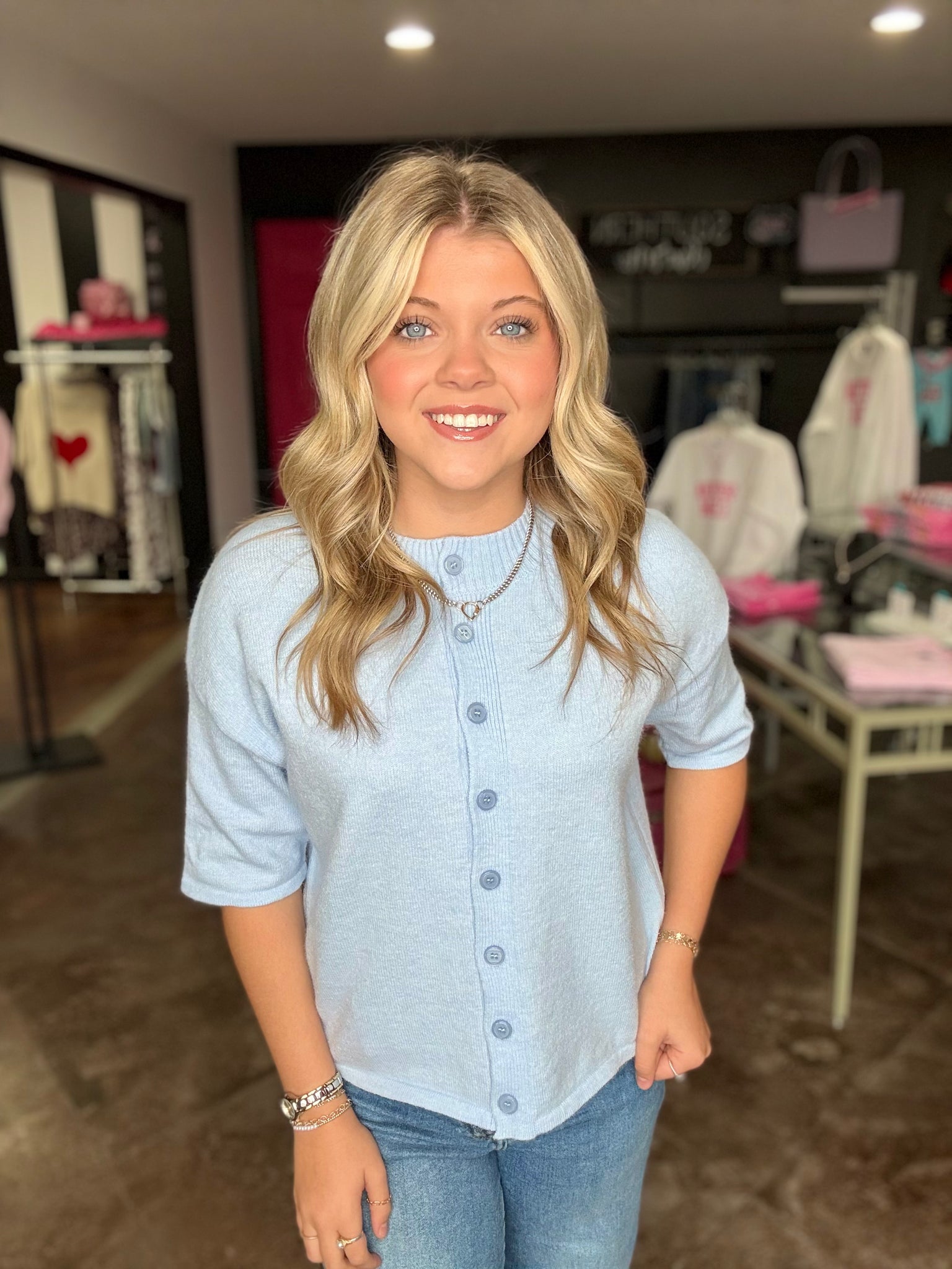 This is a baby blue sweater knit top! It has 3/4 length sleeves and buttons down the front! This is such a cute top!