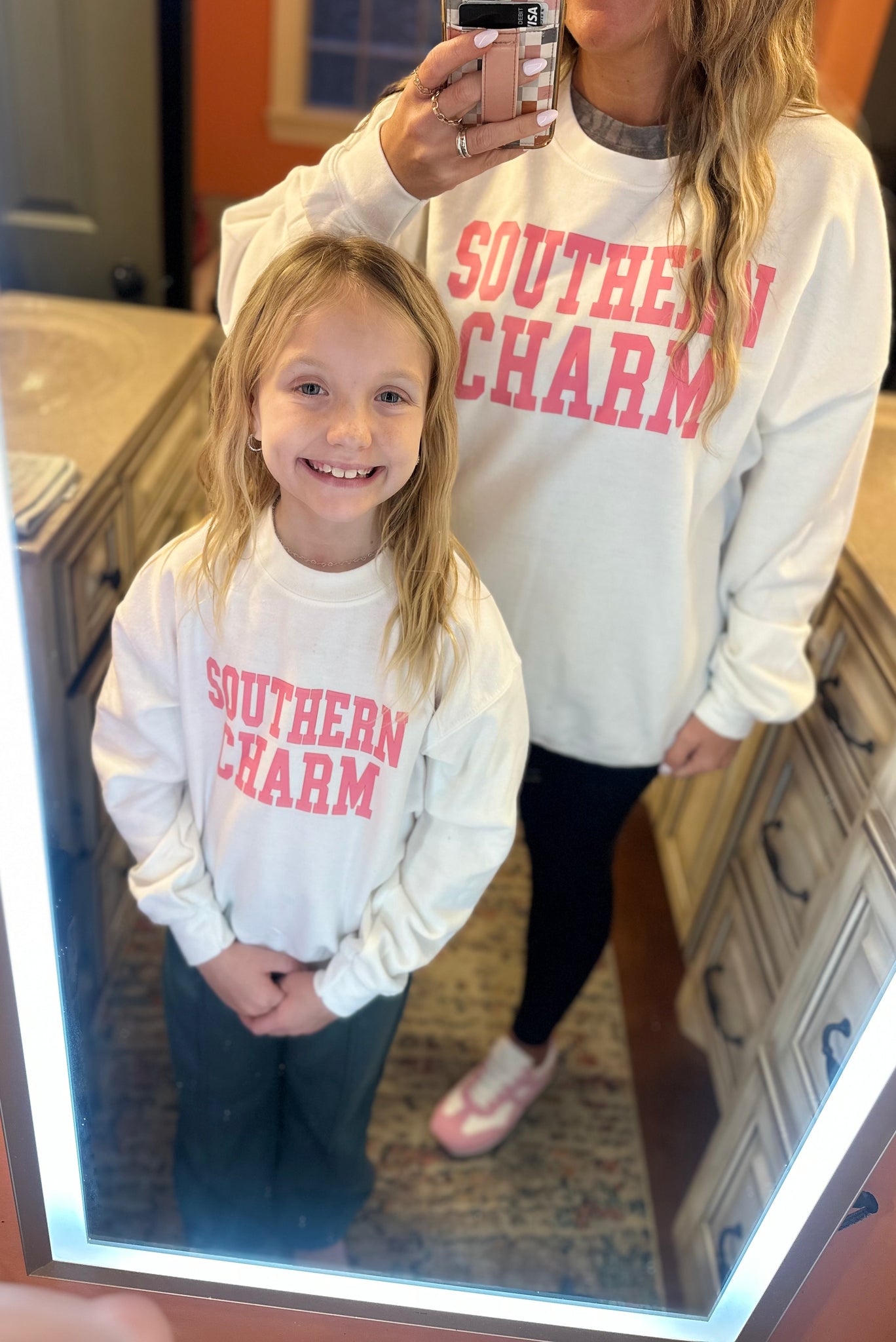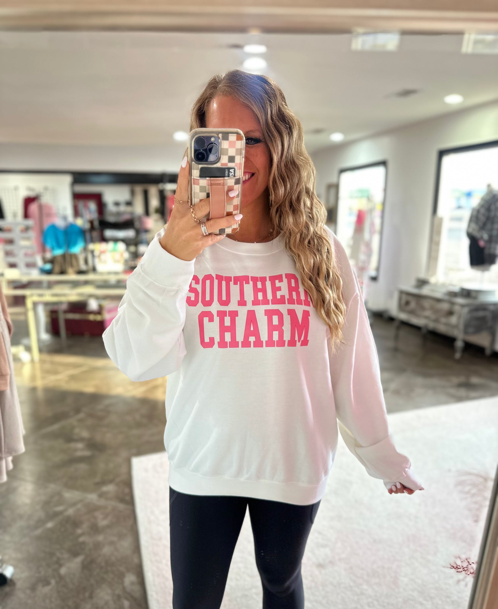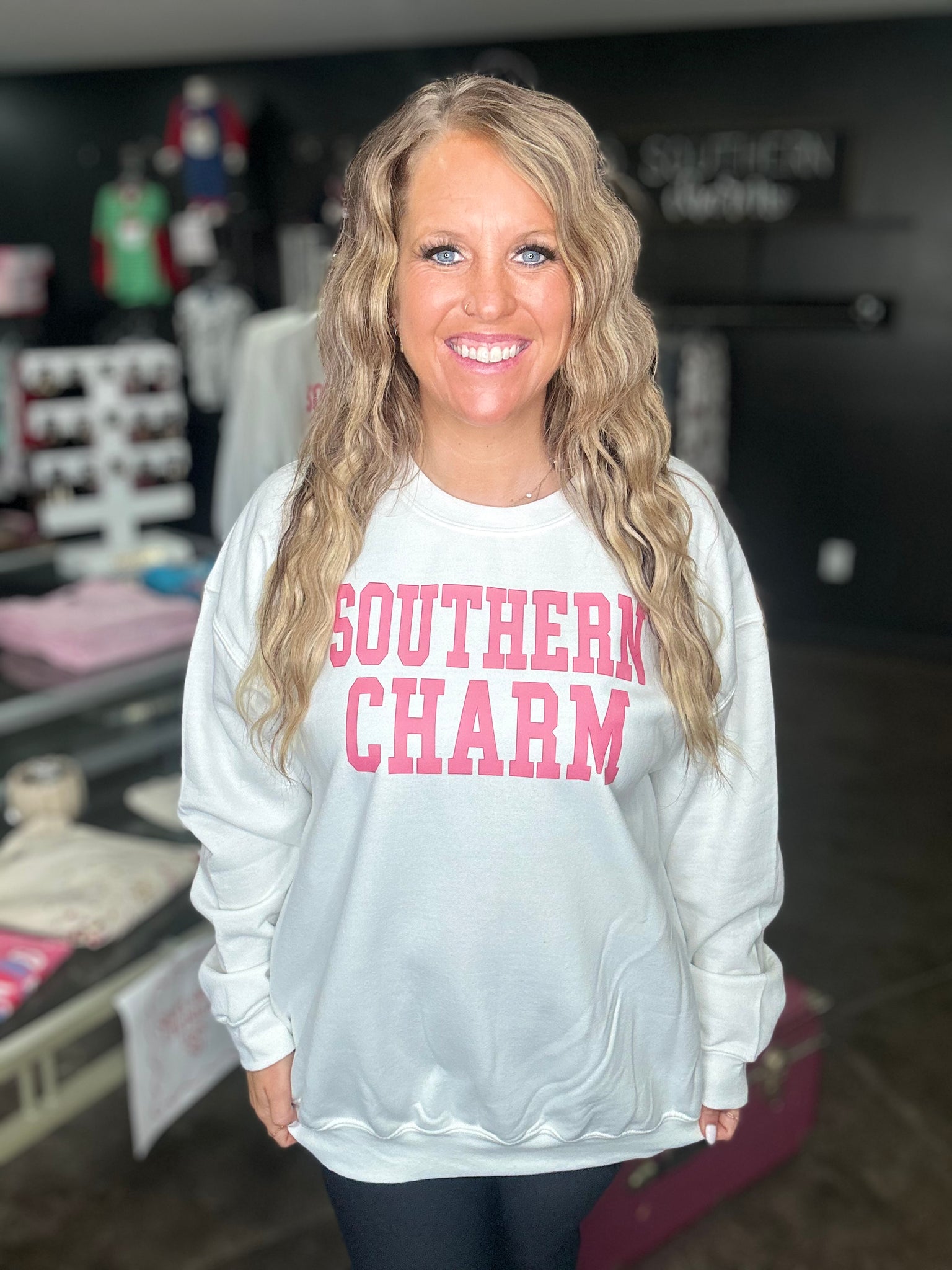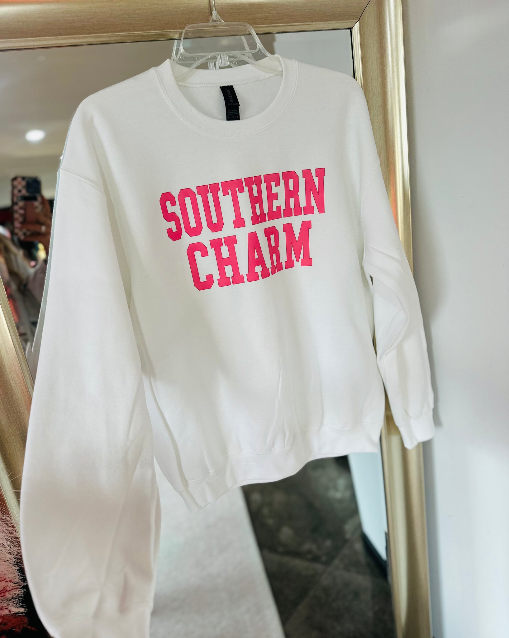 This white sweatshirt has the best, bold hot pink Southern Charm logo on it. It is on the heavy blend, gildan brand sweatshirt & is liable to shrink a little.
