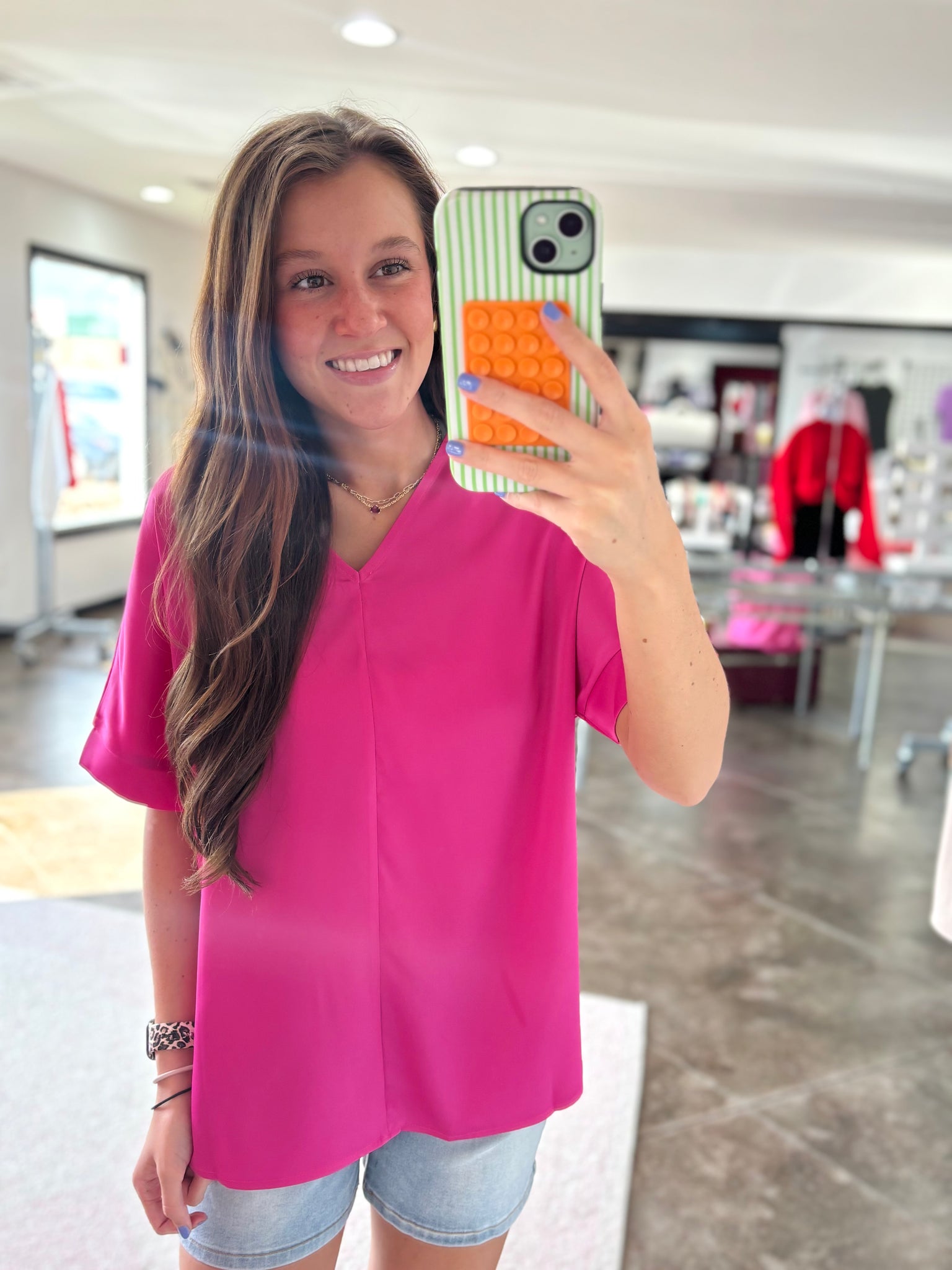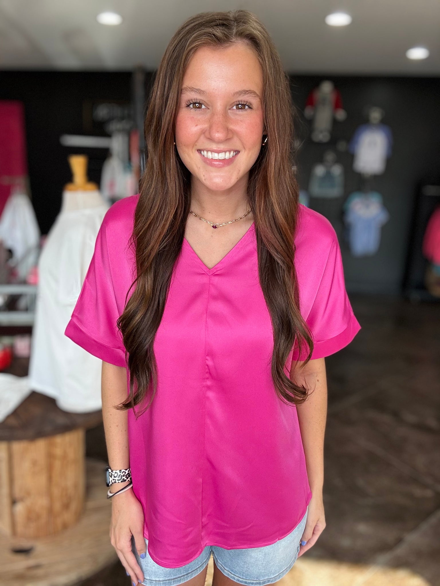 This is a bright pink short sleeve top. It is made of a silky material and has the cutest v-neck! This is the perfect top for our pink lovers!