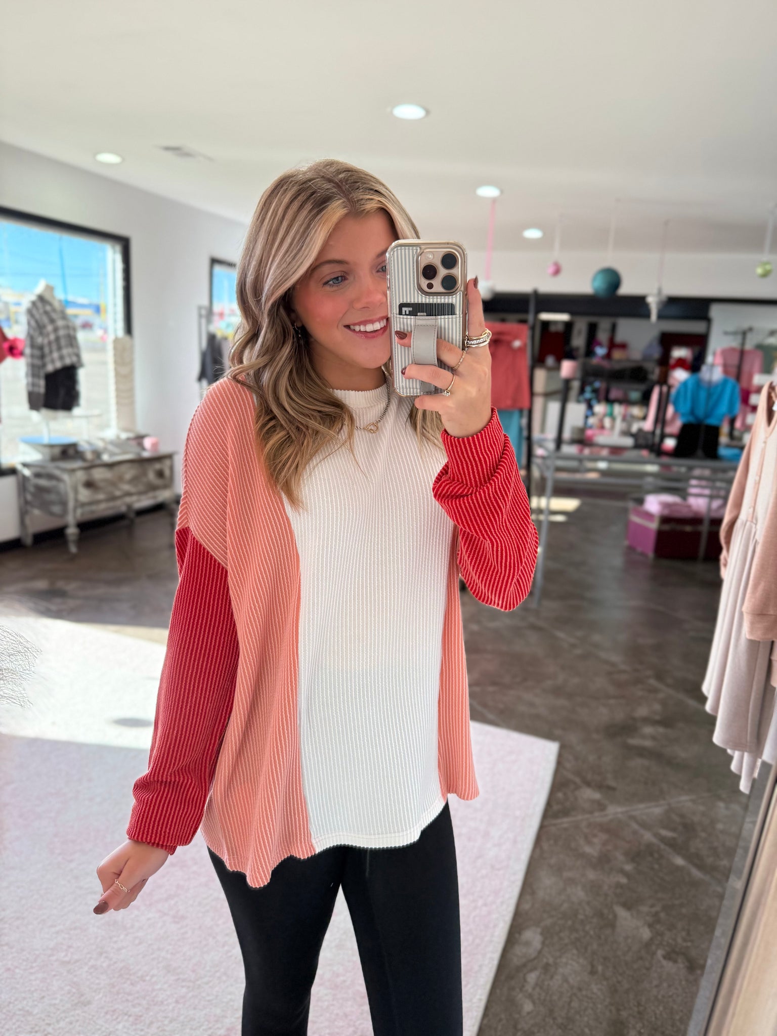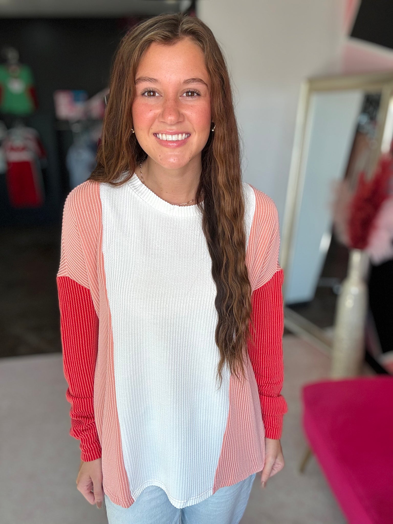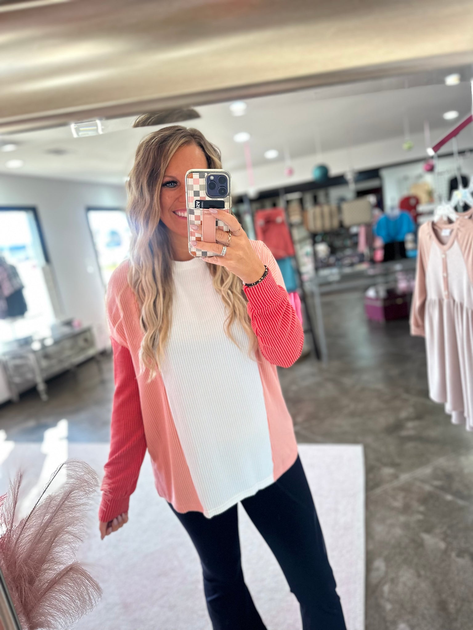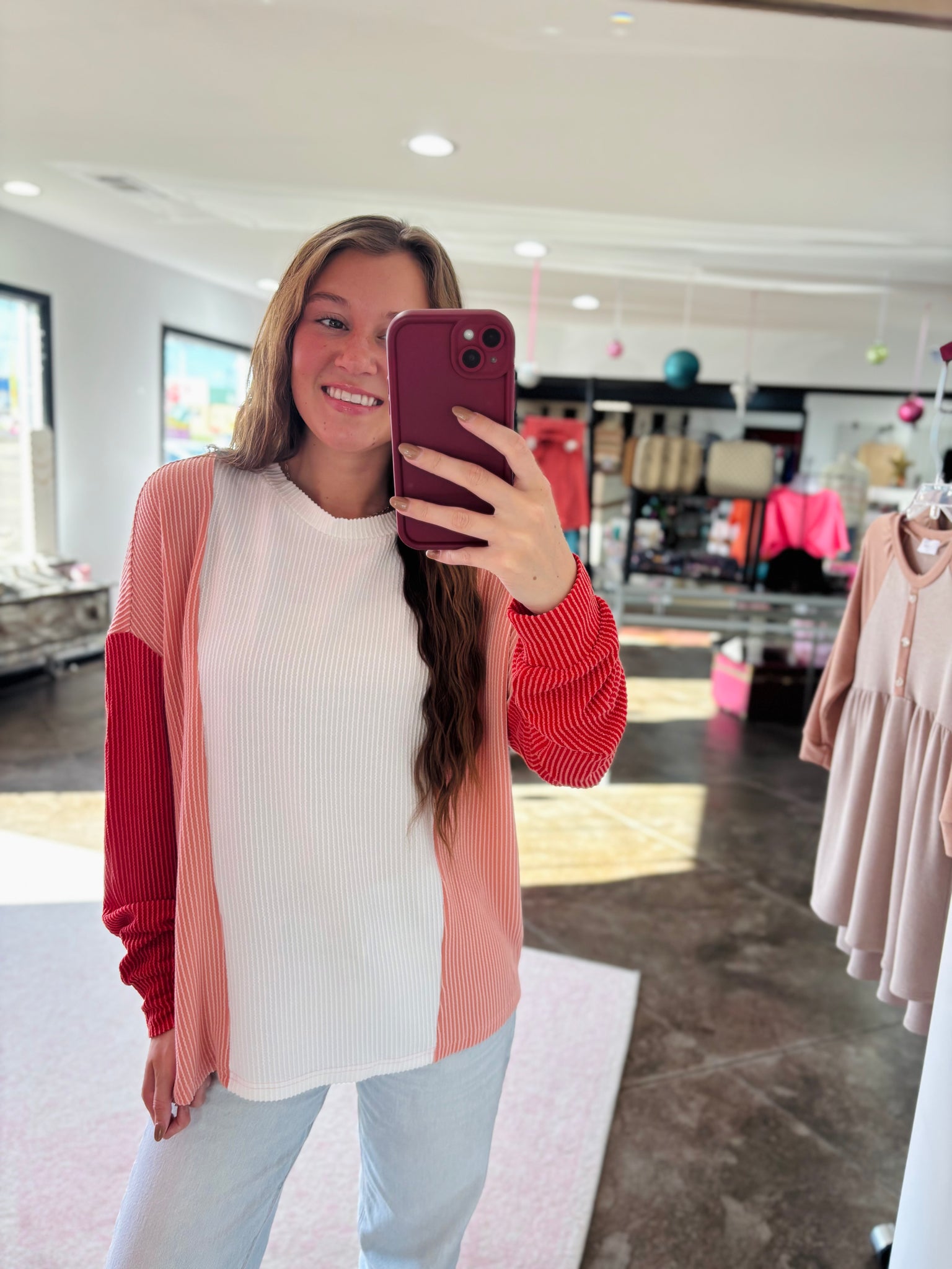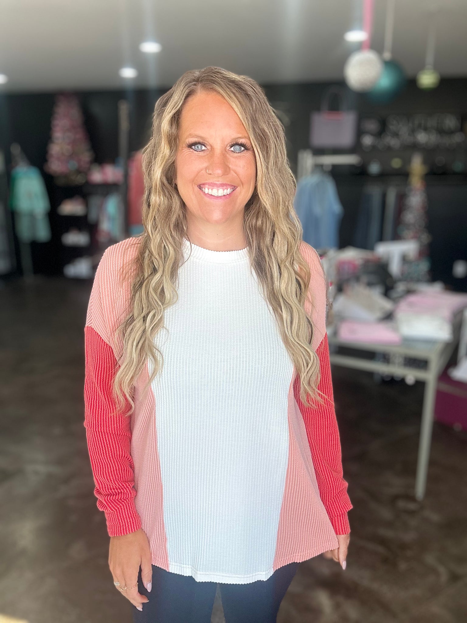 This is a pale chestnut color block top. It is a corded style top! This is the perfect light weight long sleeve top!