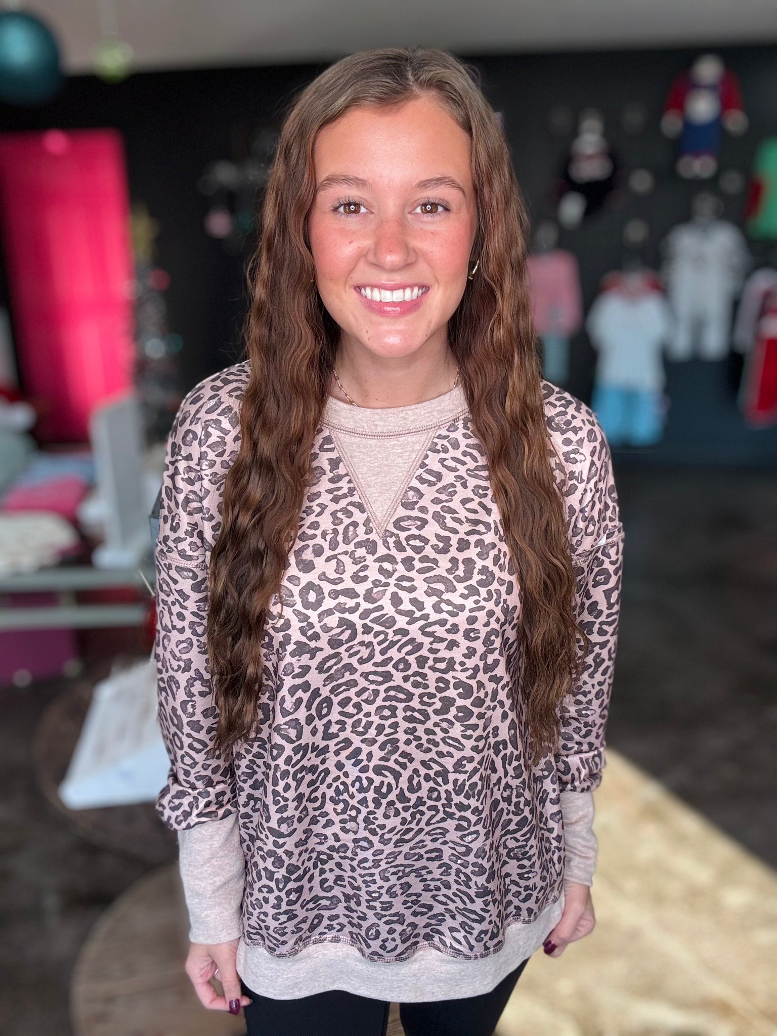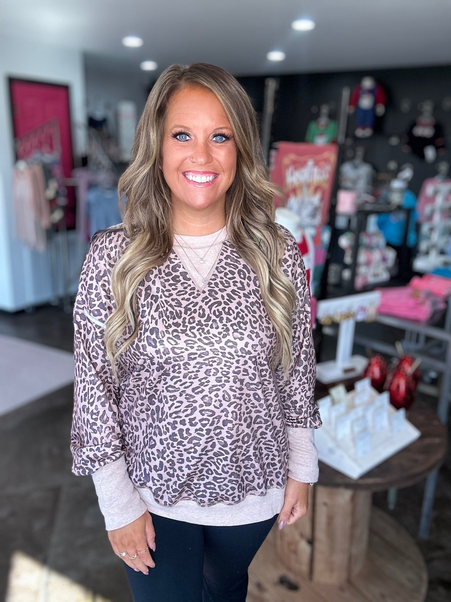 Khaki leopard print pull over with khaki patchwork detailing. This is the cutest pulover that can be easily dressed up or down.