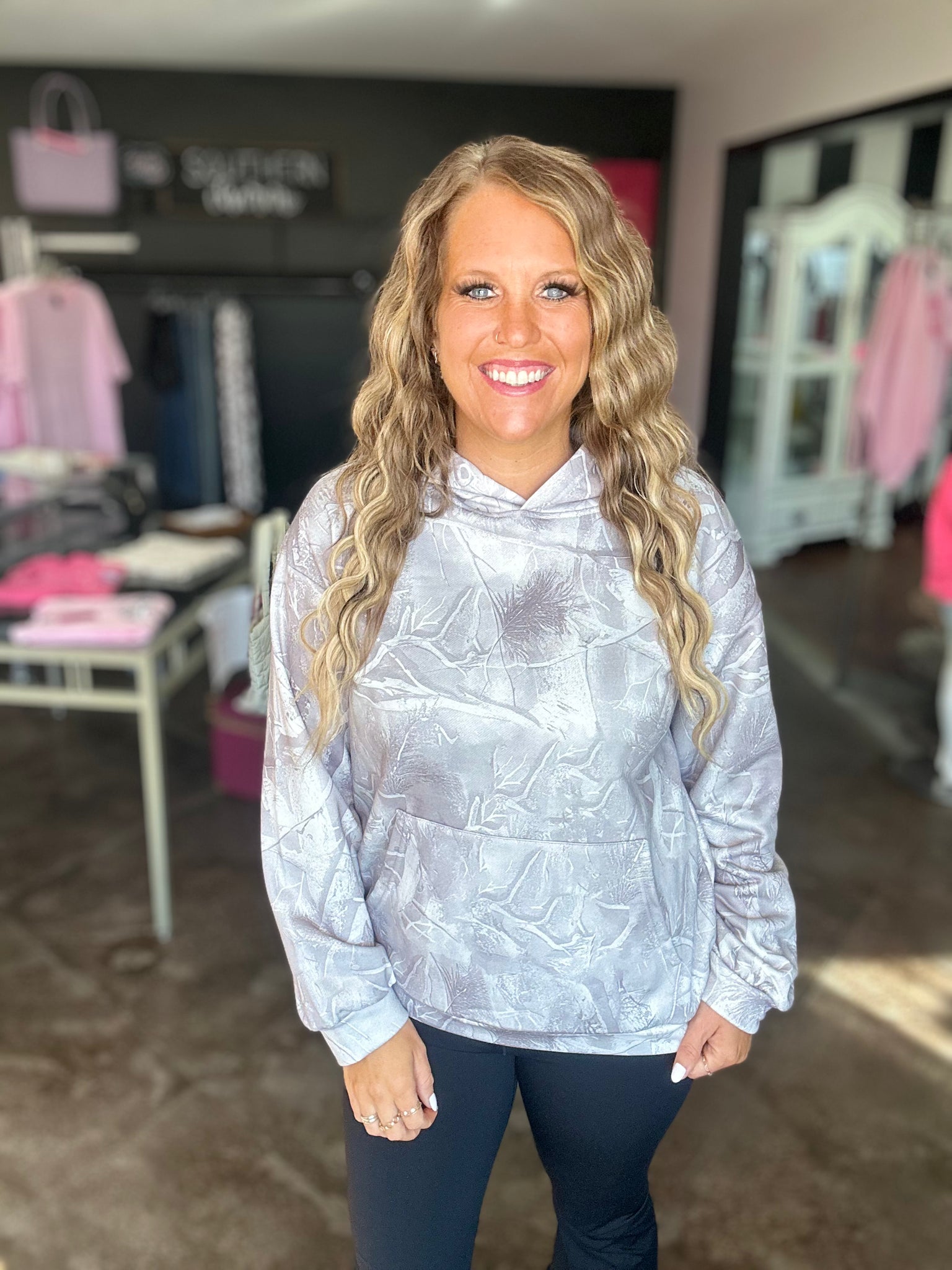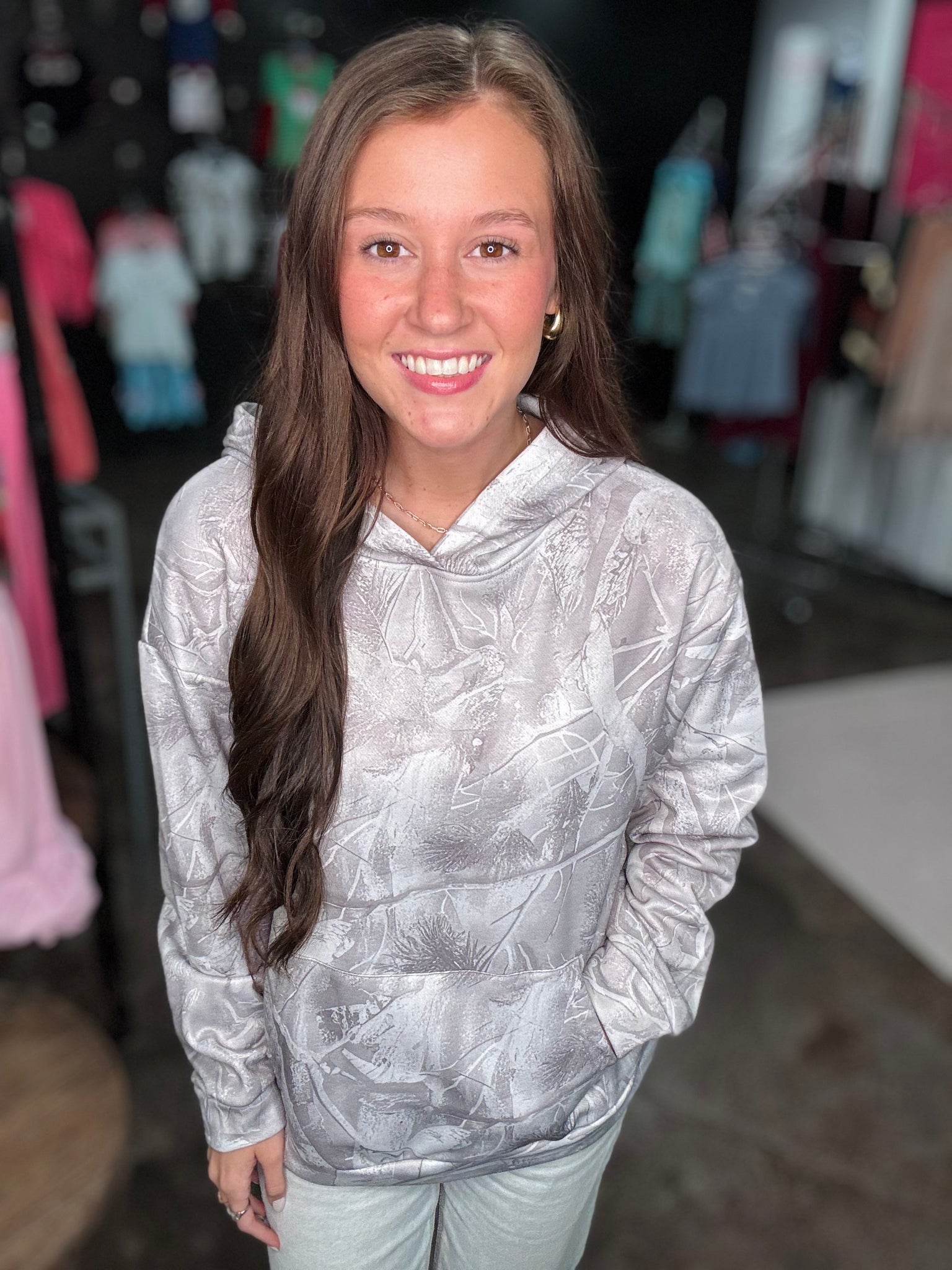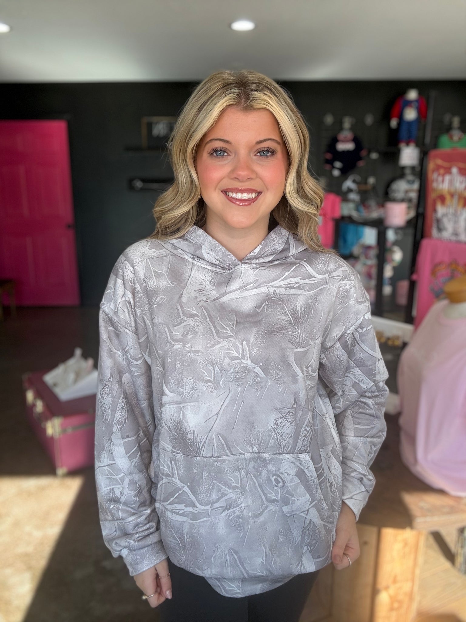 Washed, grey camo hoodie with a kangaroo pocket and a true to size fit. This hoodie is nice and cozy with a light fleece lining on the inside.