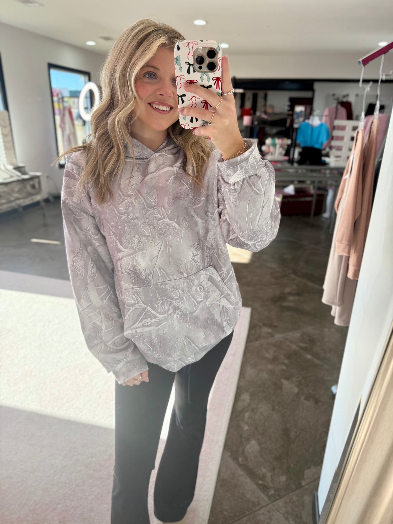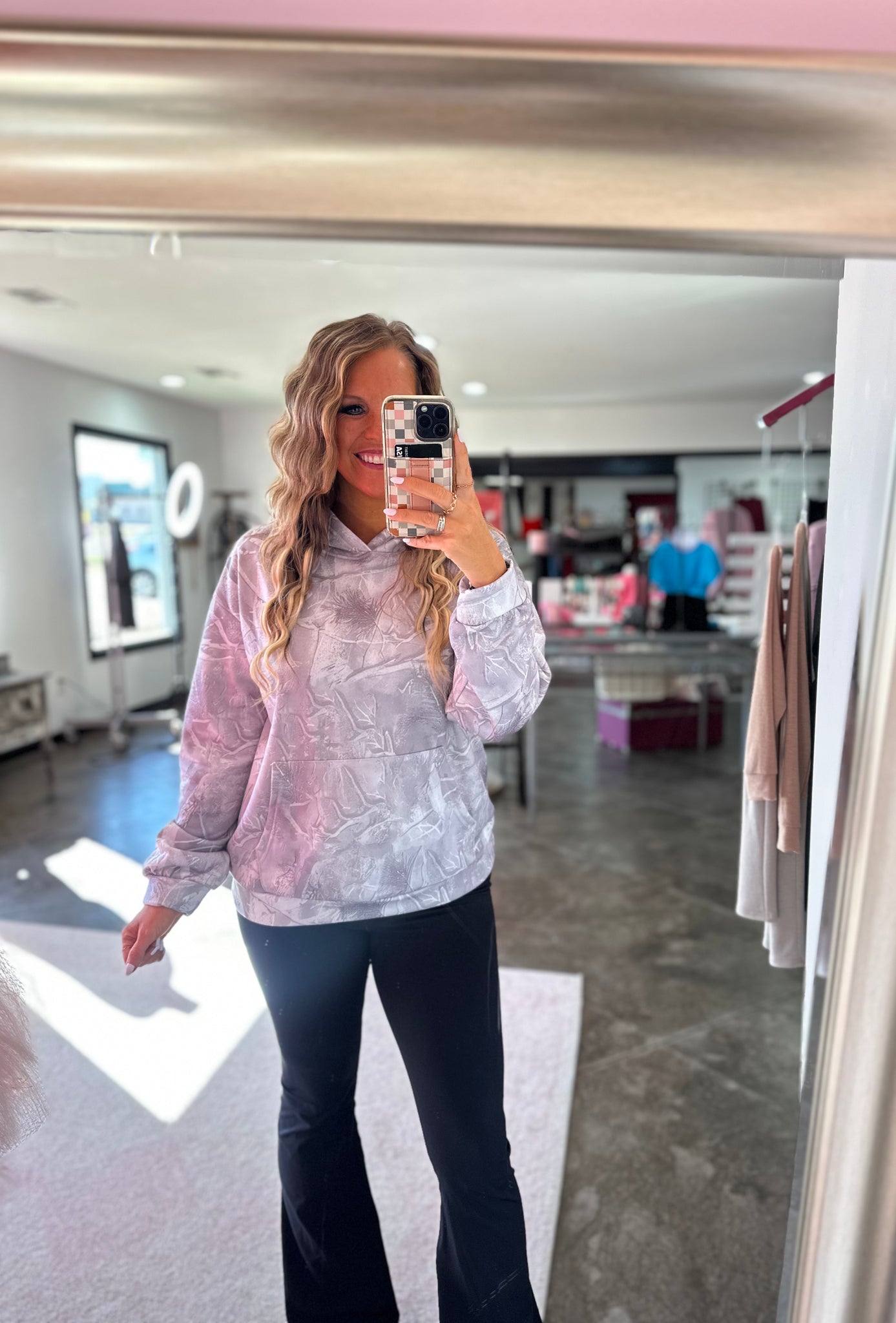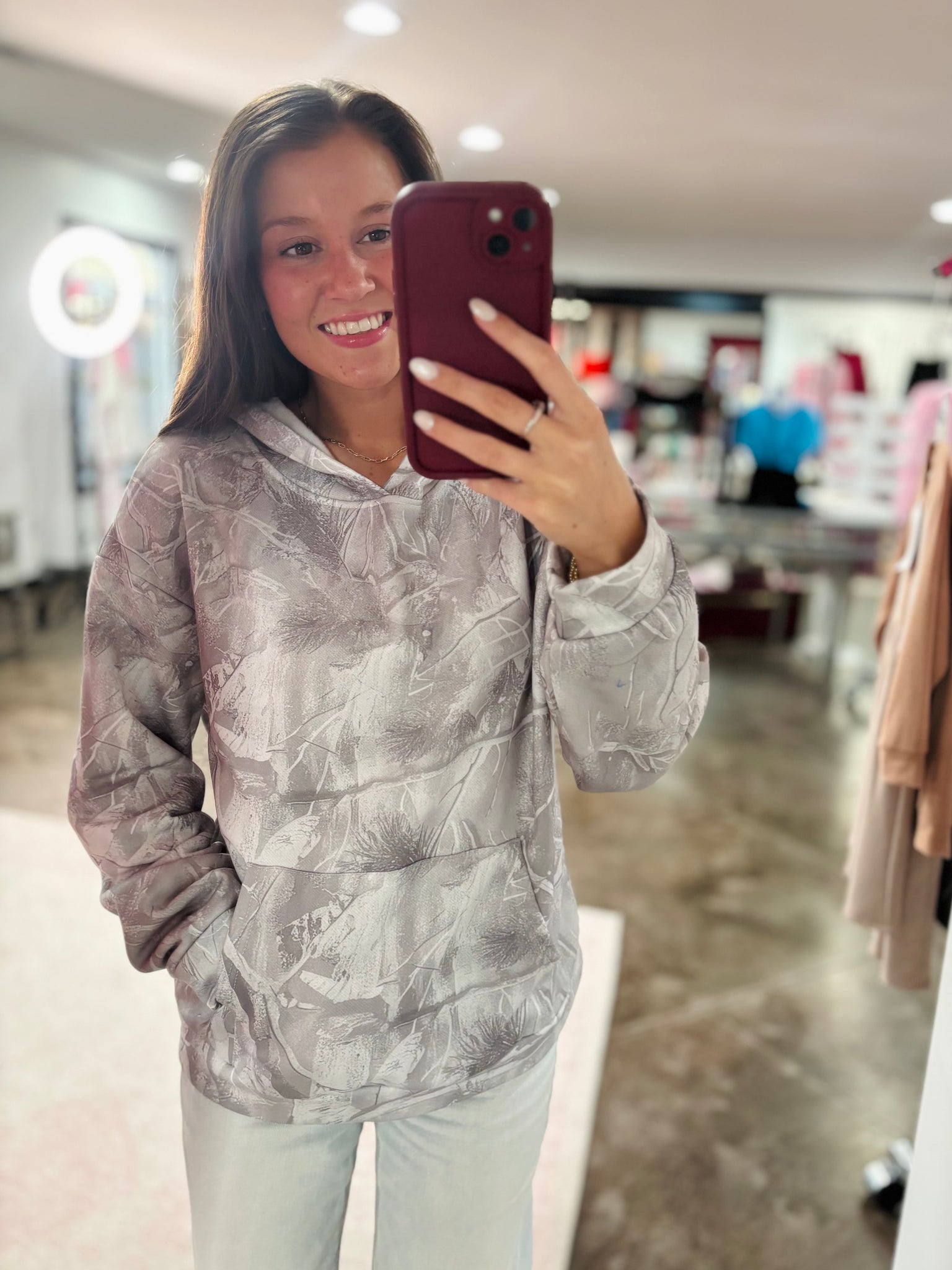Washed, grey camo hoodie with a kangaroo pocket and a true to size fit. This hoodie is nice and cozy with a light fleece lining on the inside.
