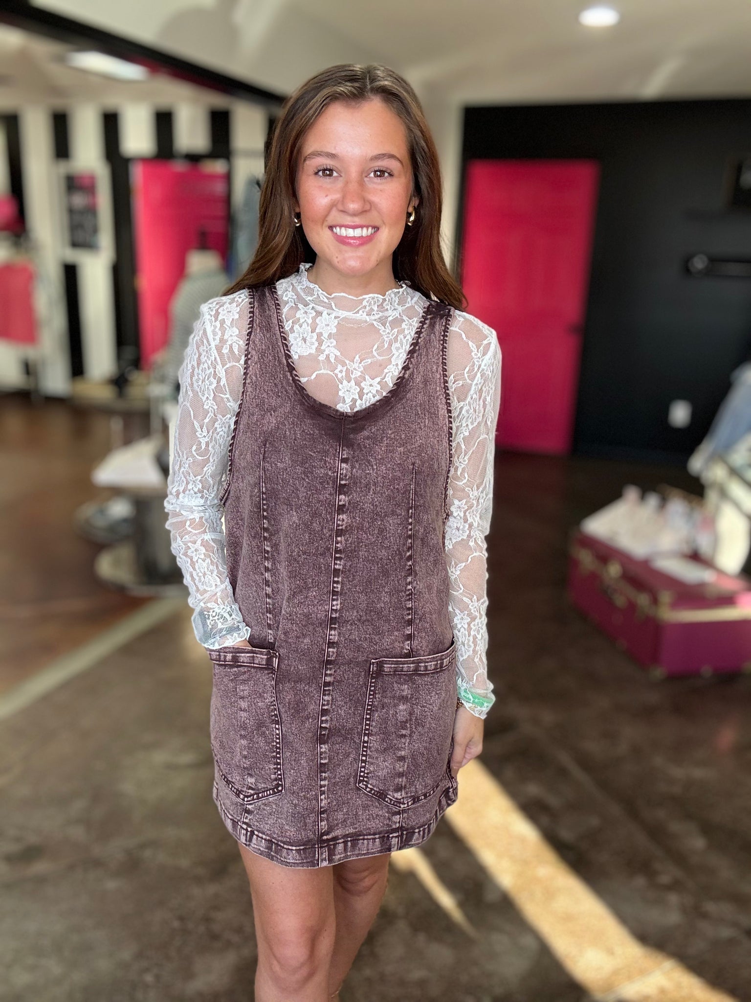 This is a brown vintage washed denim mini dress! This dress has suspenders and a v-neck. This is a fall staple piece!