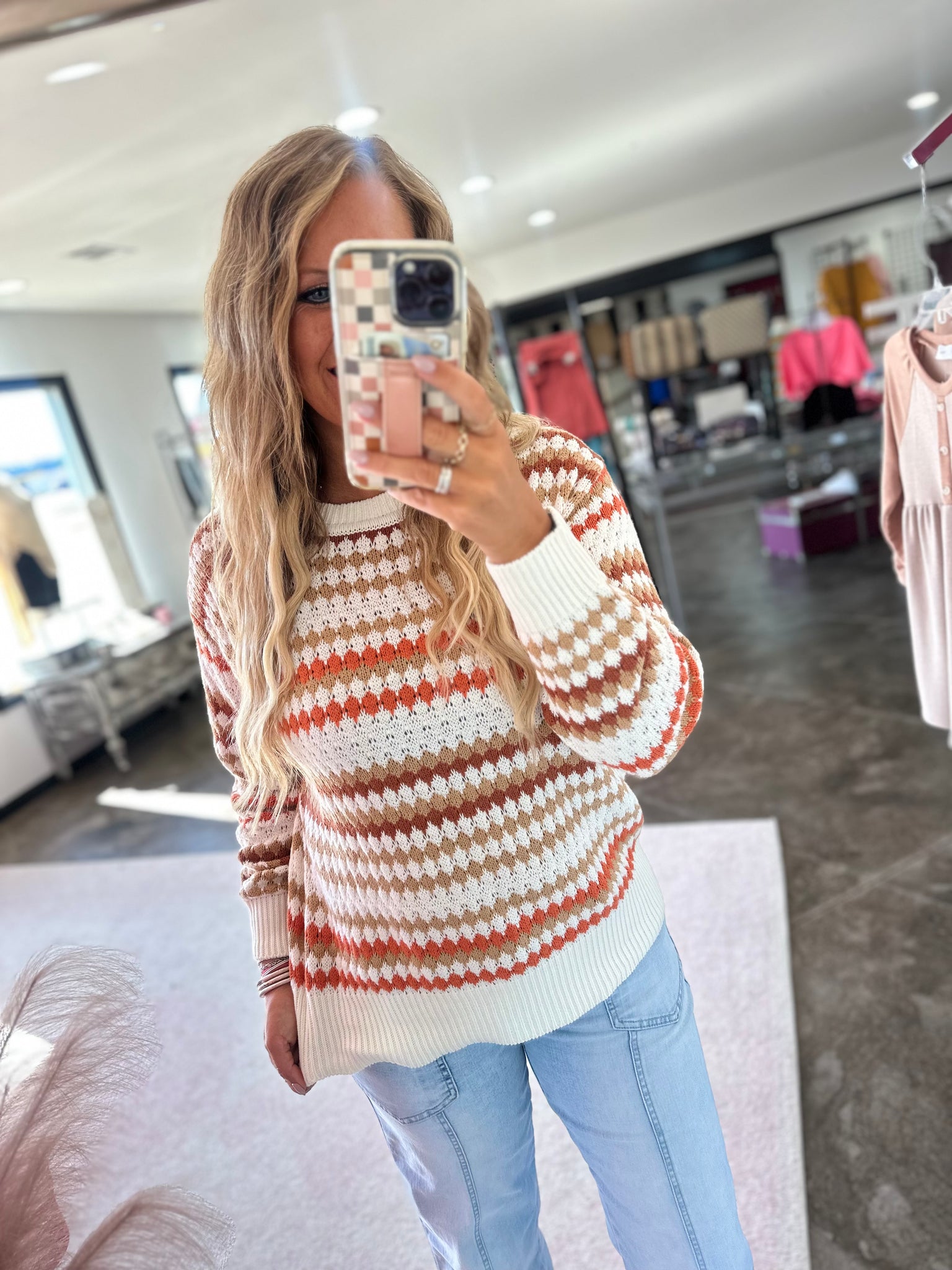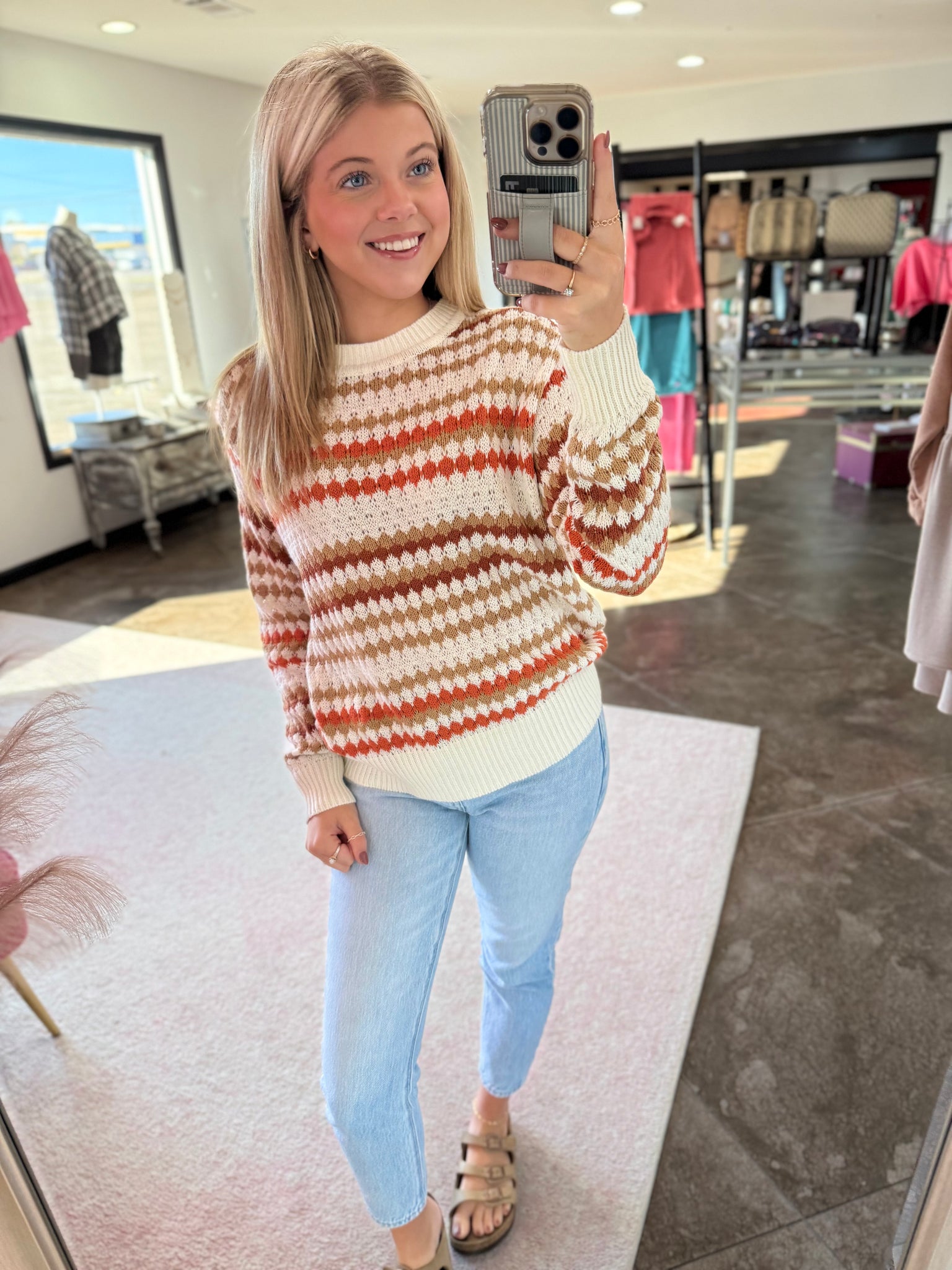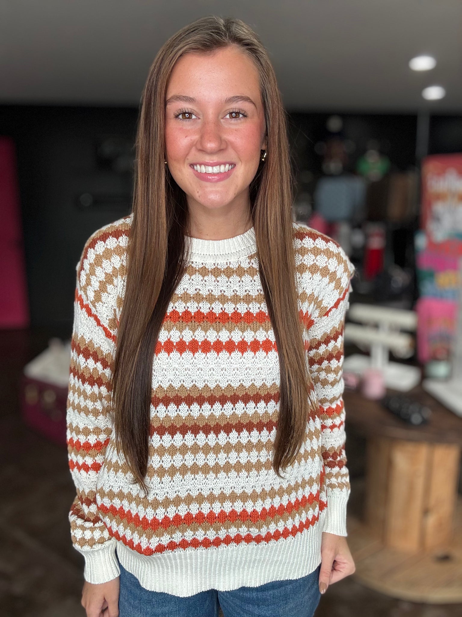 This is a brown and orange eyelet striped top! It has a drop shoulder fit. This is such a good top for the fall season!