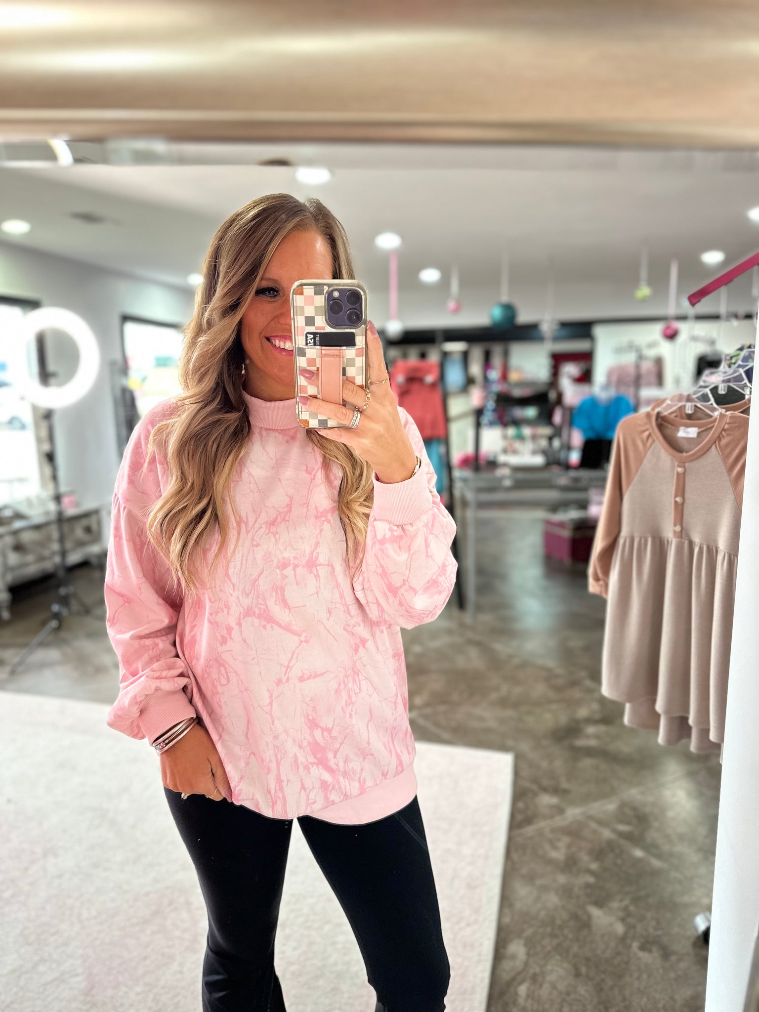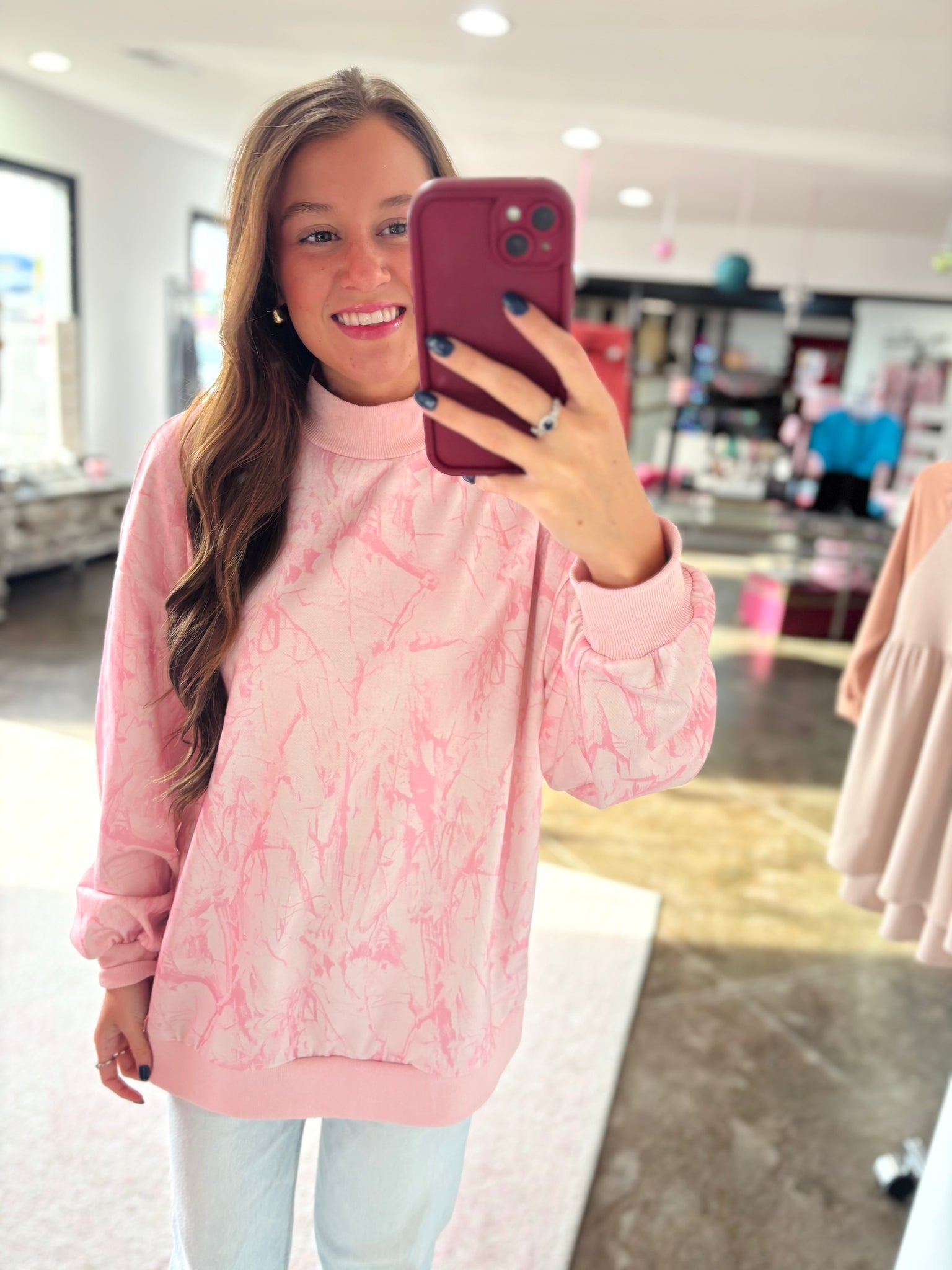 This is a pink camo mock neck sweatshirt! This is such a cute oversized top!
