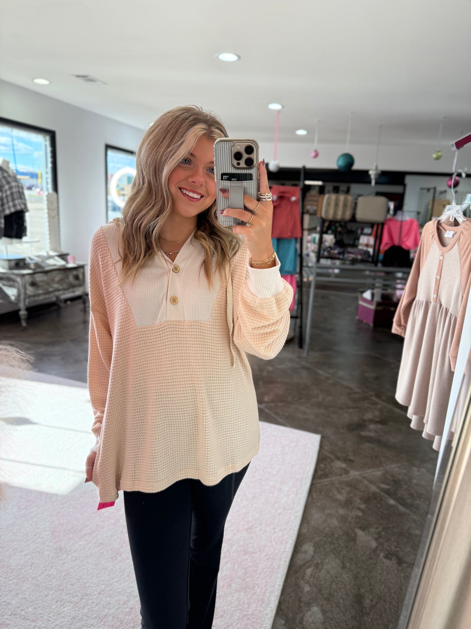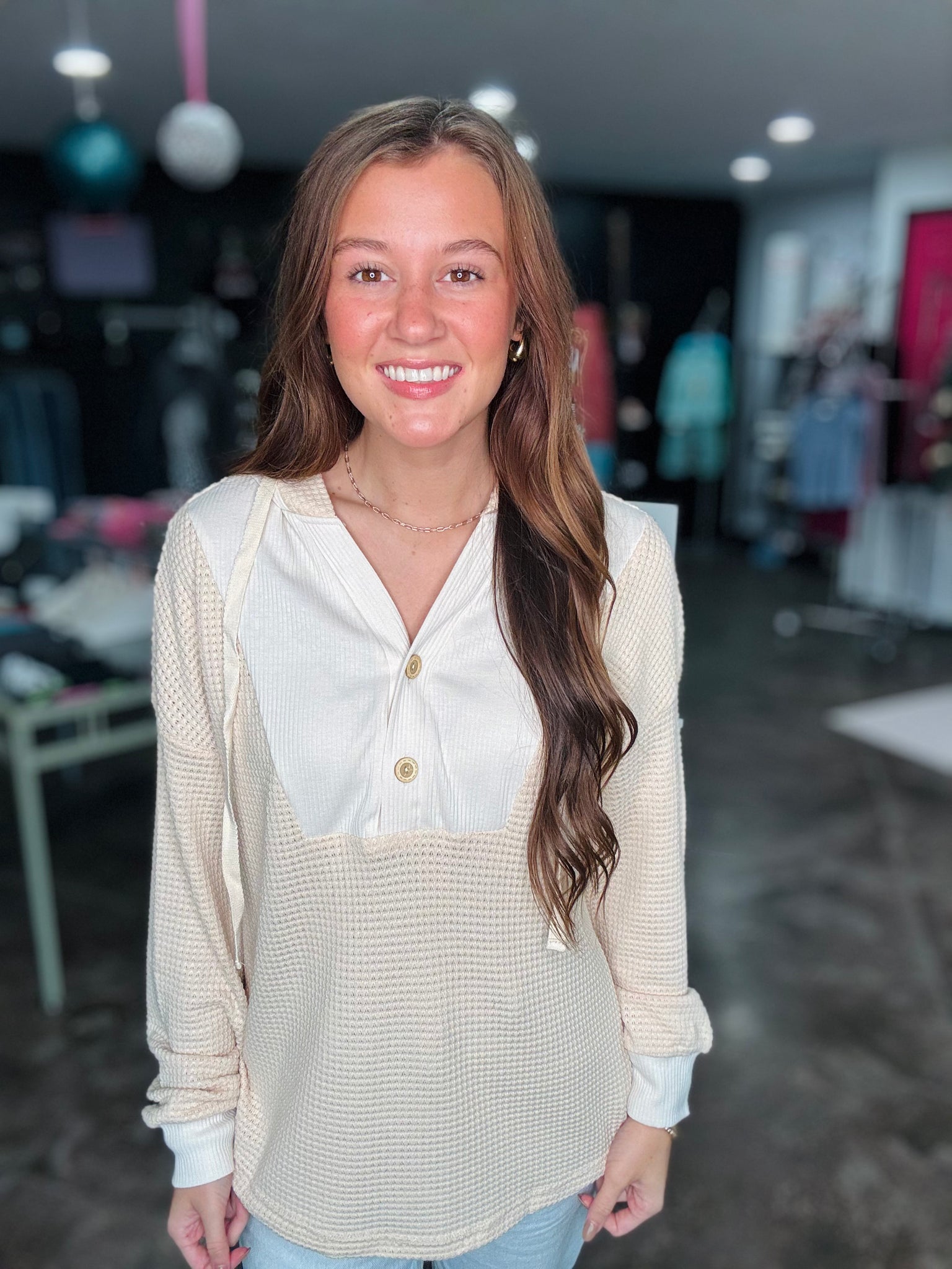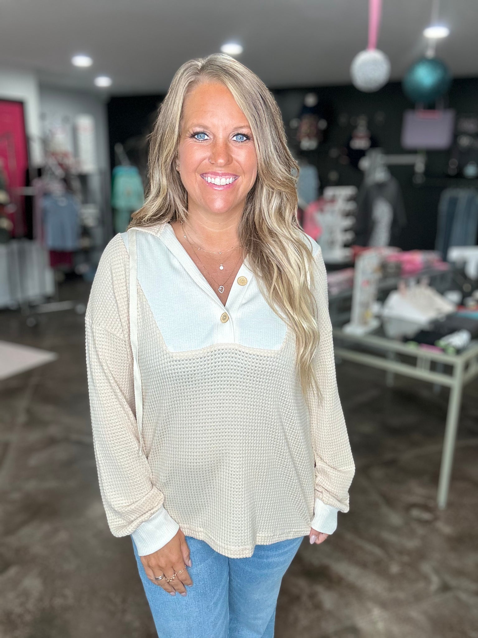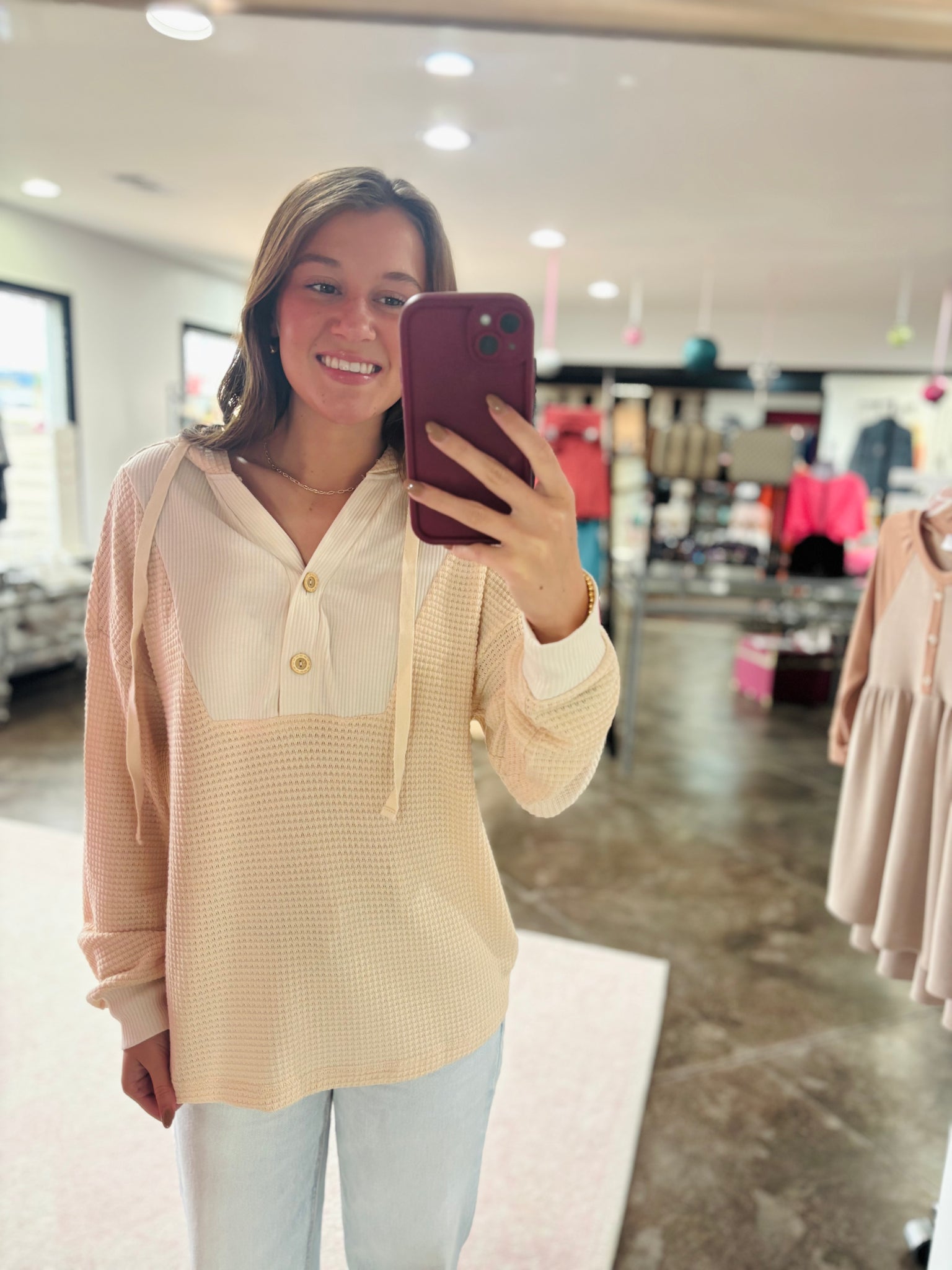 This is an oatmeal colored waffle knit patchwork top. It has a drawstring hoodie and a drop shoulder fit. This is the perfect long sleeve top!
