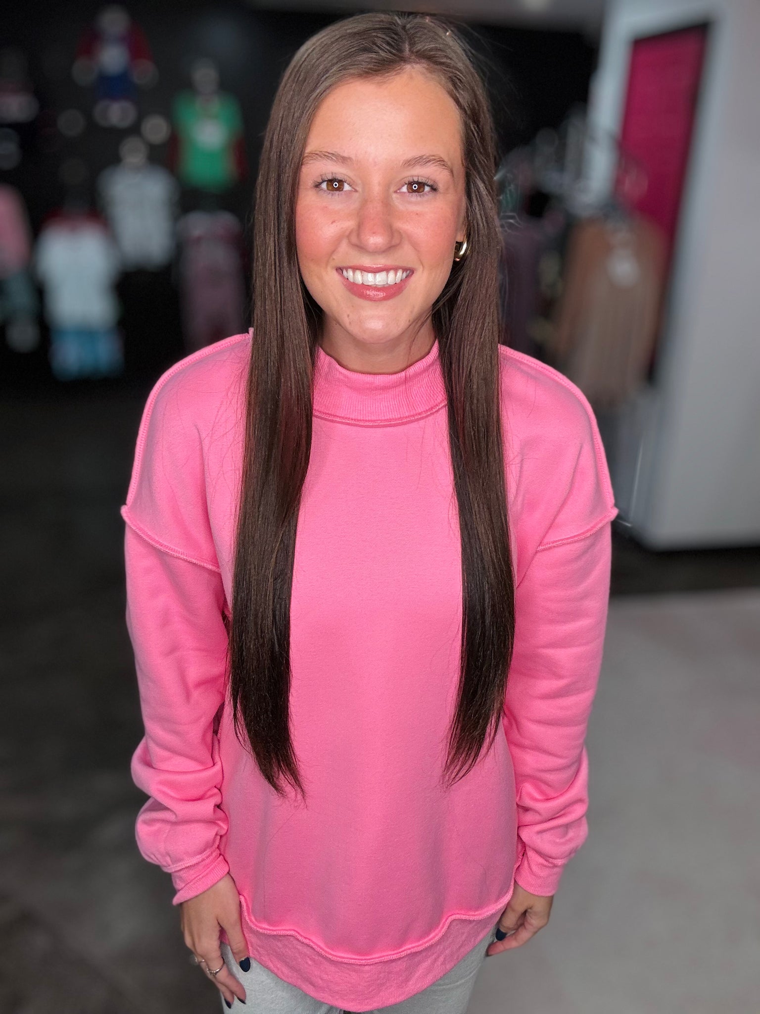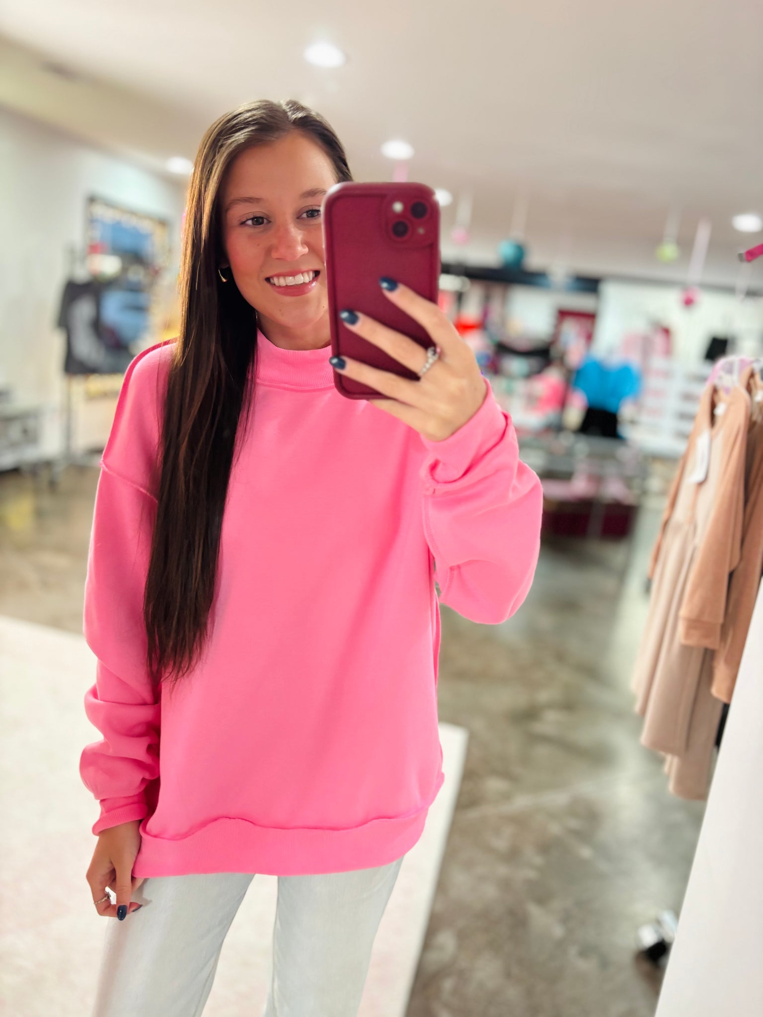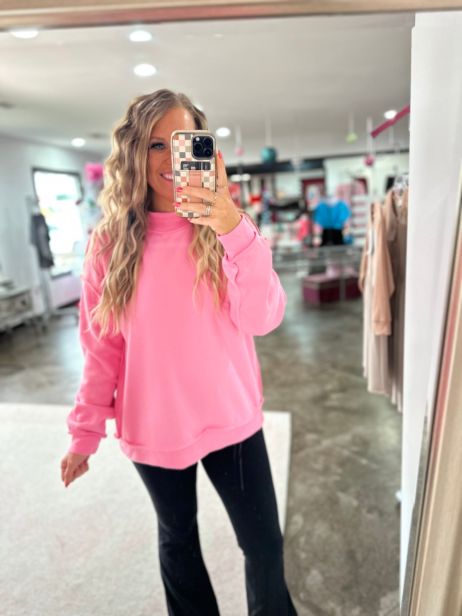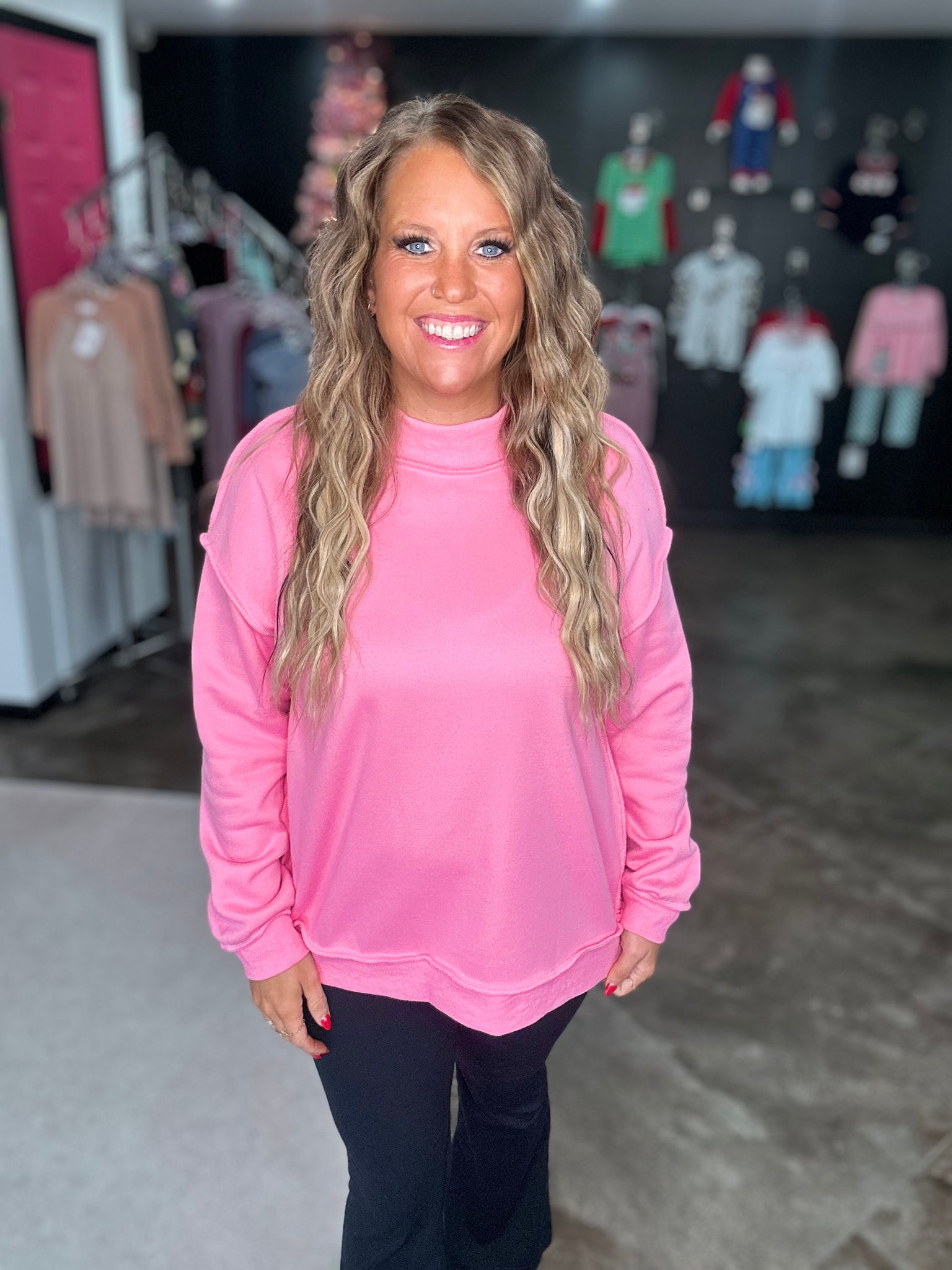 This is a solid bright pink mock neck sweatshirt! This is a reversible top with a drop shoulder fit! This top is perfection!