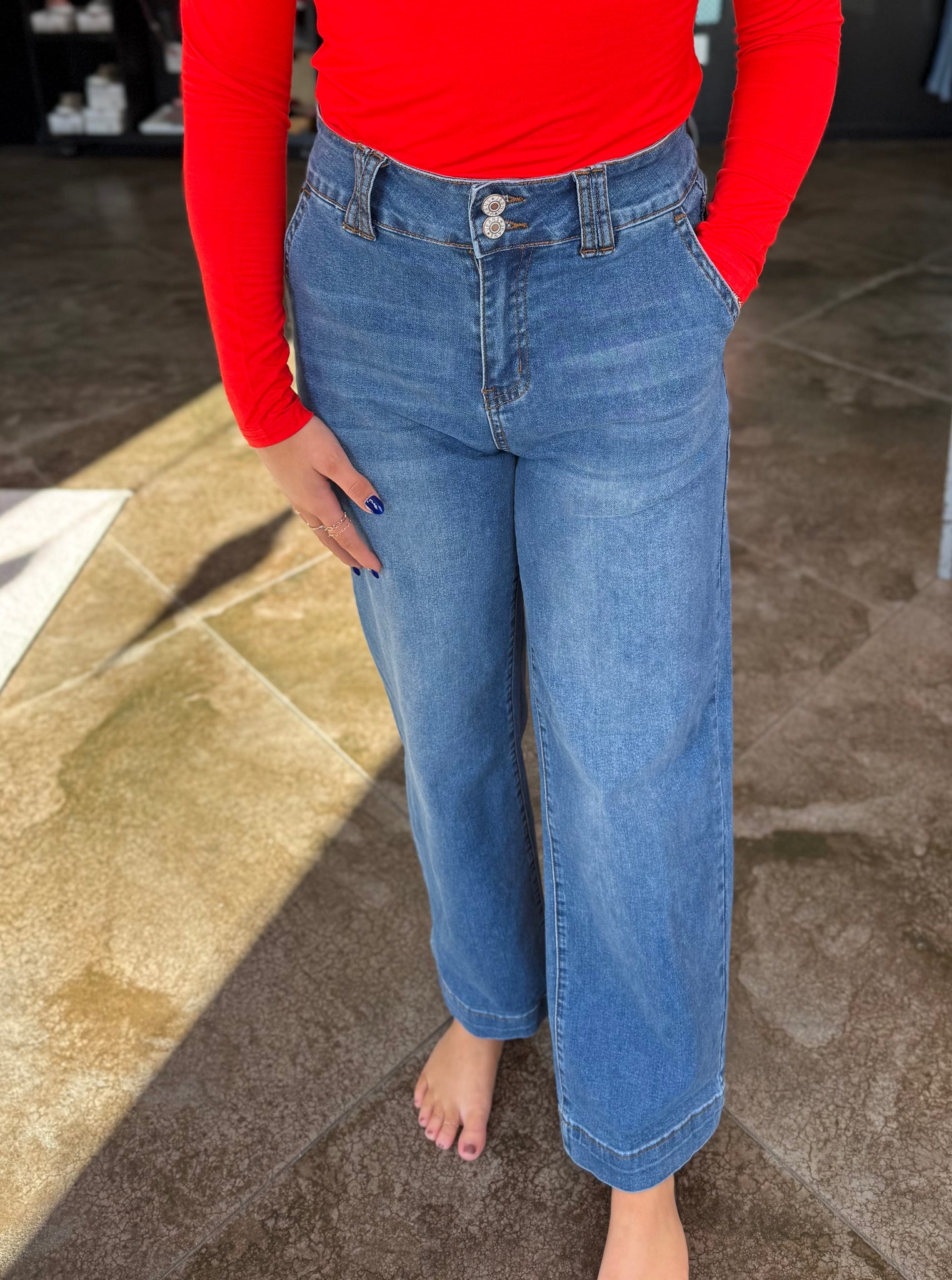 These are medium wash double button hight waisted jeans. These are a straight leg style jeans! You can't live without these jeans!