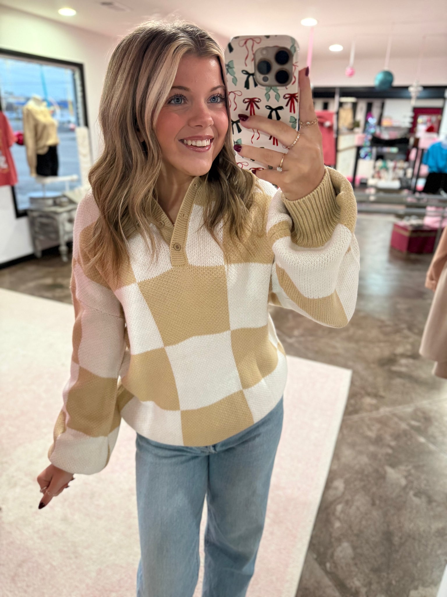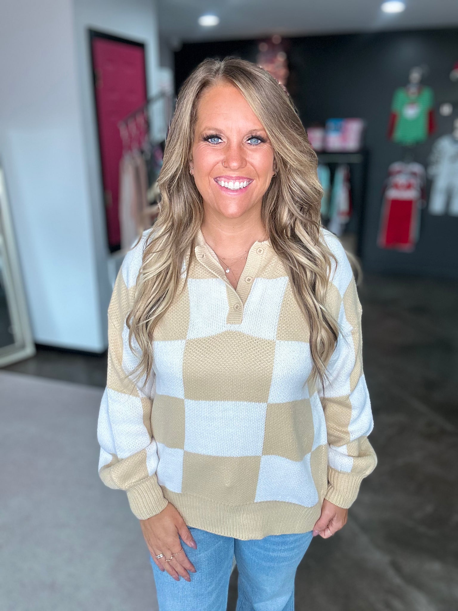 This is a light beige checkered sweater. It has a button up collar and the perfect cozy fit. Go ahead and add this beauty to your closet!