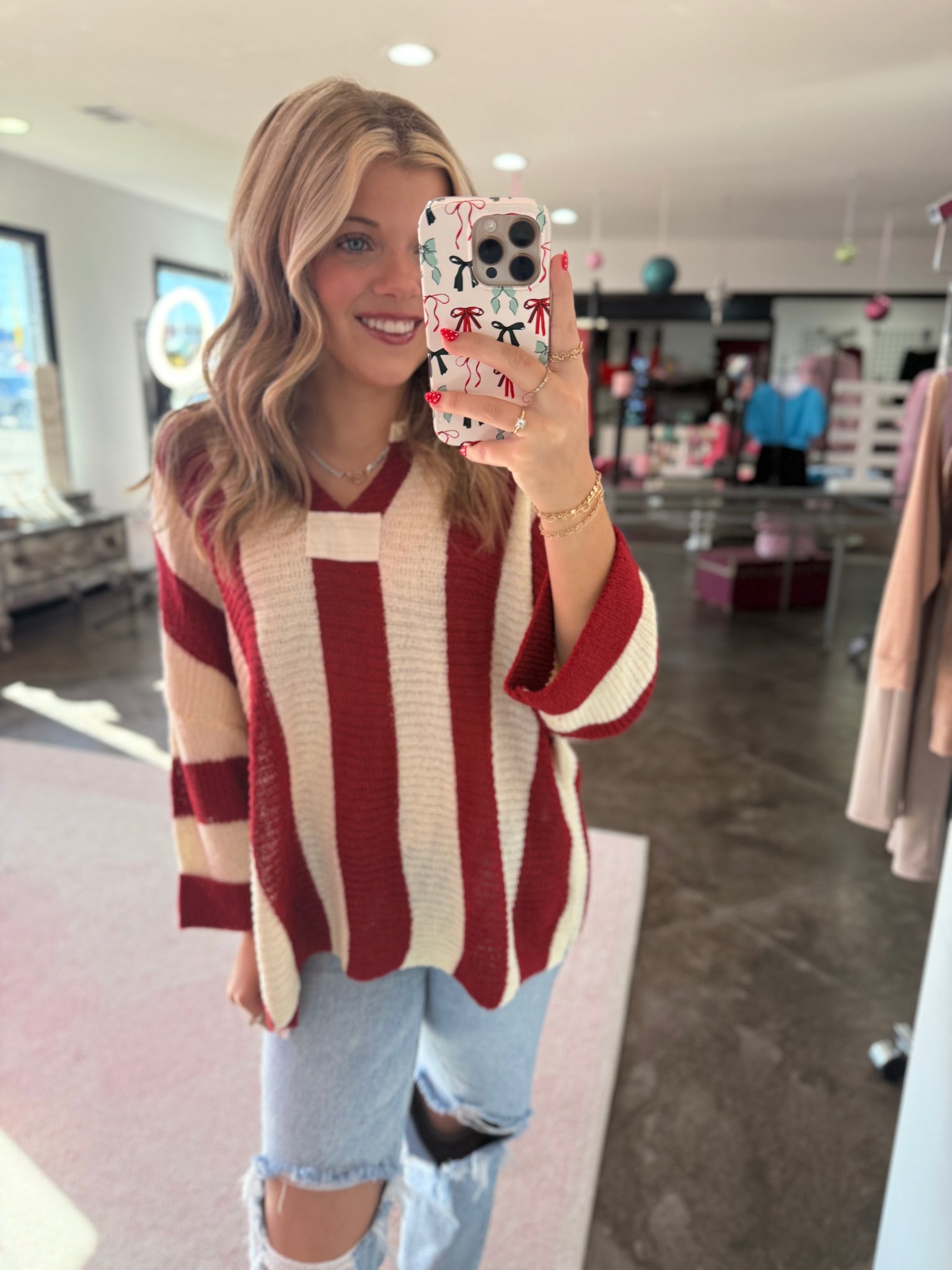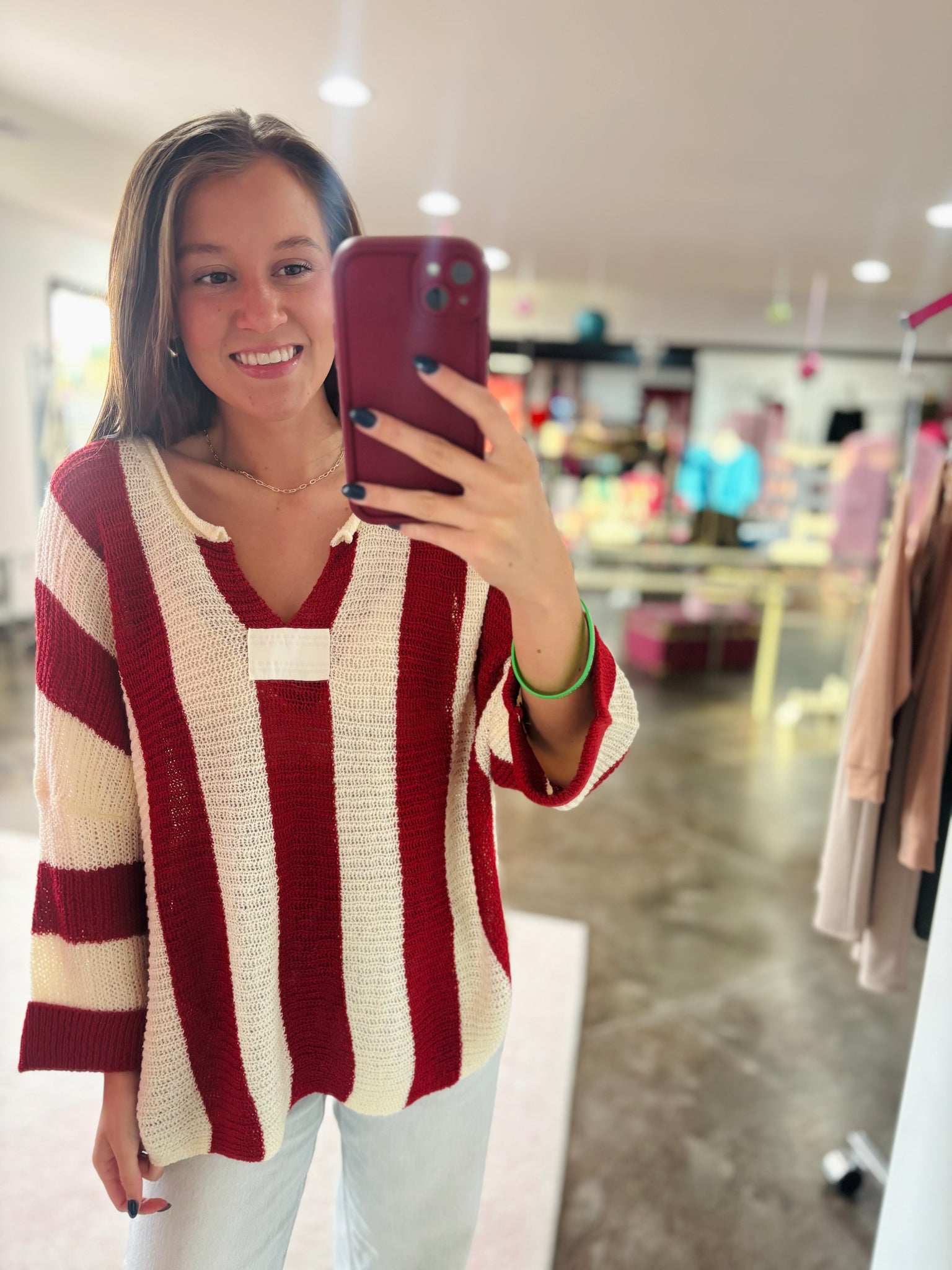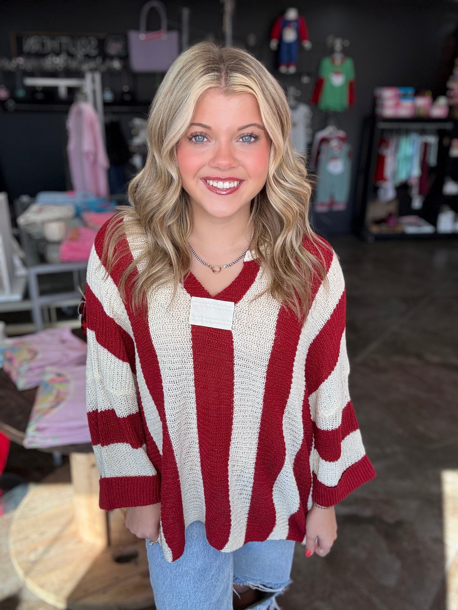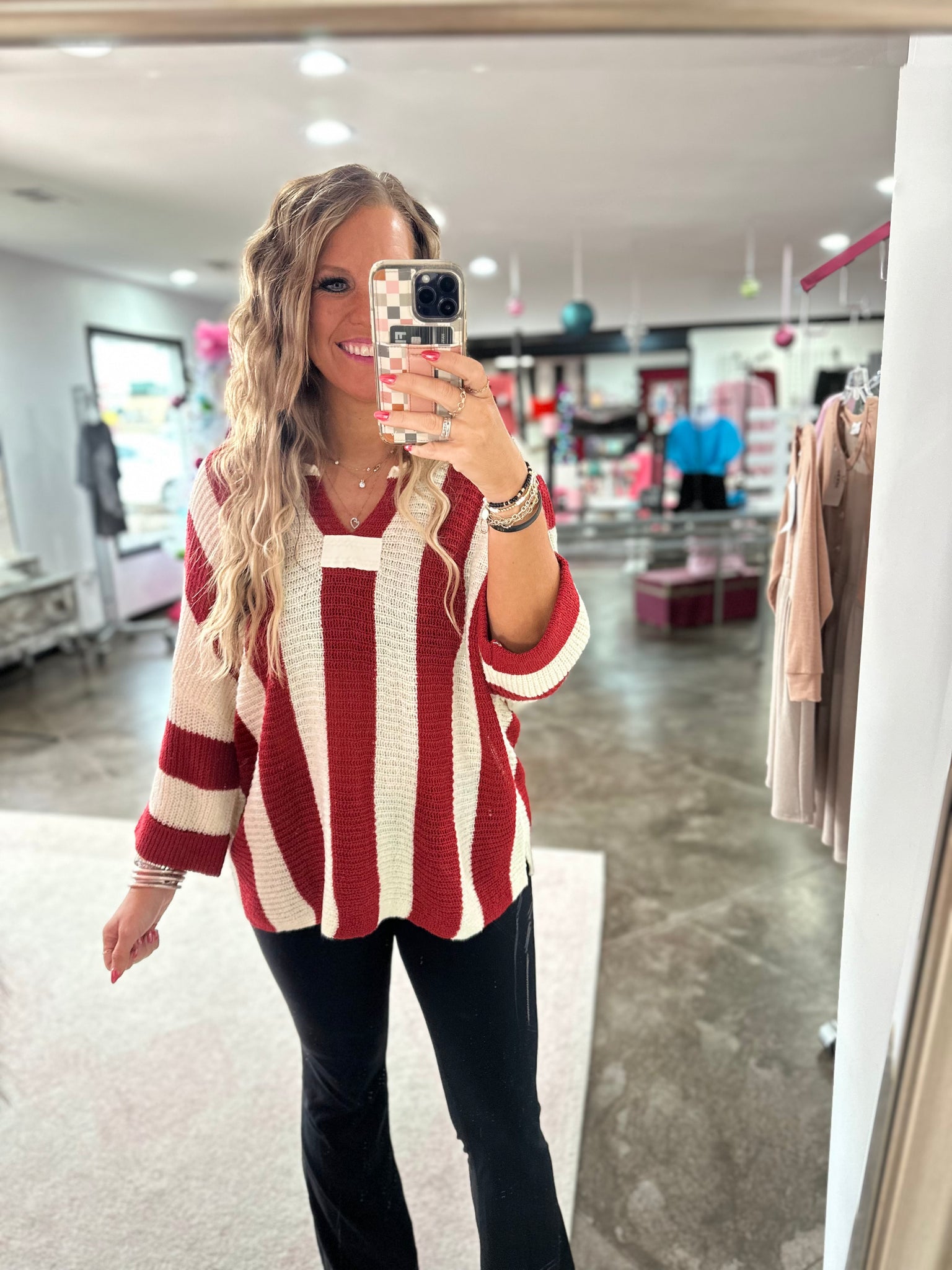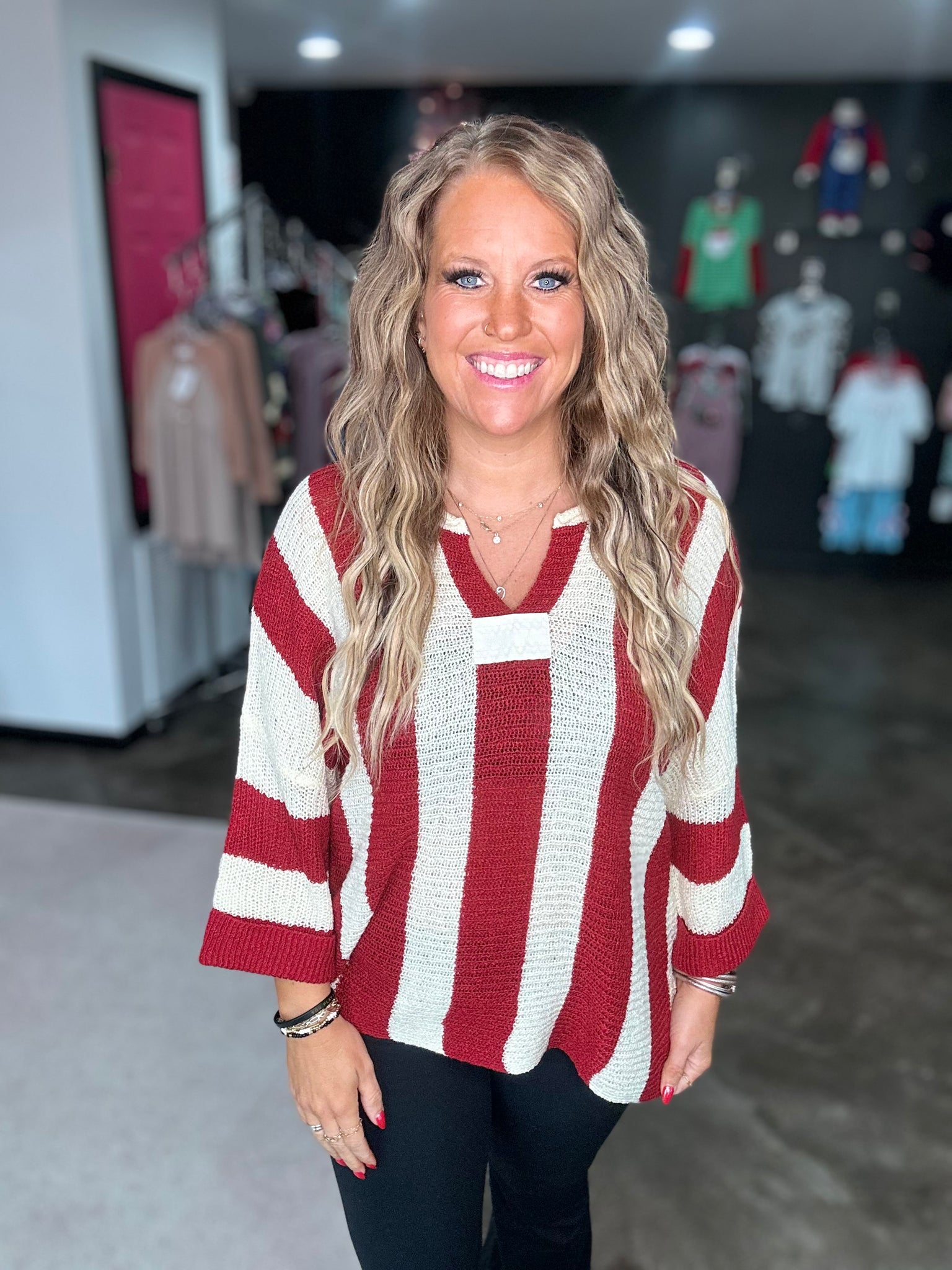 This is a red striped color block top. It is made of a textured fabric that adds the perfect touch! It also has bracelet sleeves and a v-neck! This one is just too cute!