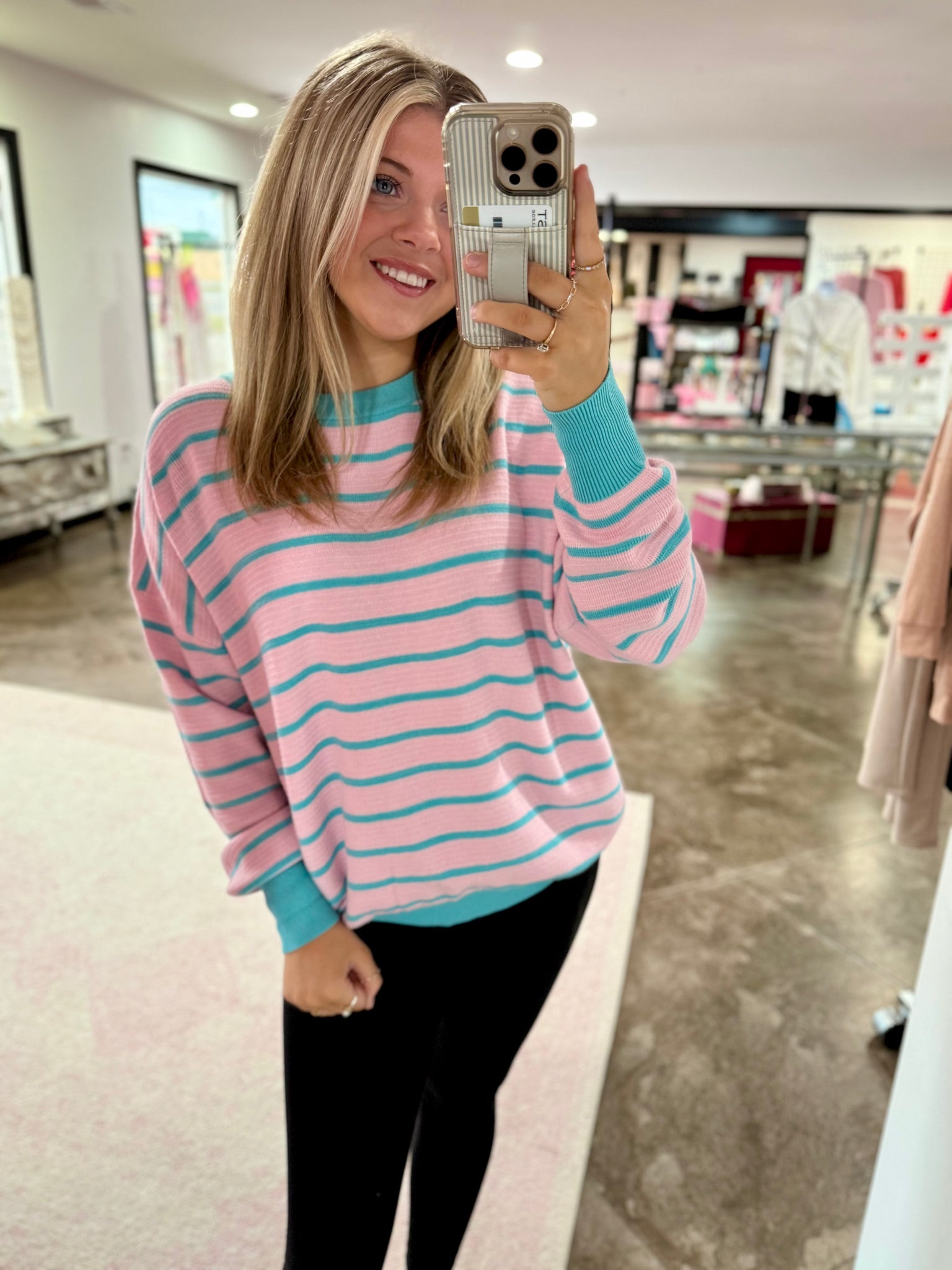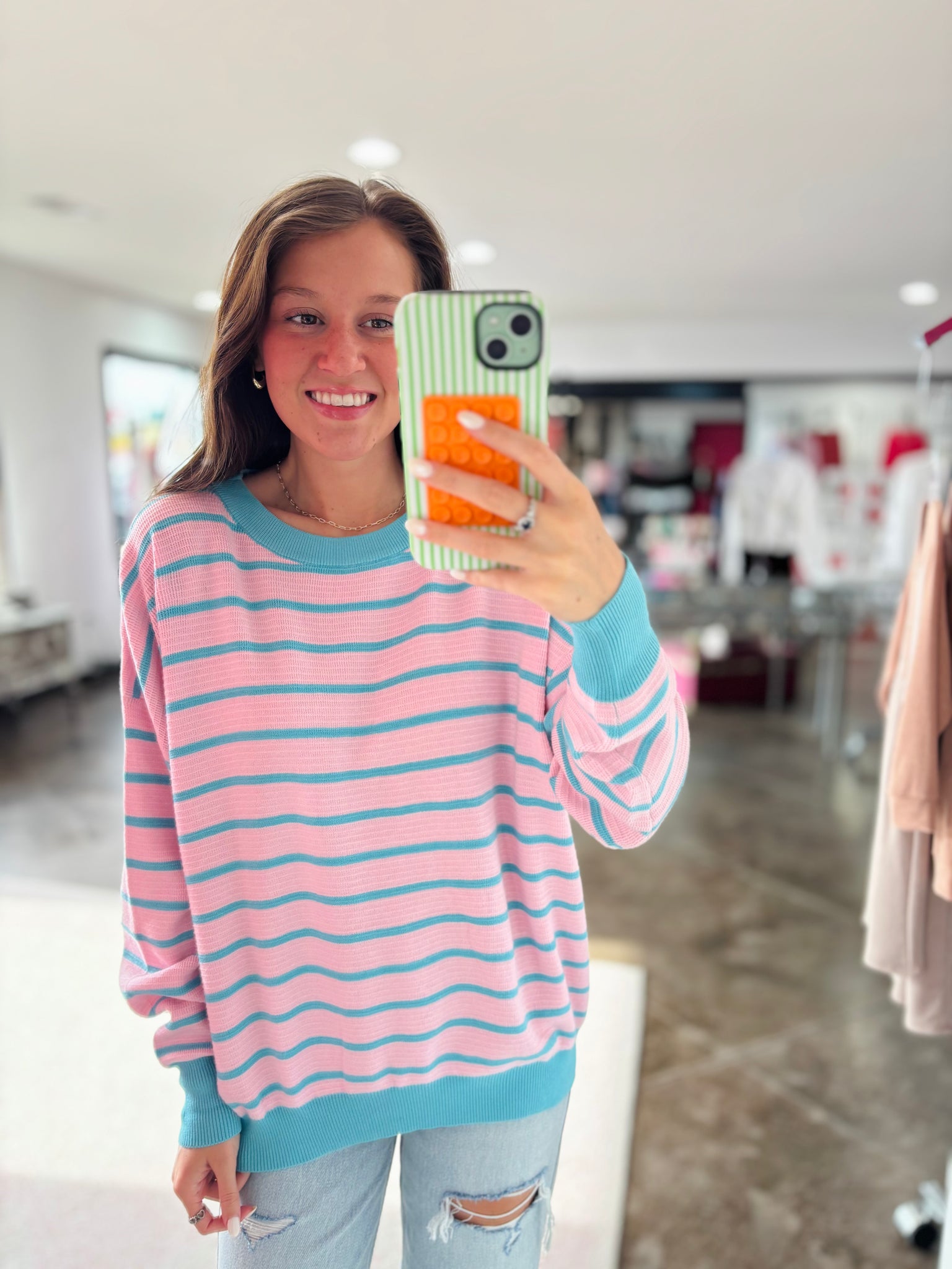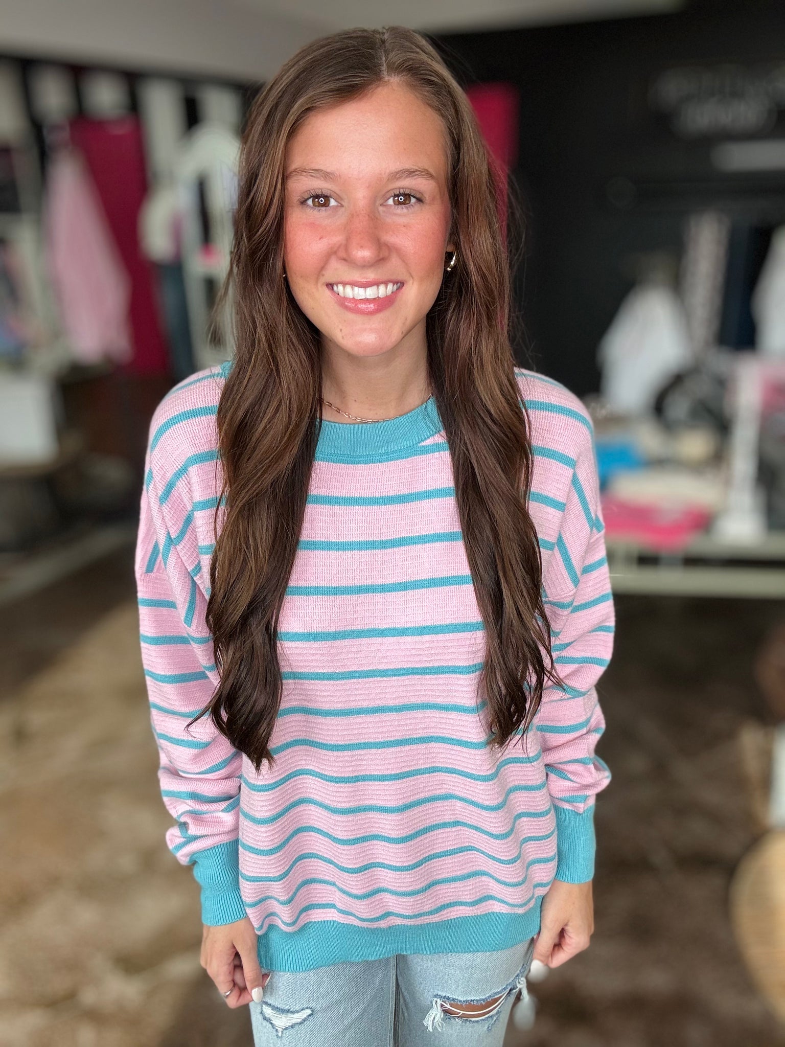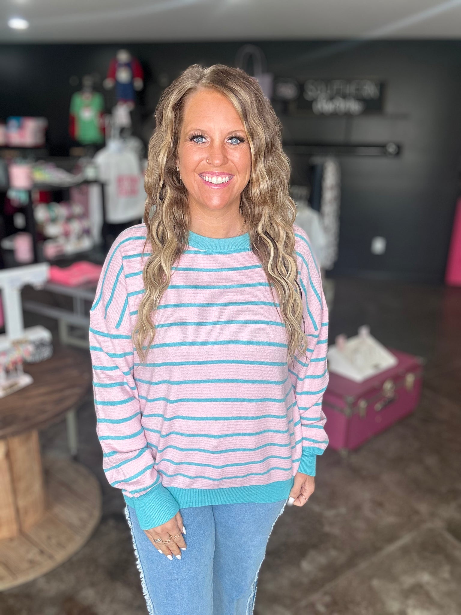 This pink and teal, light weight sweater is the cutest transition piece. It has a raw hemline with a round neckline and a drop shoulder. You will fall inlove with the happy colors in this top.