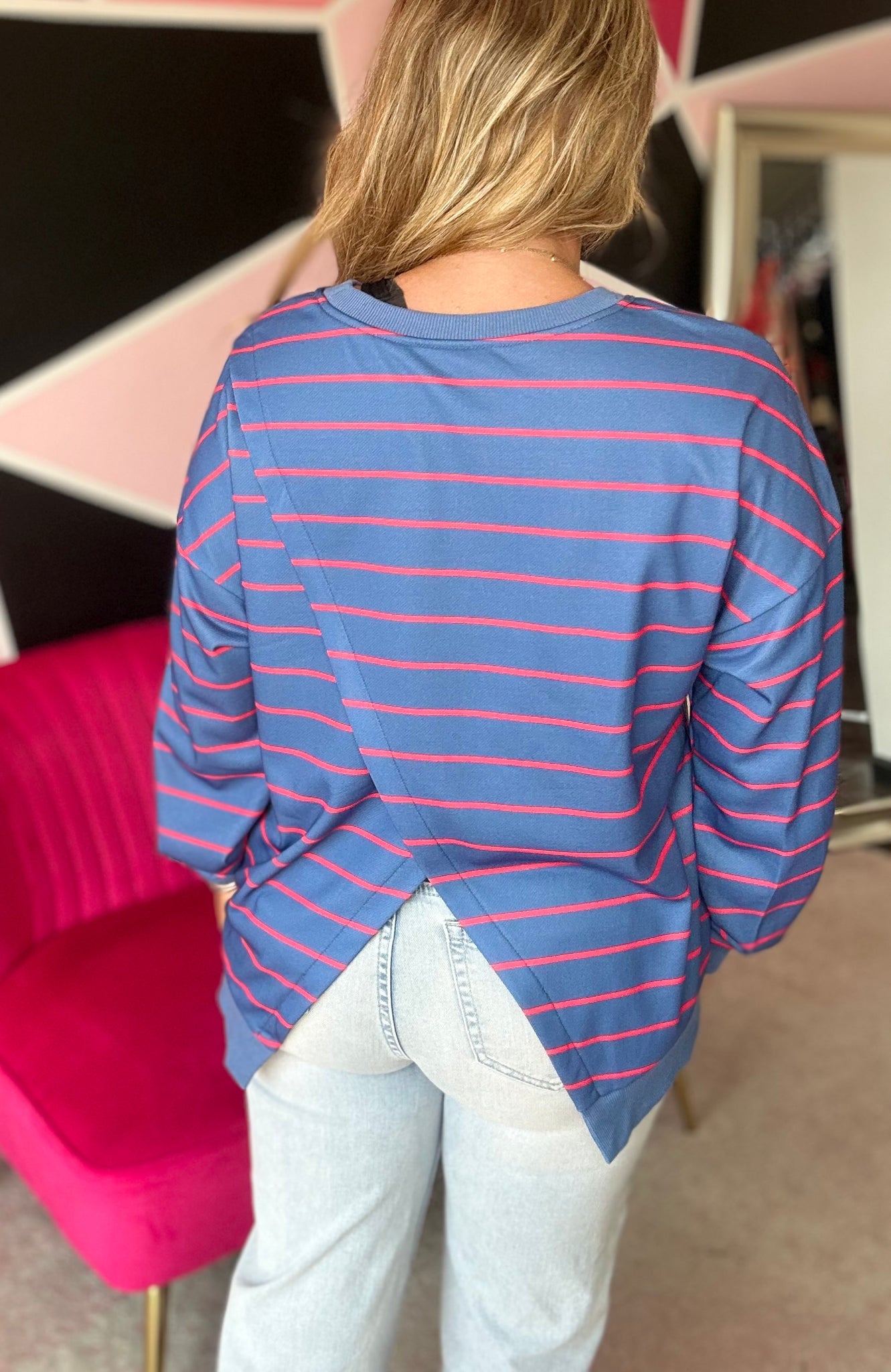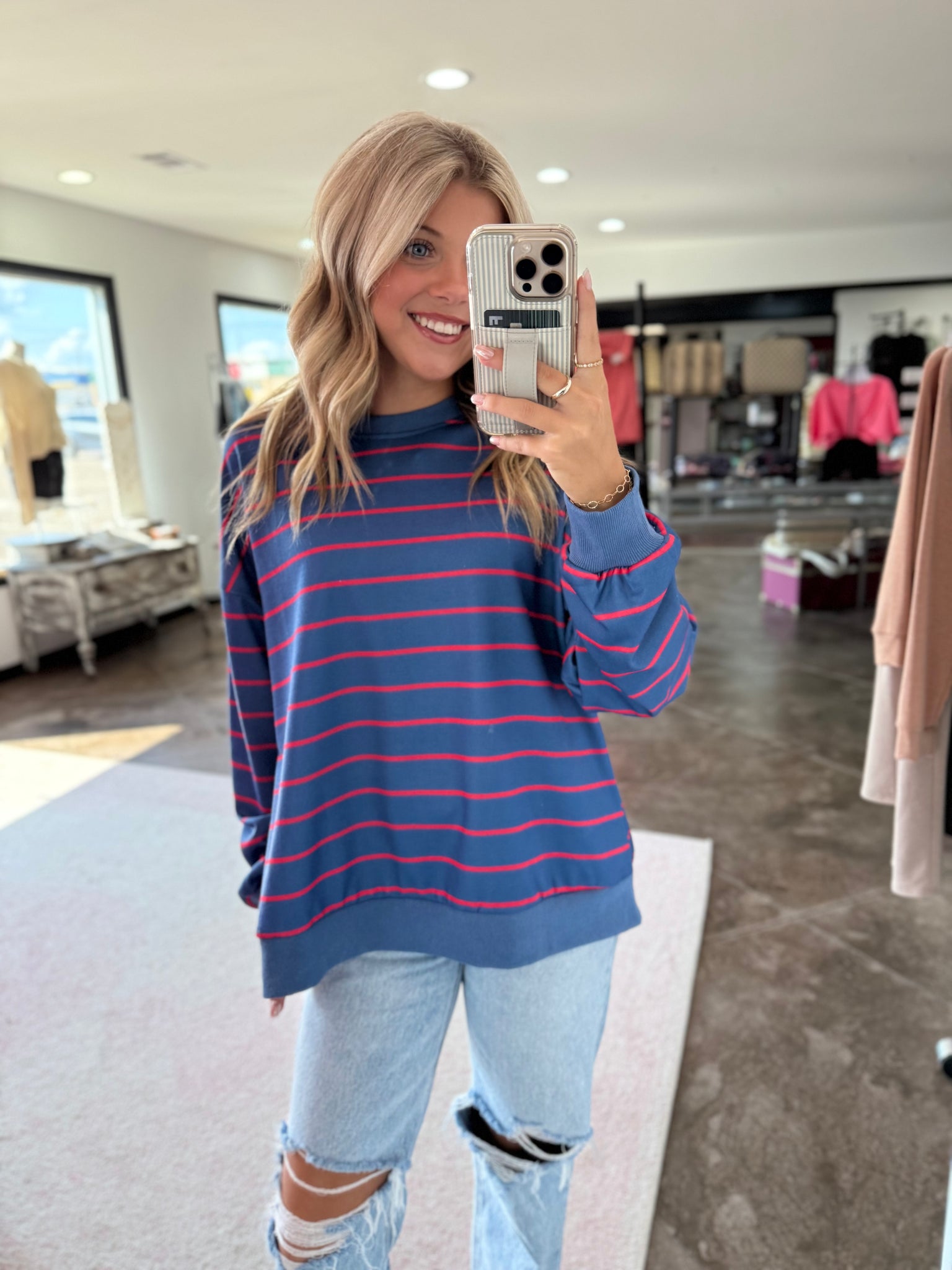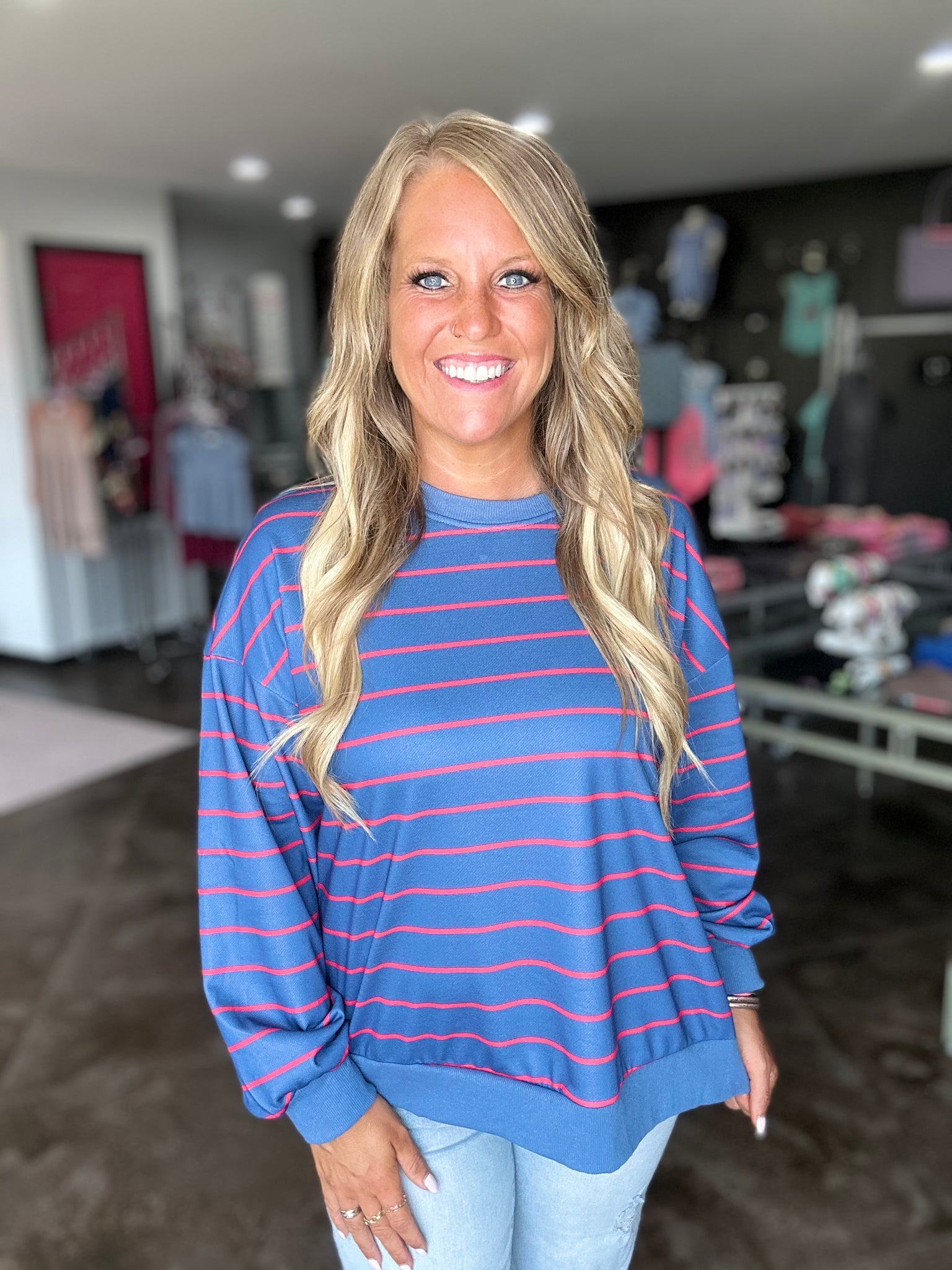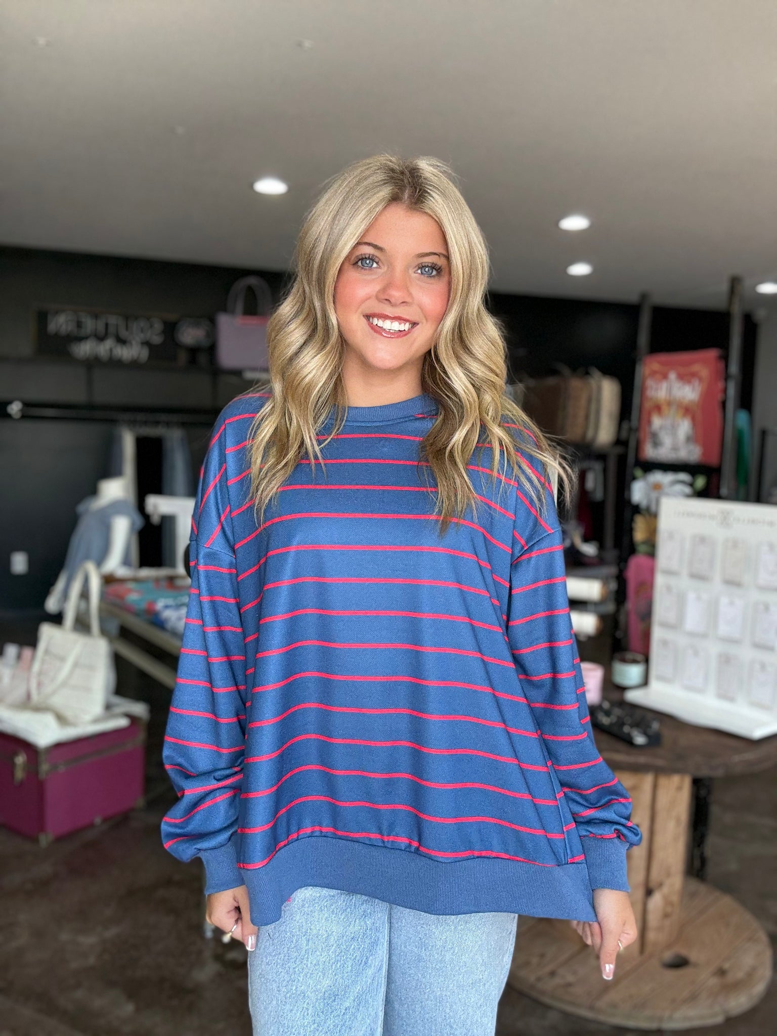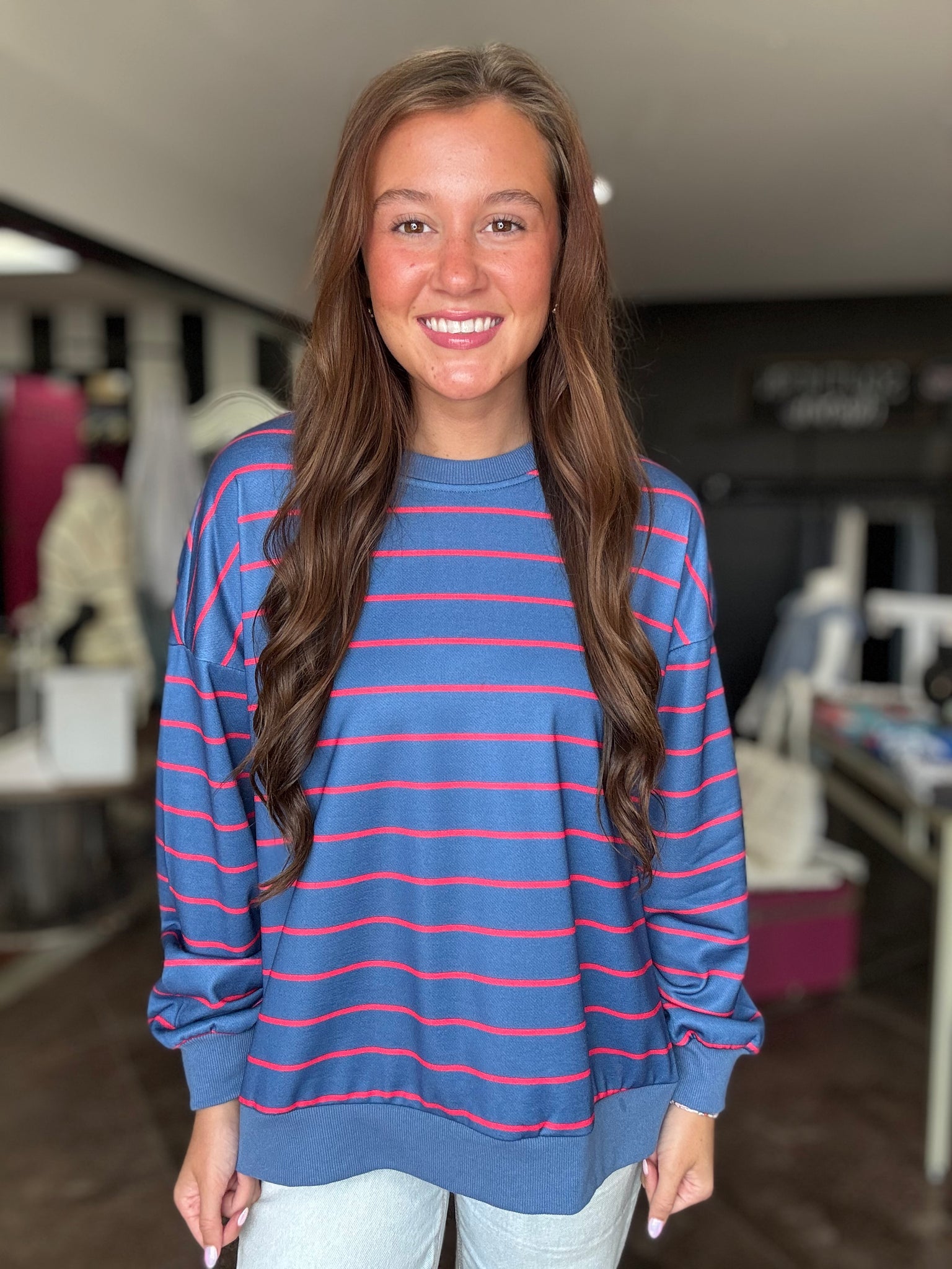 This is a navy blue long sleeve top with thin red stripe detailing! It has a drop shoulder fit and an overlay design on the back. This top is a must have for game days!