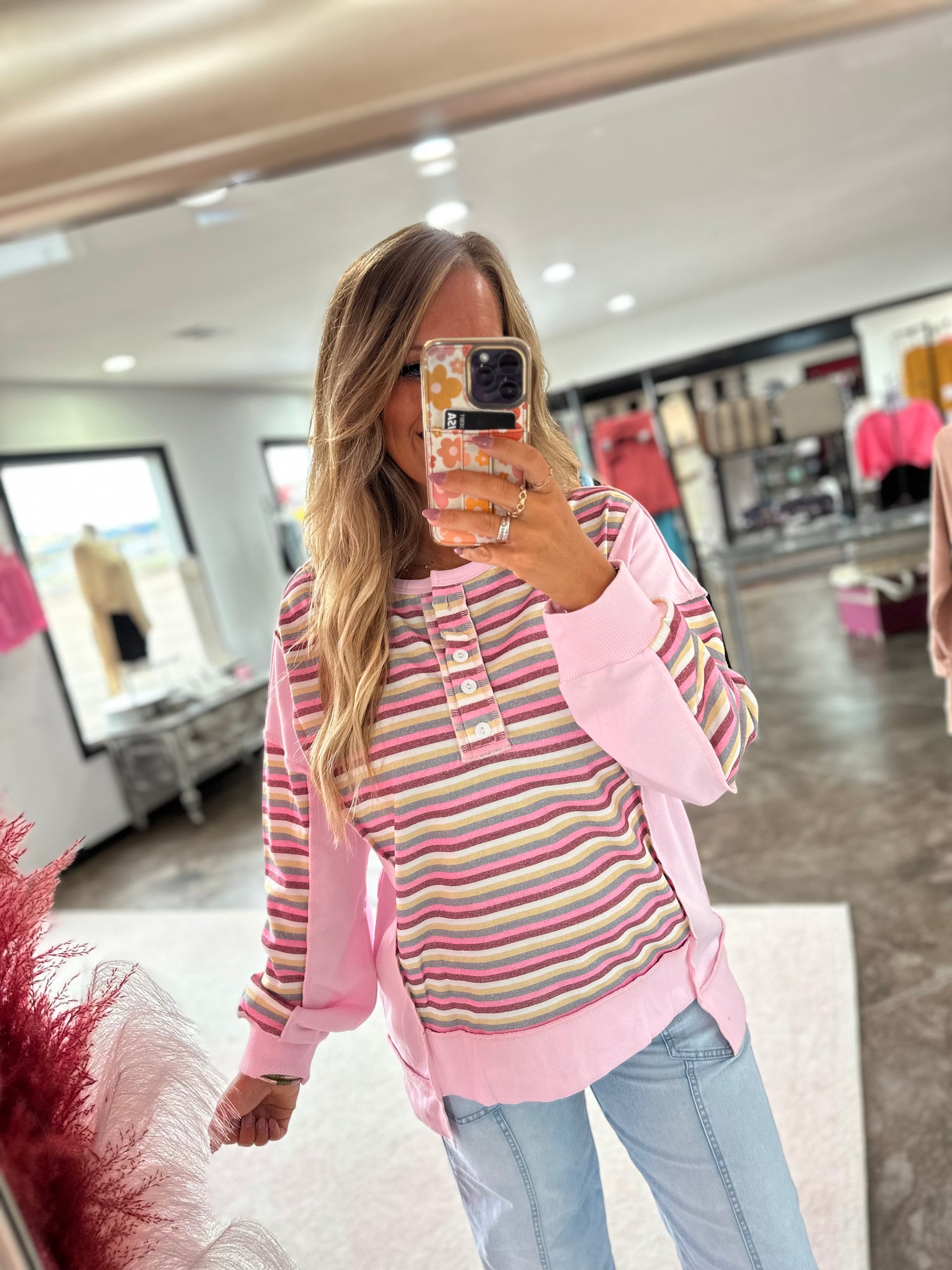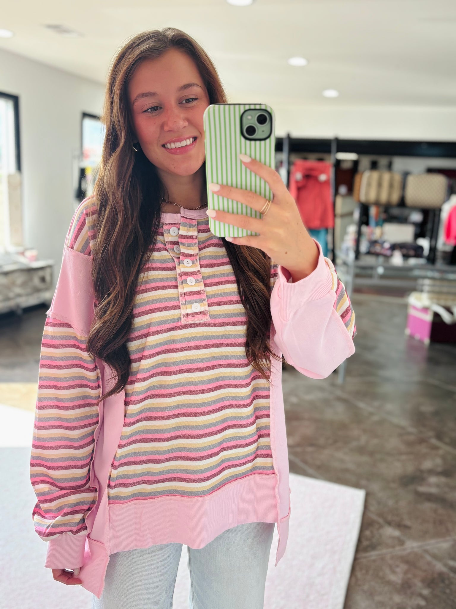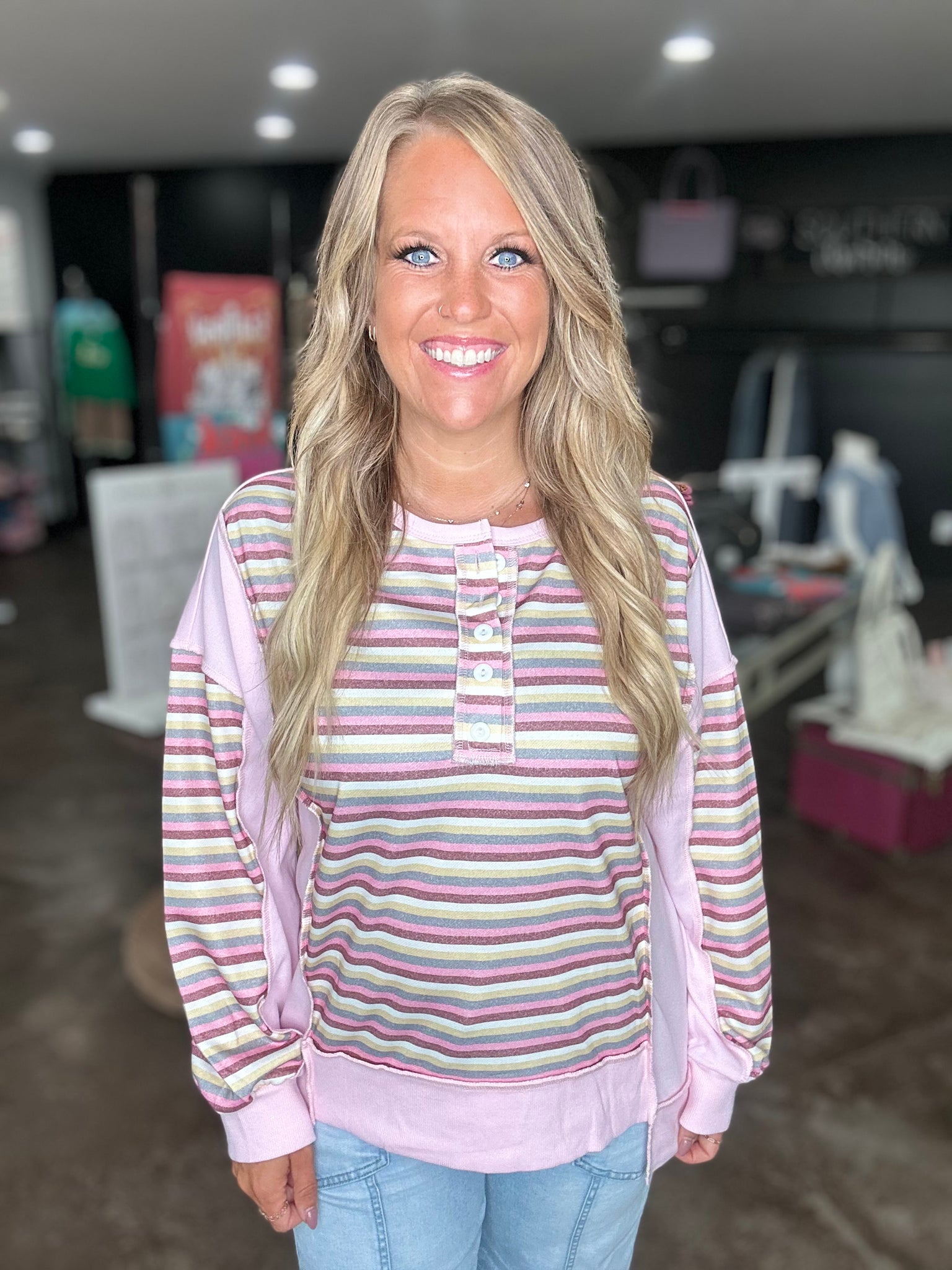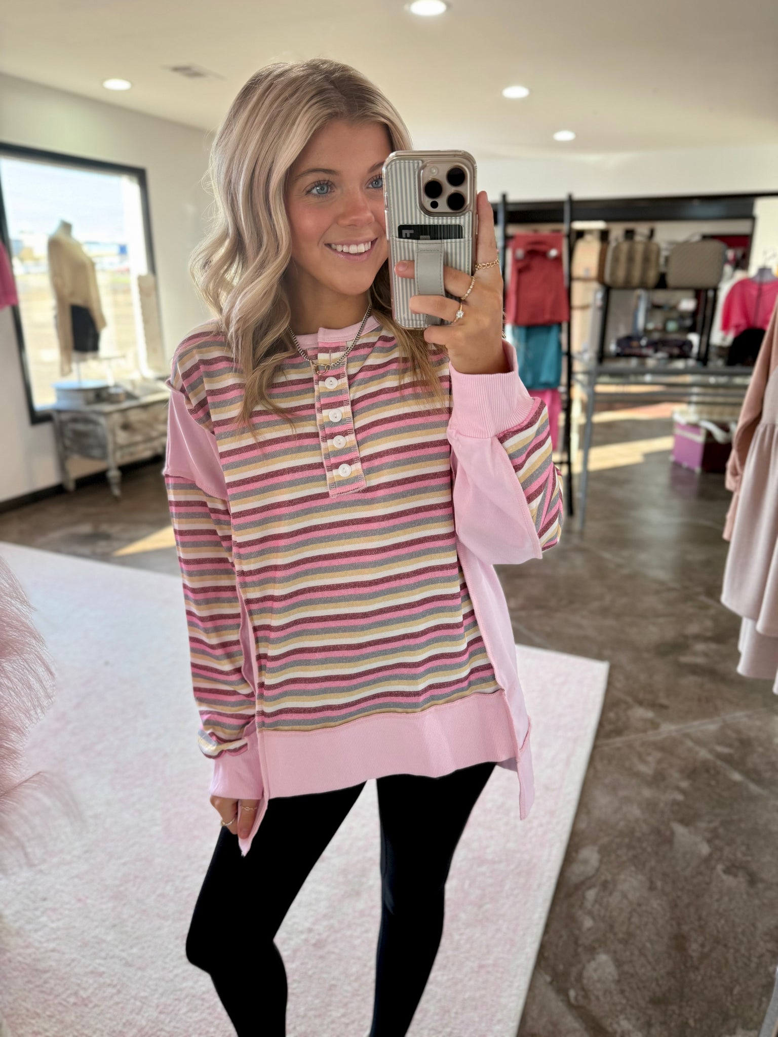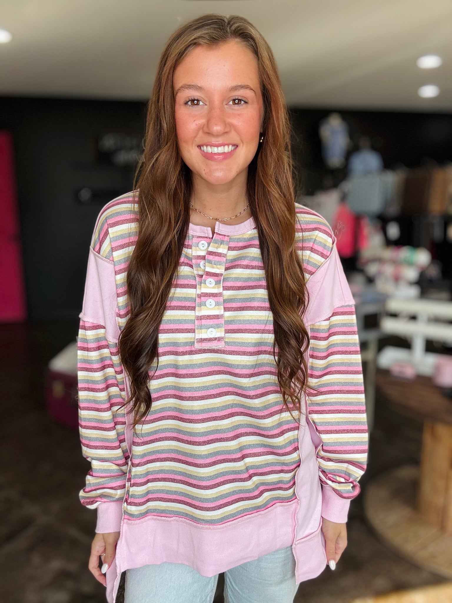 This is a pink and stripes color block top. It is a henley style top and has exposed seams. The button up detailing is too cute!