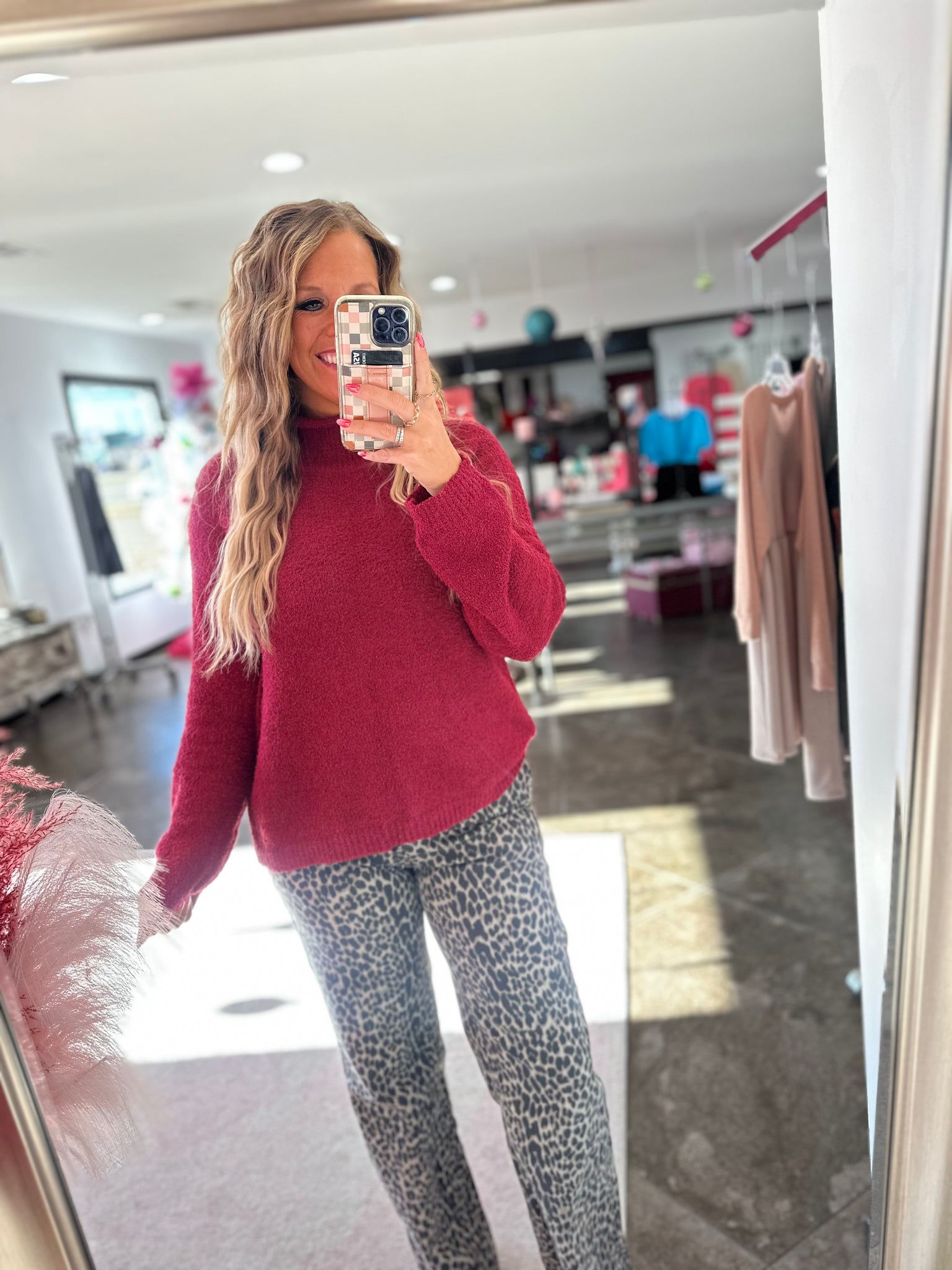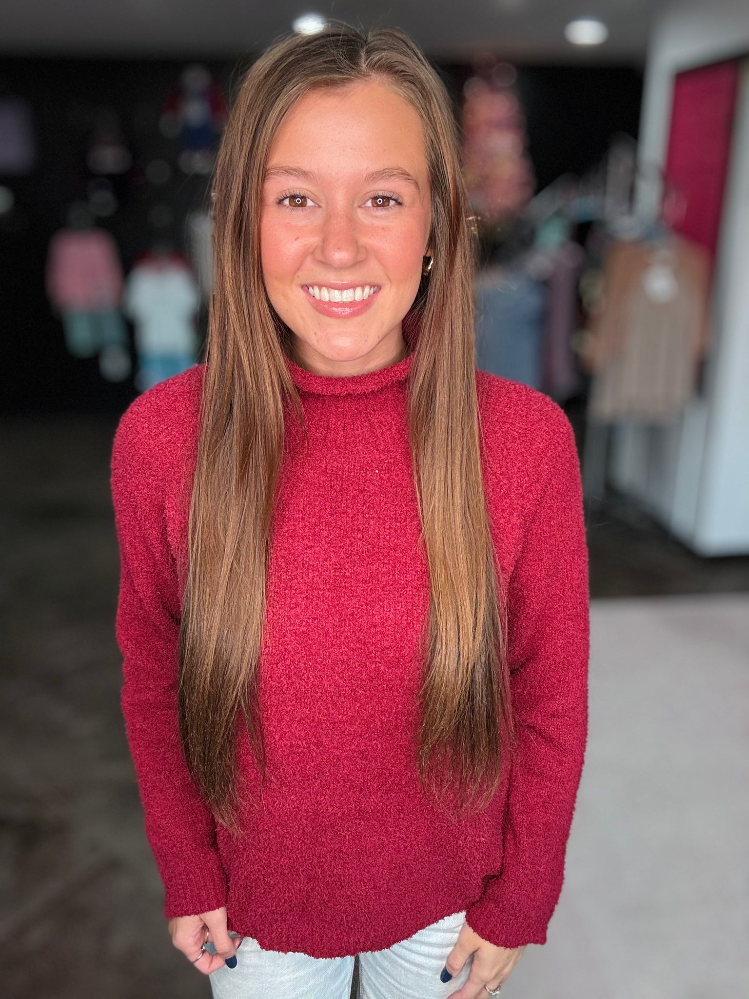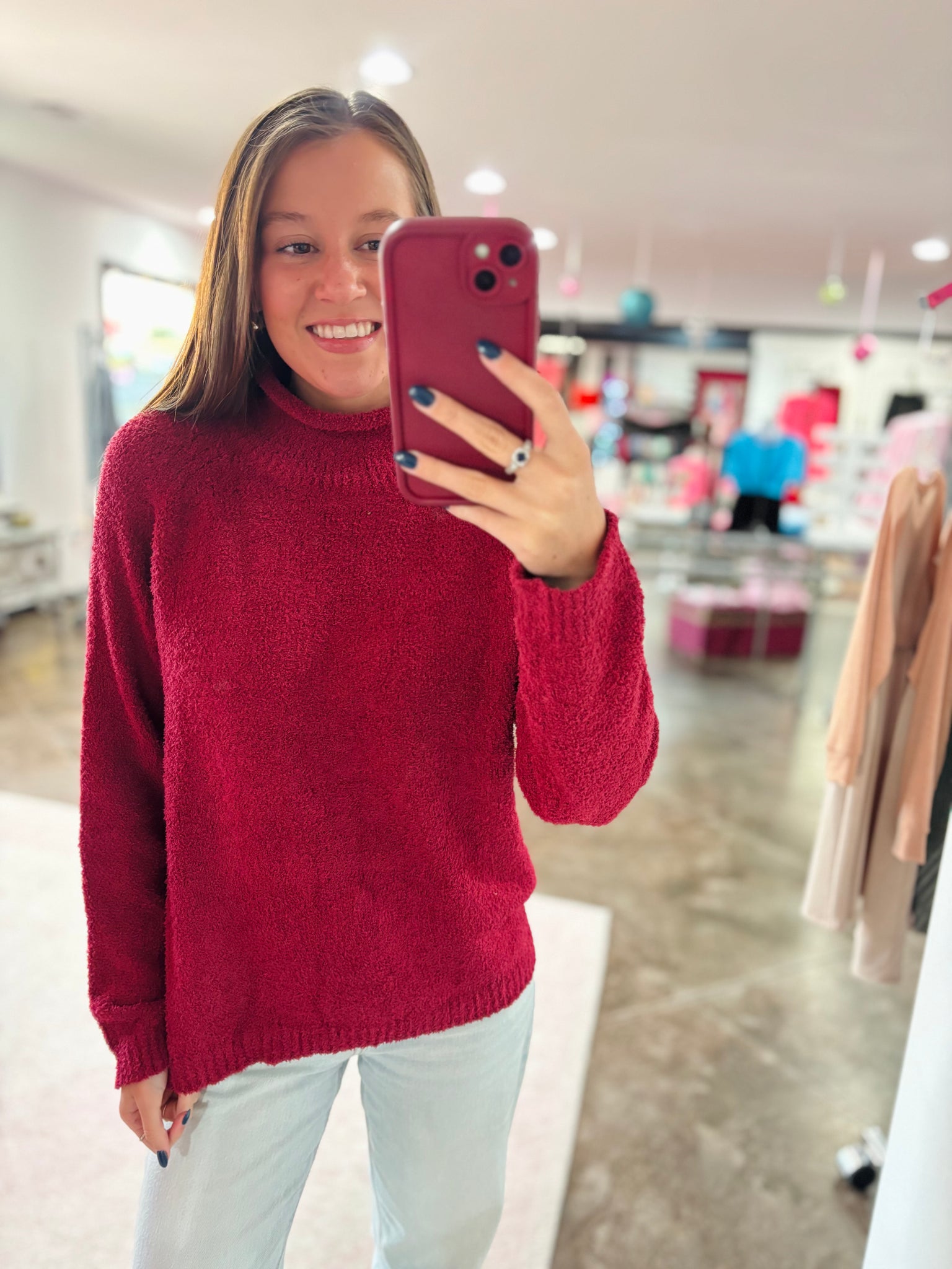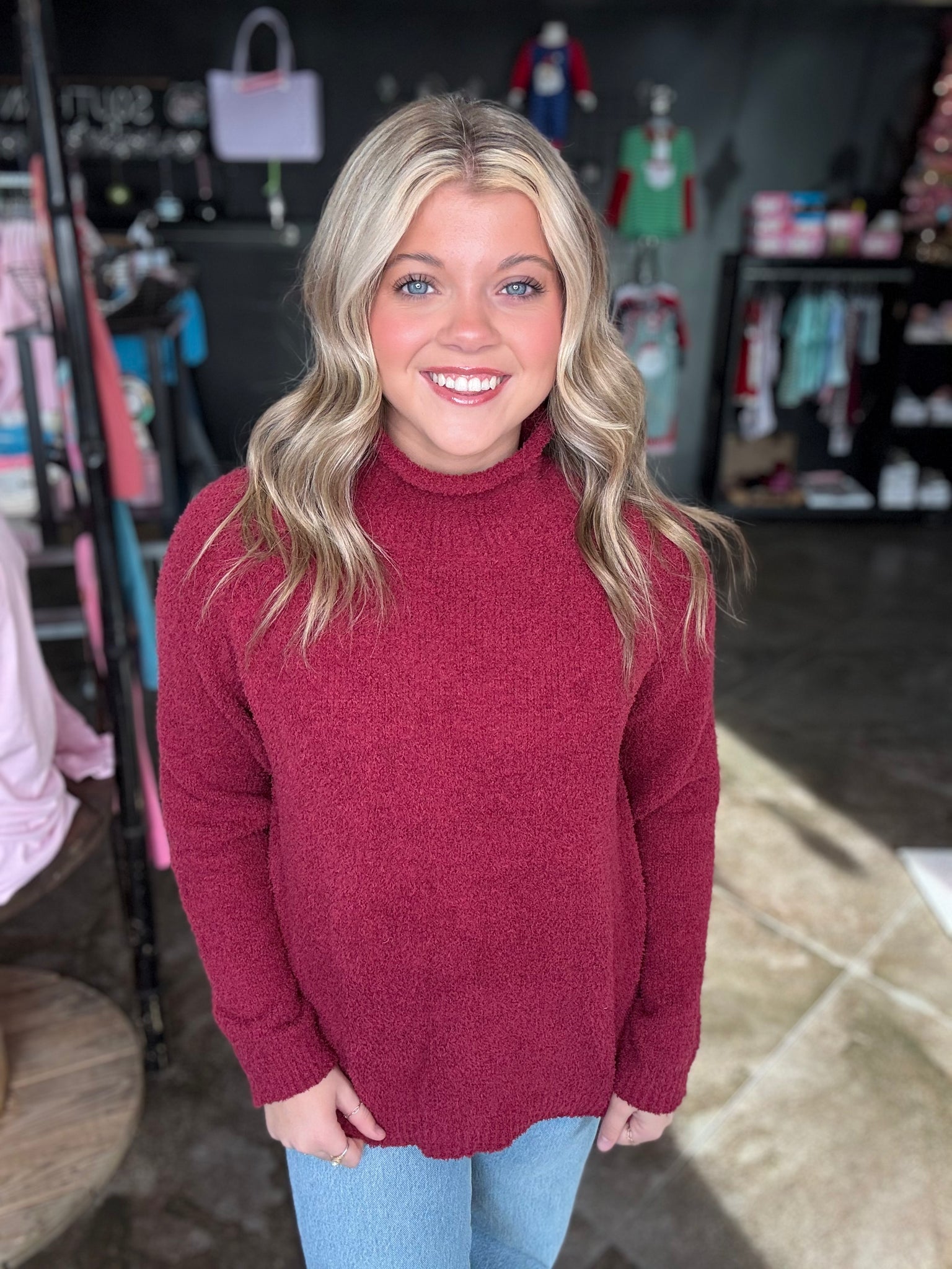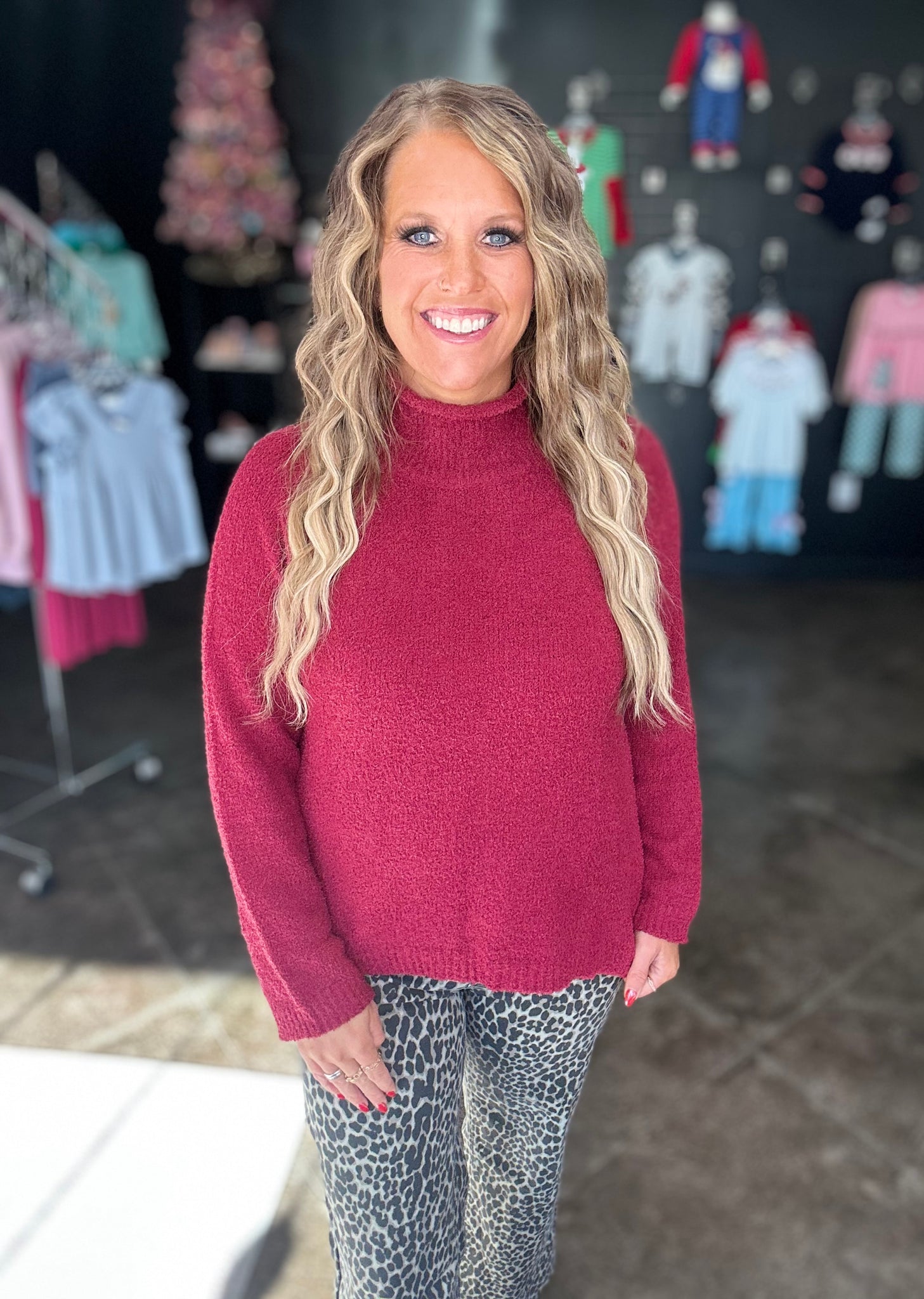 This is a burgundy sweater knit top! It has the cutest mock neck! This is such a cute top!