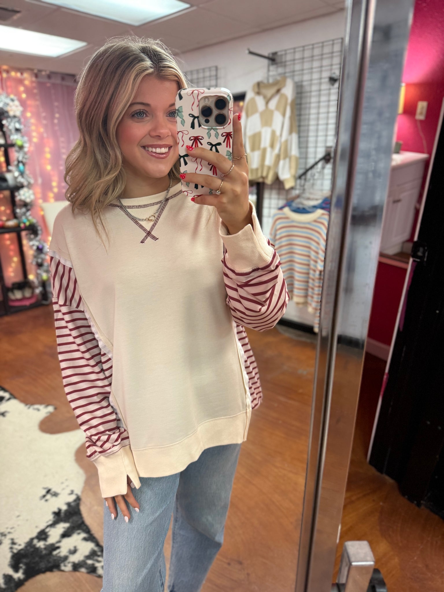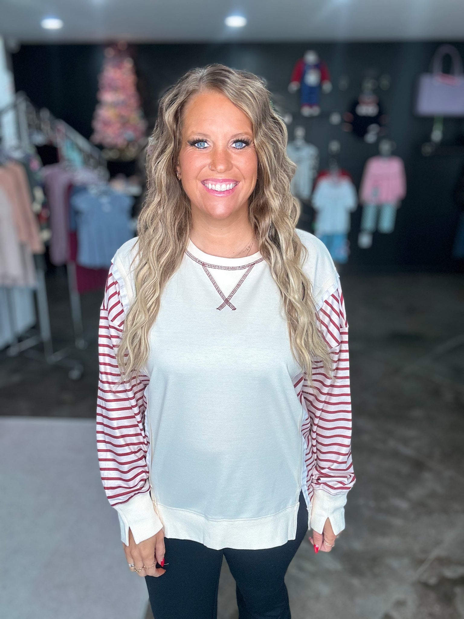 This is a beige top with red striped sleeves. This is the cutest patchwork top with side slits. Go ahead and add this to cart!