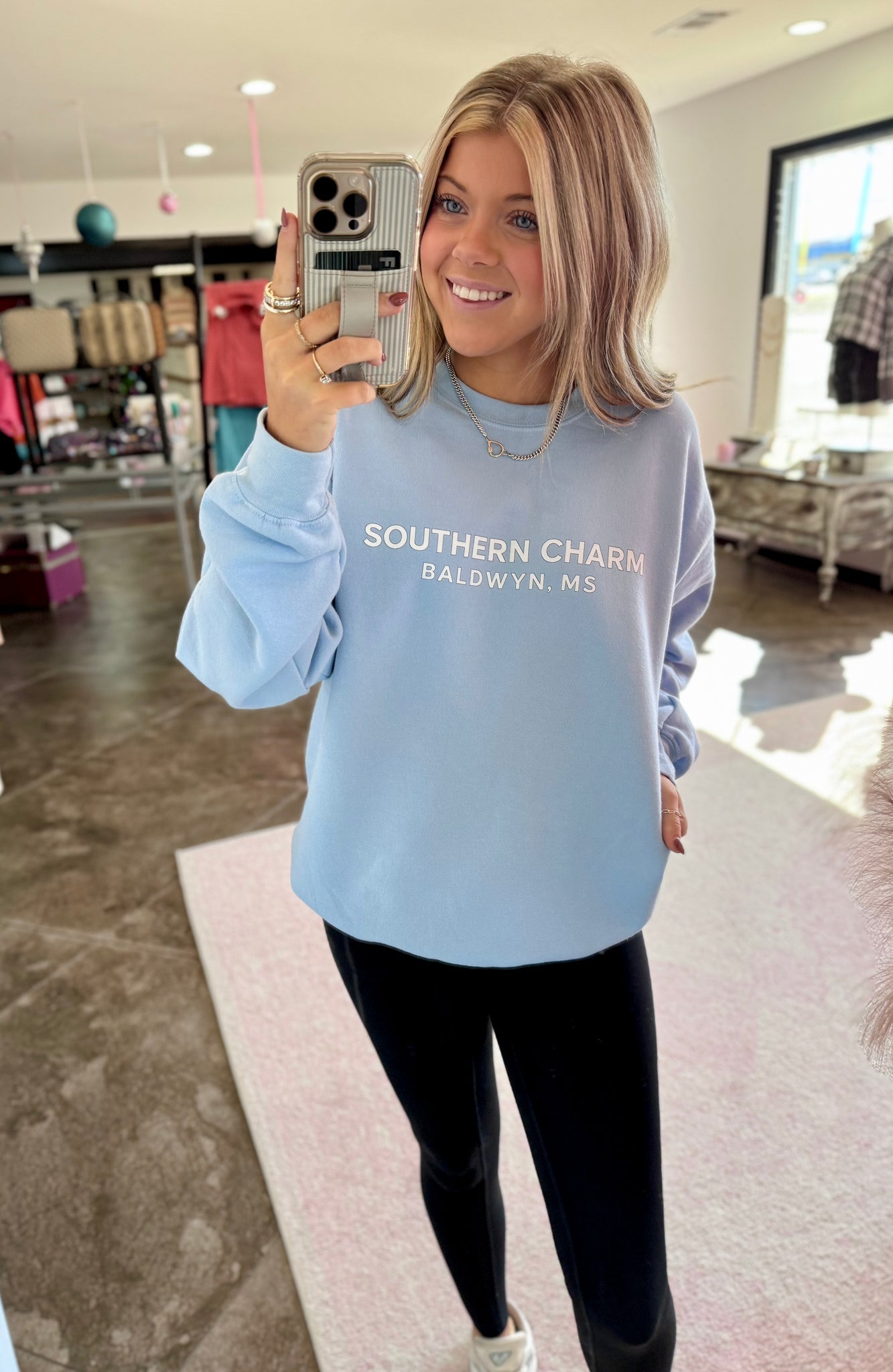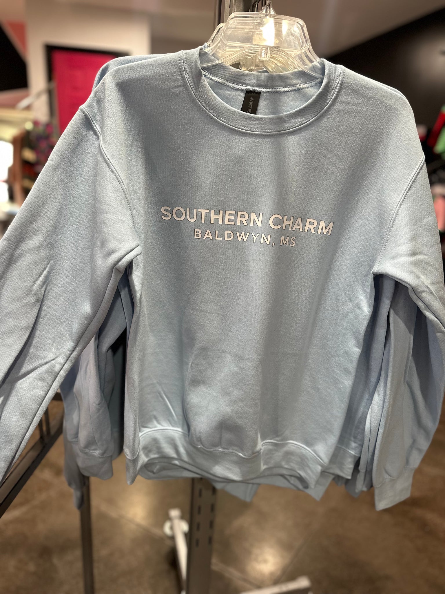 Block style, Southern Charm logo tee  with Baldwyn, Mississippi underneath. This is on gildan soft style sweatshirts and they are true to size.