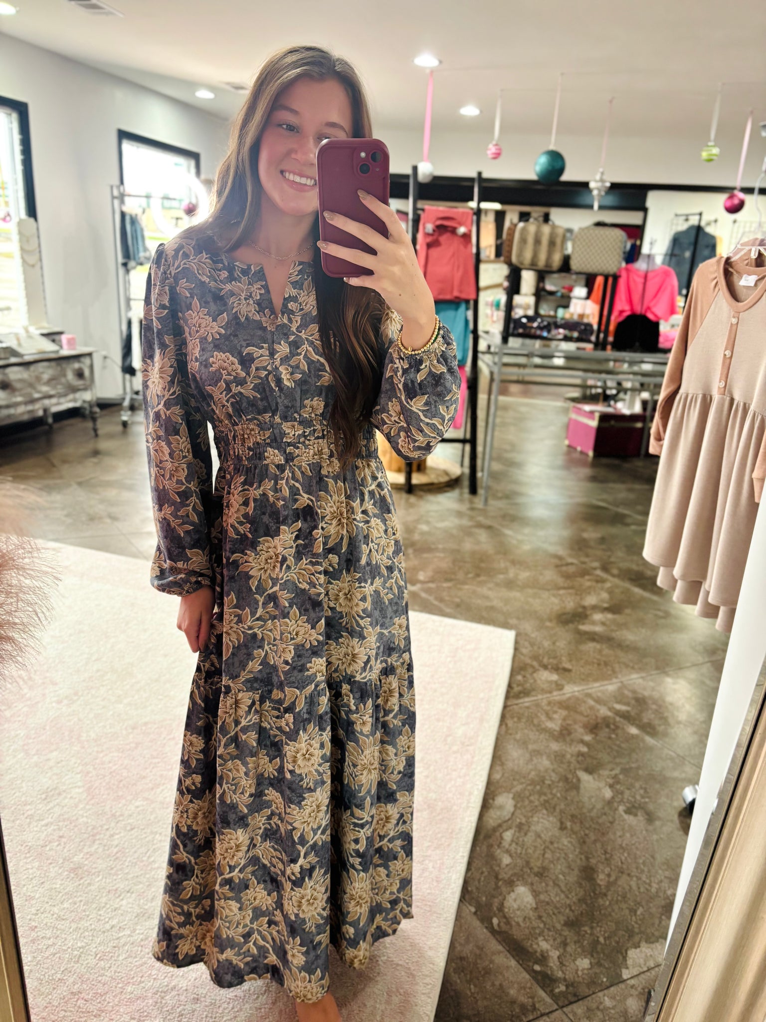 This is a sky blue floral maxi dress. It has smocked detailing, a split neck, and long sleeves. This is such a beautiful maxi dress!