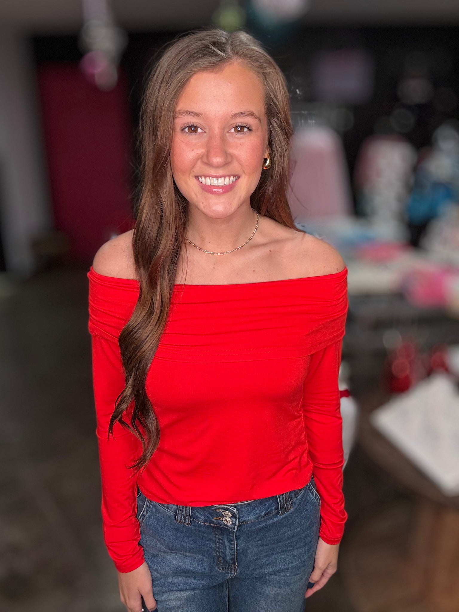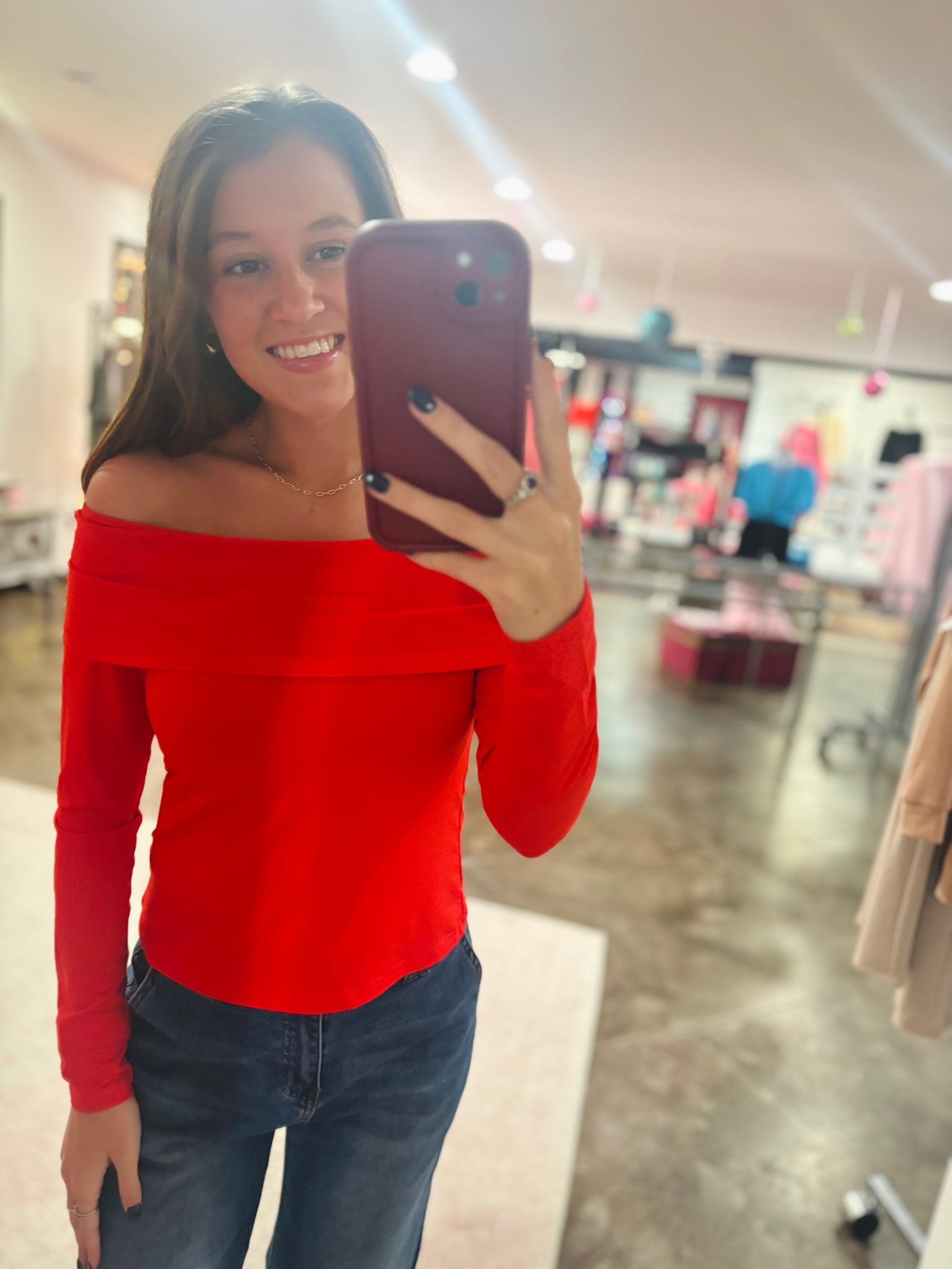 This is a red fold over, off the shoulder top. This is a slim fitting long sleeve top! This is the perfect top for the holiday season.