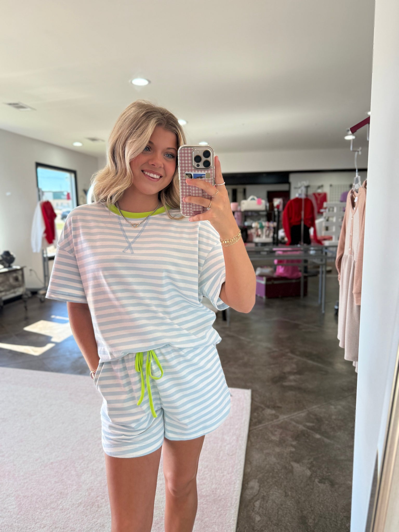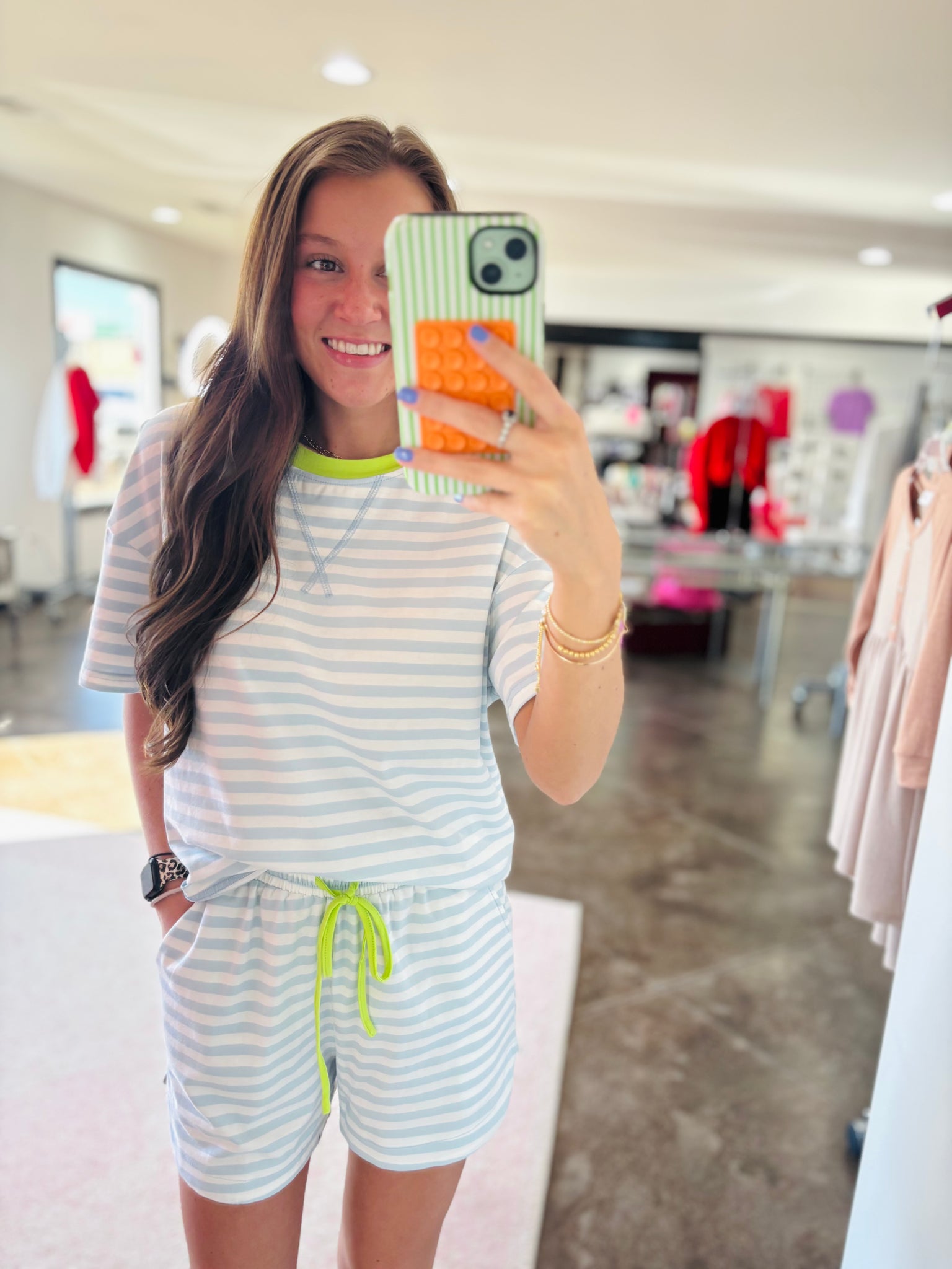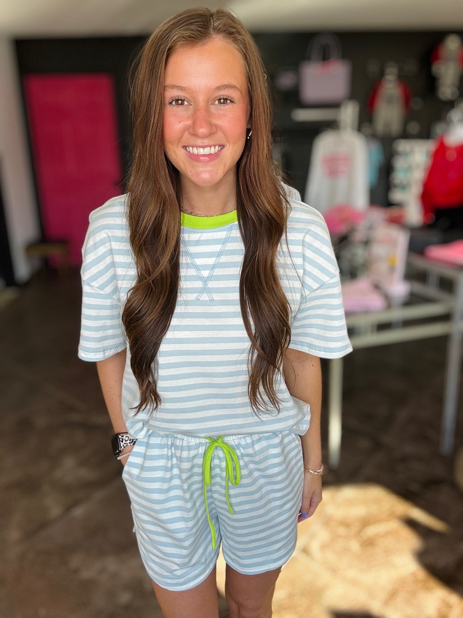 This is a sky blue and white striped matching set. It has a short sleeve top and short bottoms. It has contrast detailing around the neck and draw string bottoms! This is the perfect summer set!