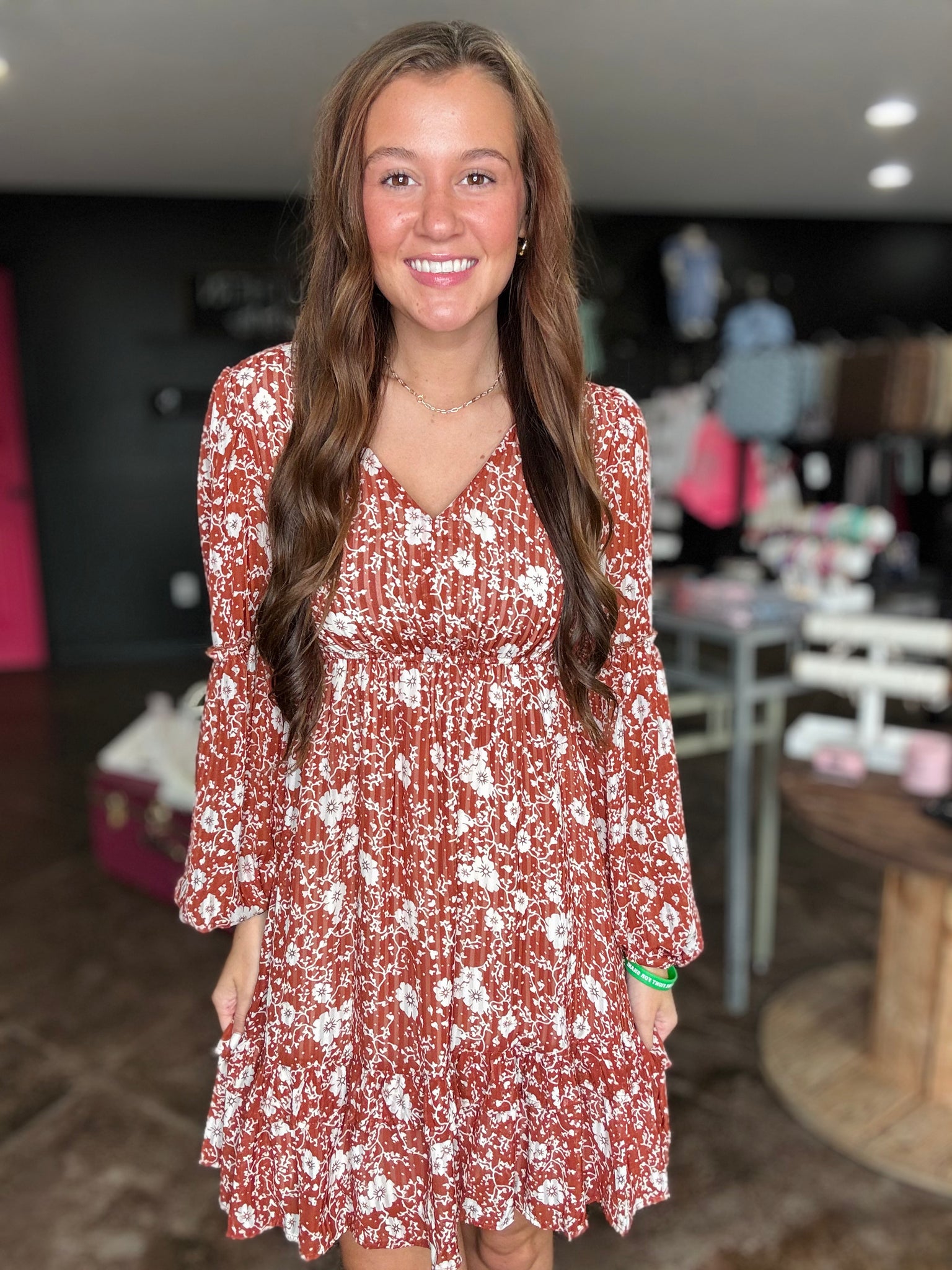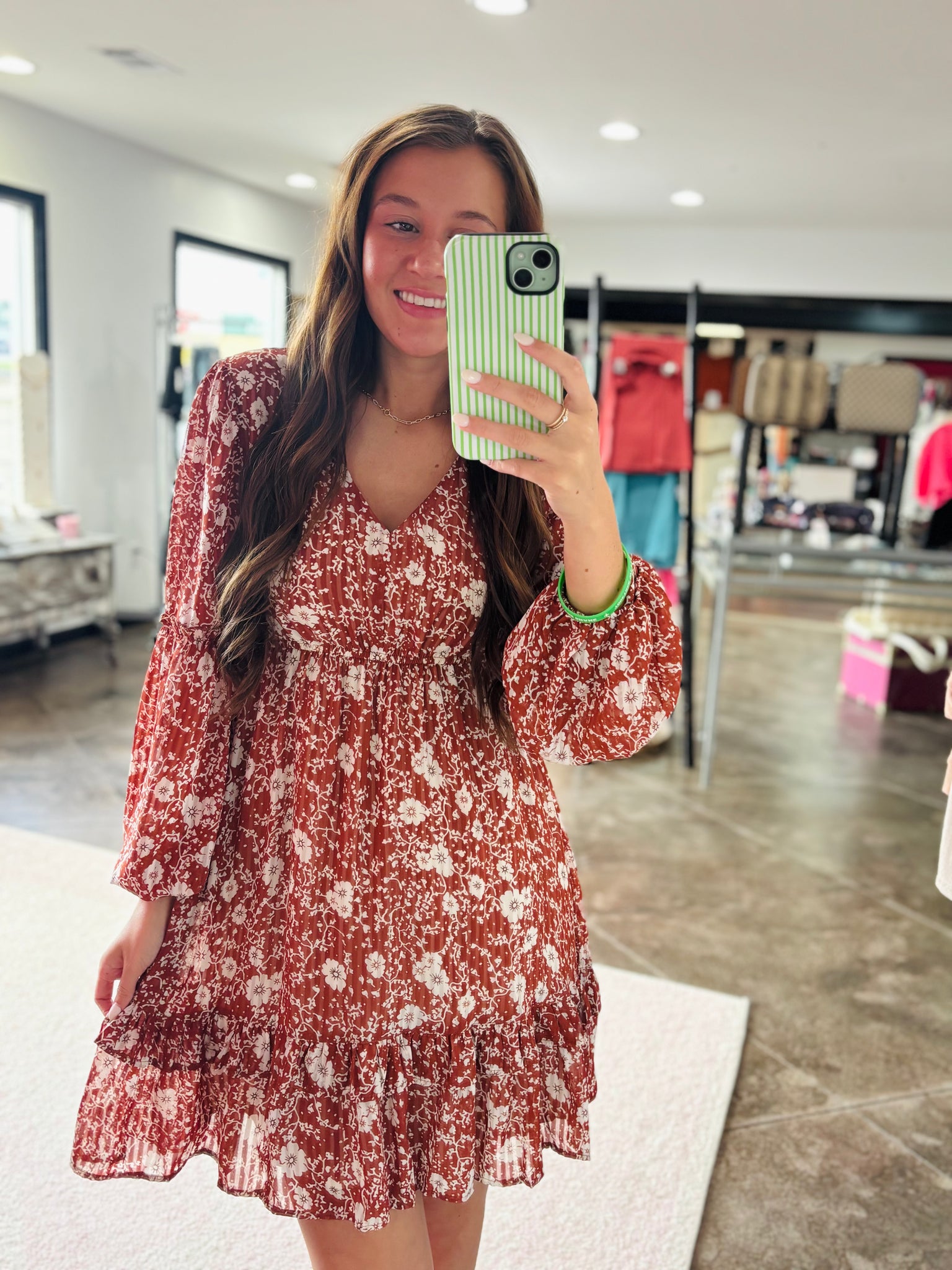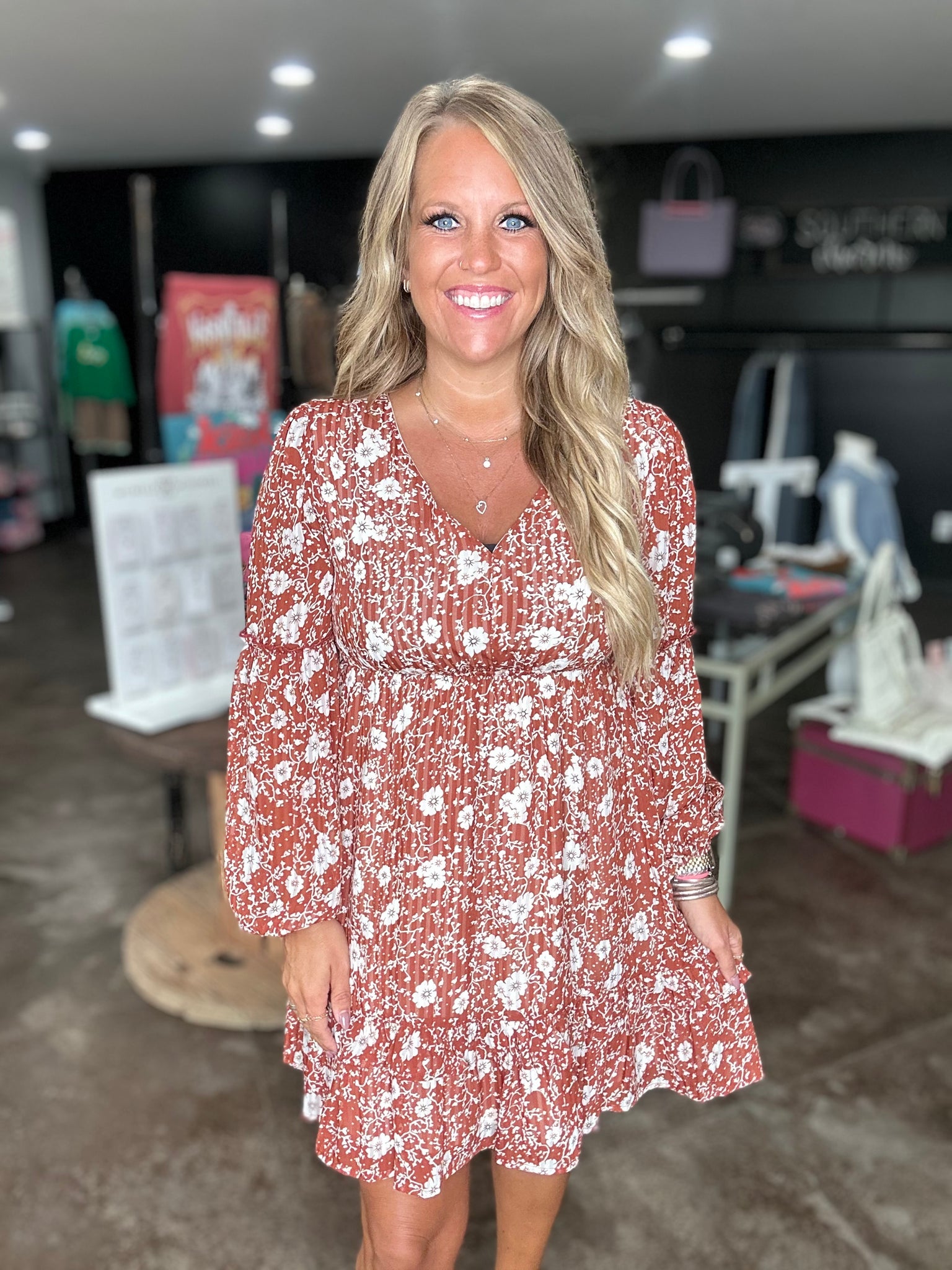 This is a rust colored dress with white floral detailing It has ruffled puff sleeves and a v-neck. This is such a cute mini dress.