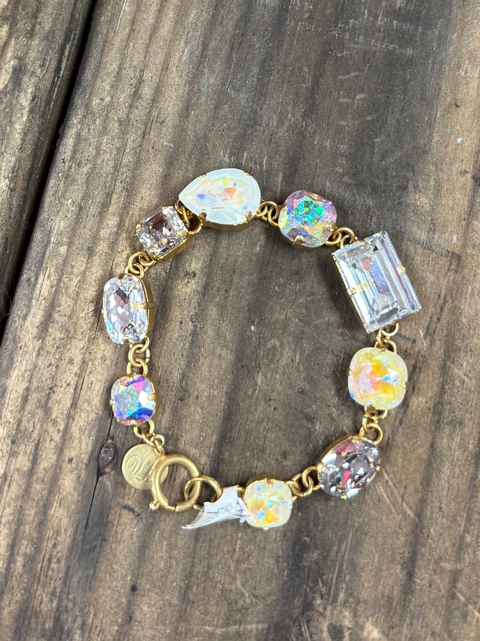 This is a beautiful multi shaped stone bracelet with glass stones, crystal ab stones, and white opal stones! This would make the perfect gift!