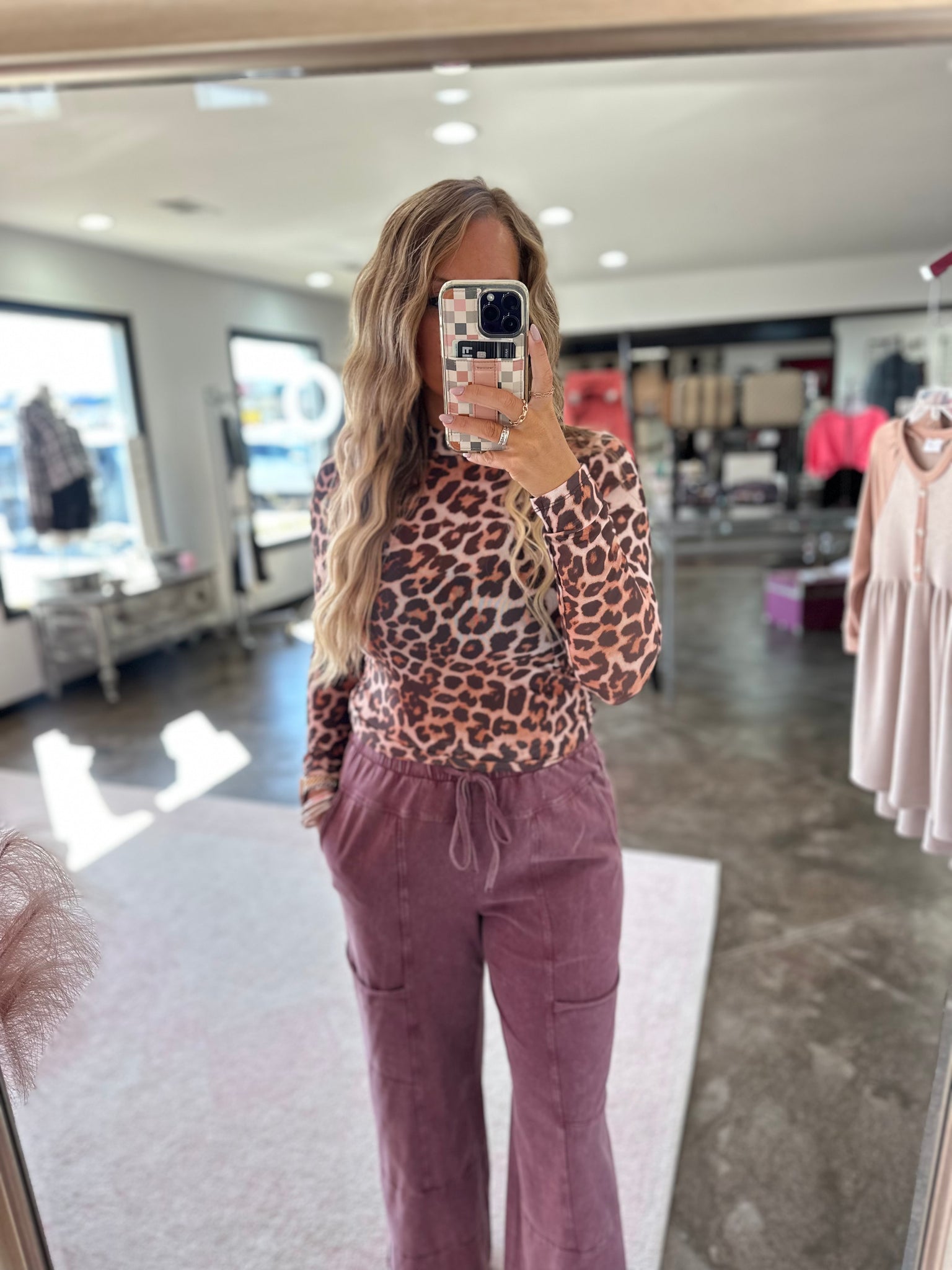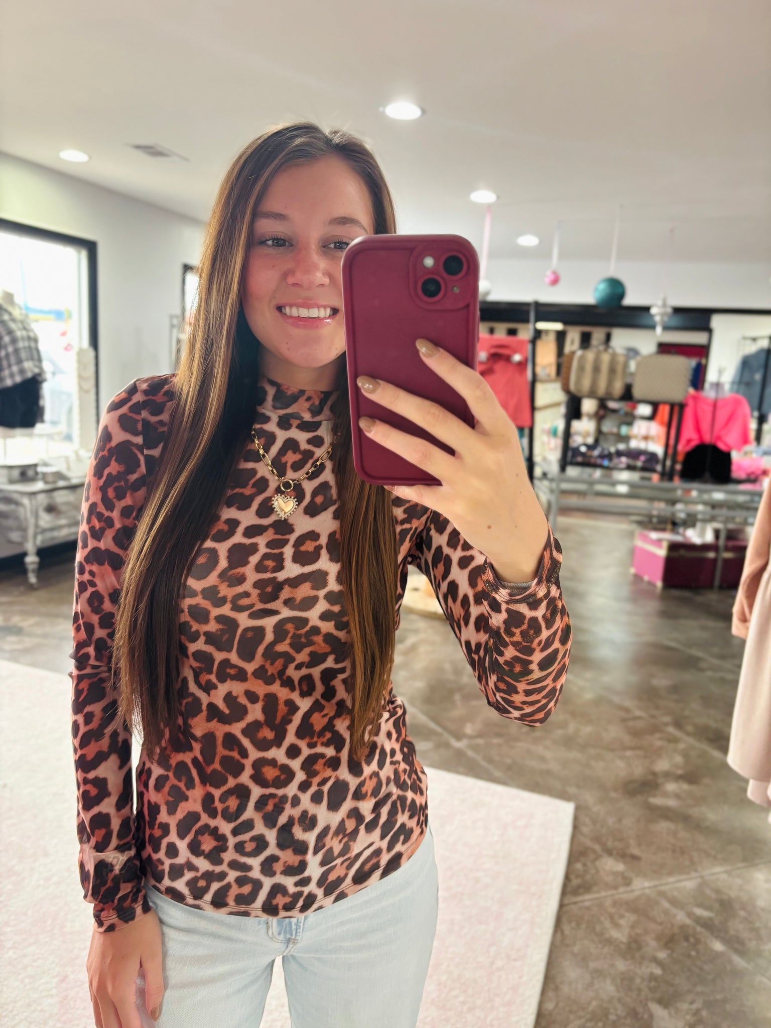 This is brown leopard sheer mesh top! It has a mock neck and long sleeves! This is perfect to wear alone or to layer with!