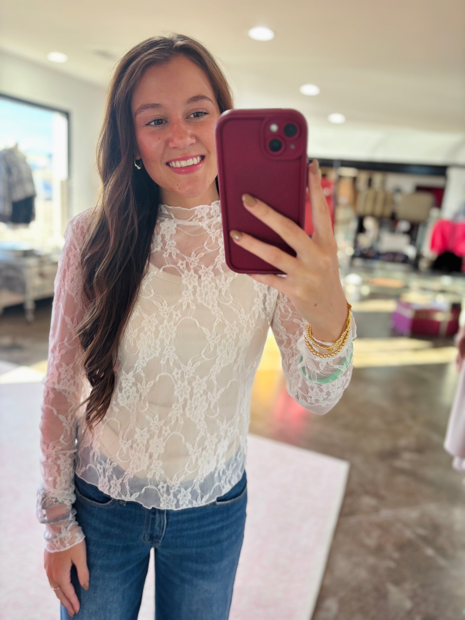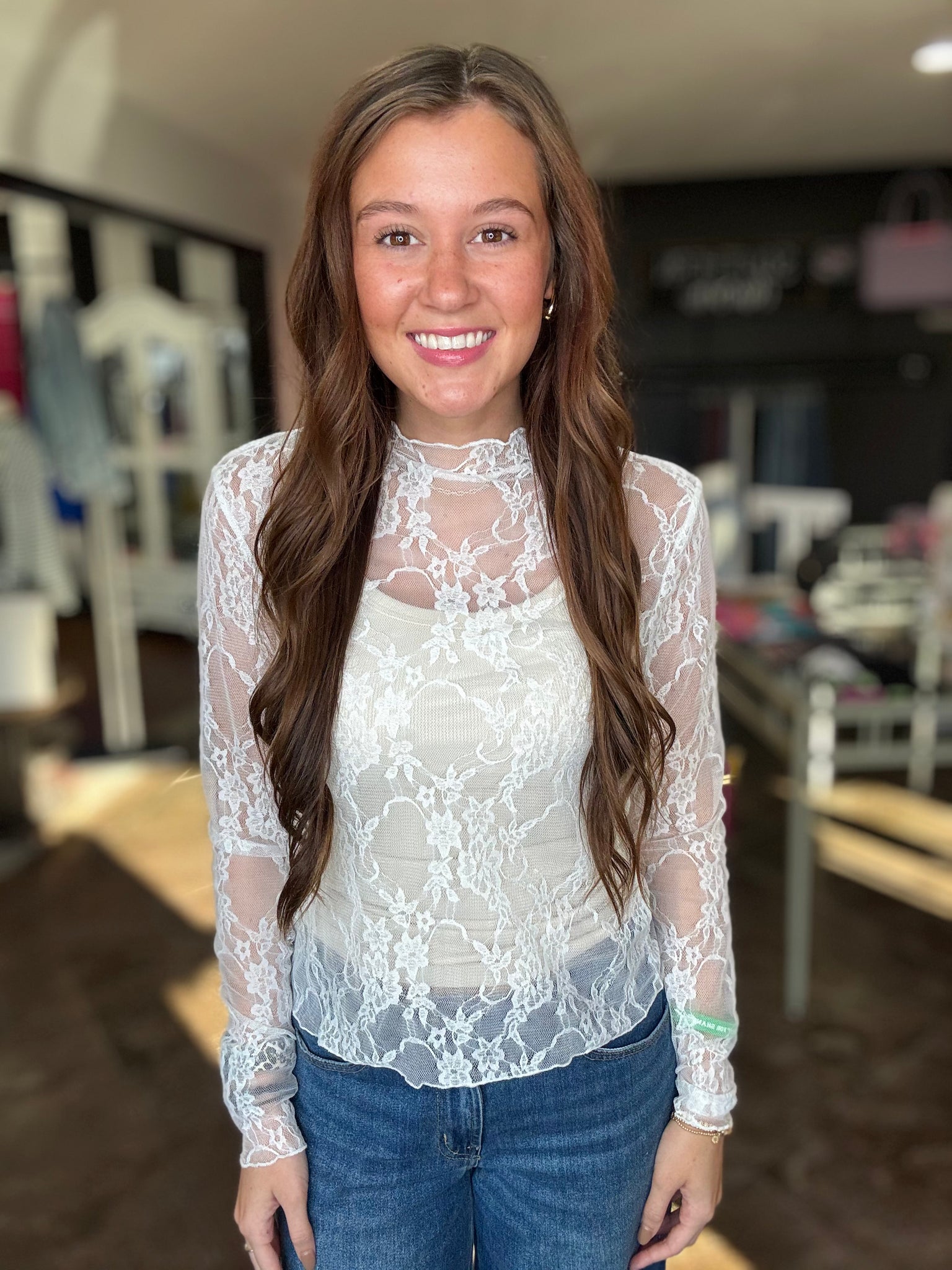 This is a white sheer mesh lace top! This has a slim fit and a mock neck. This is the perfect long sleeve top for layering!