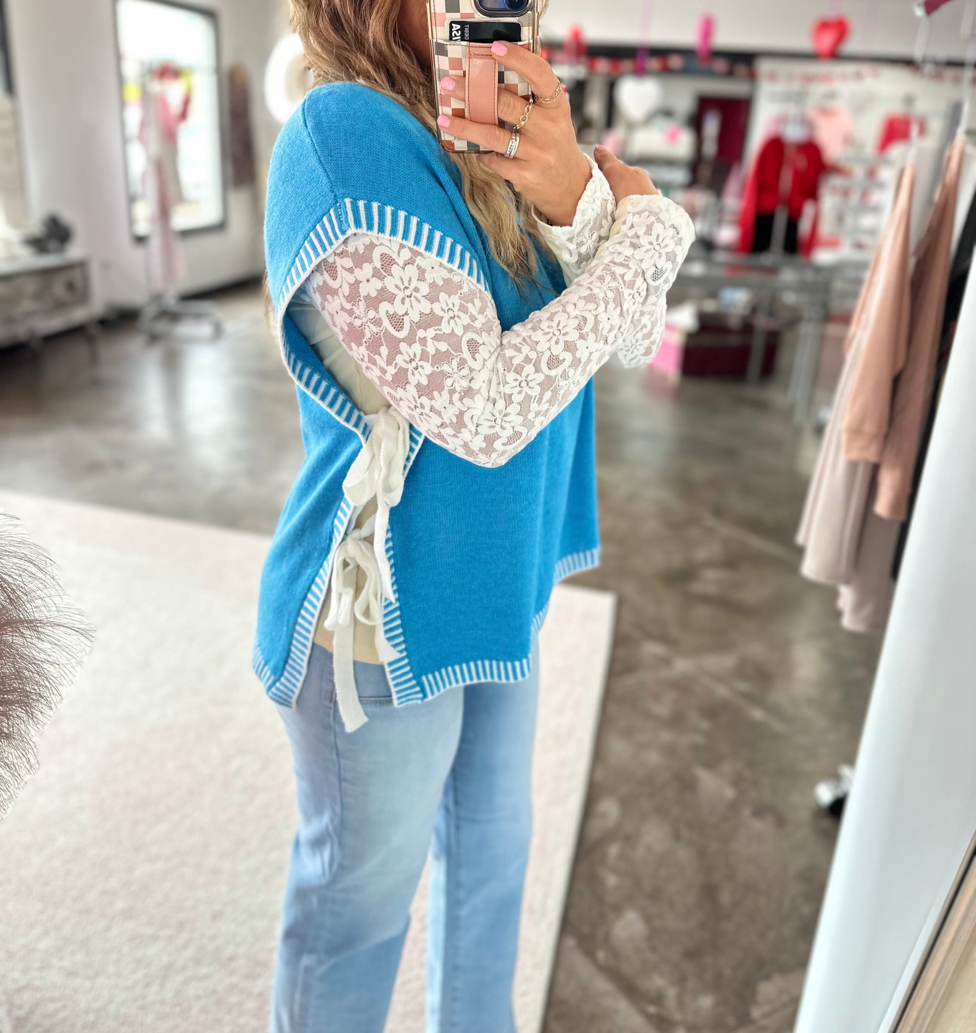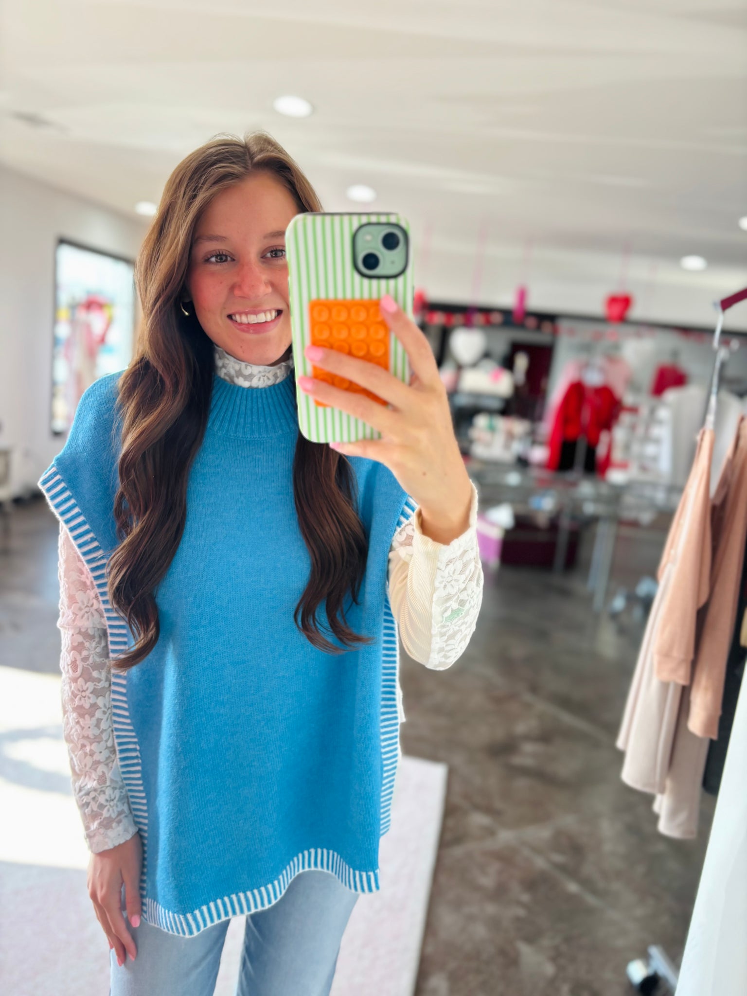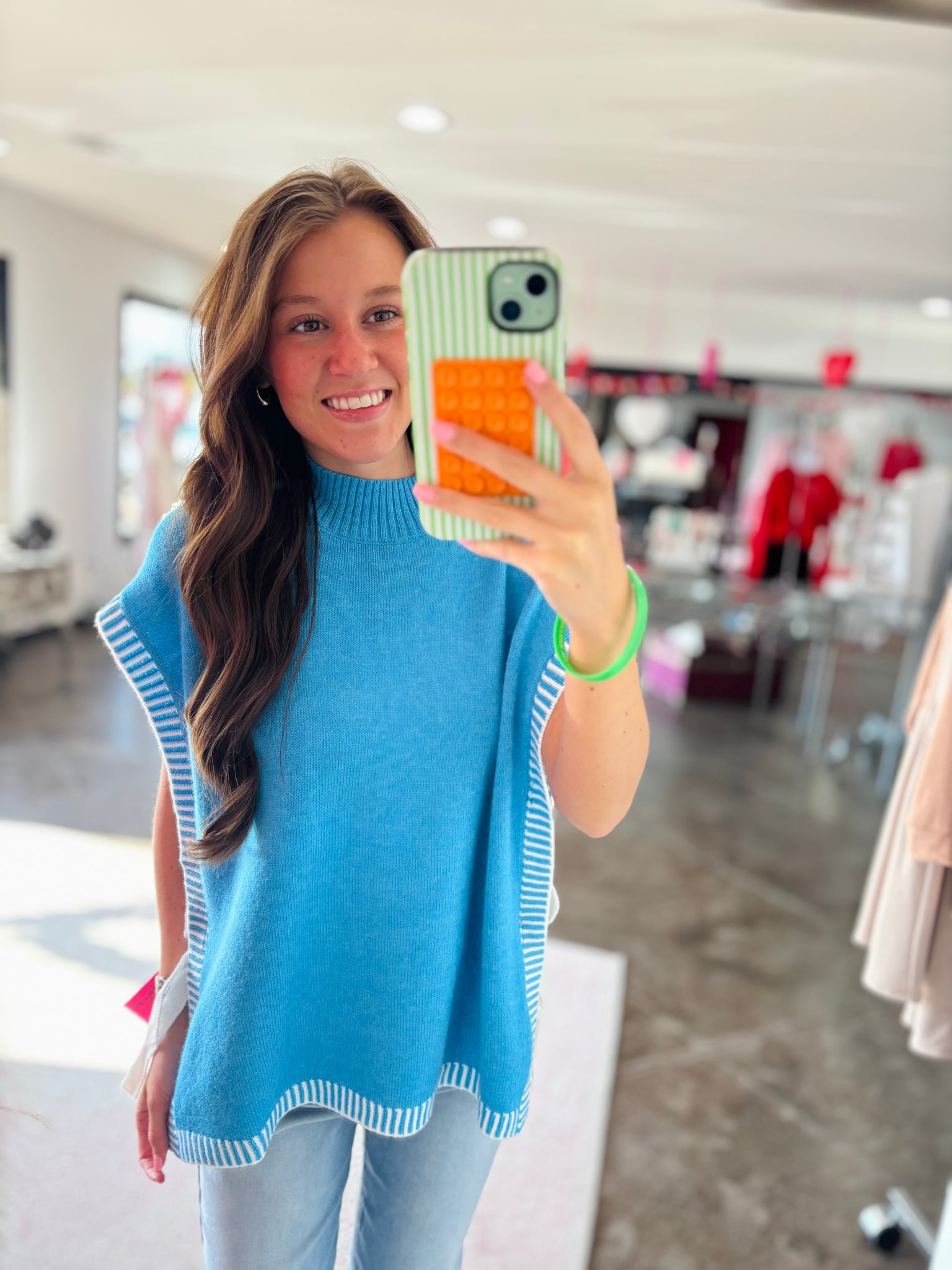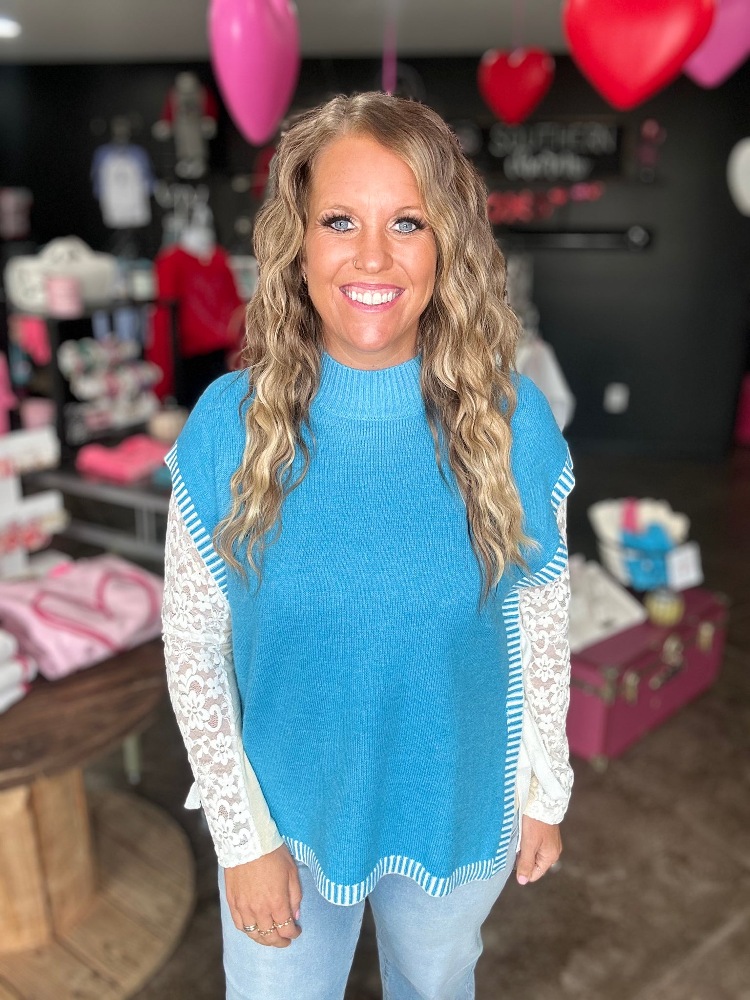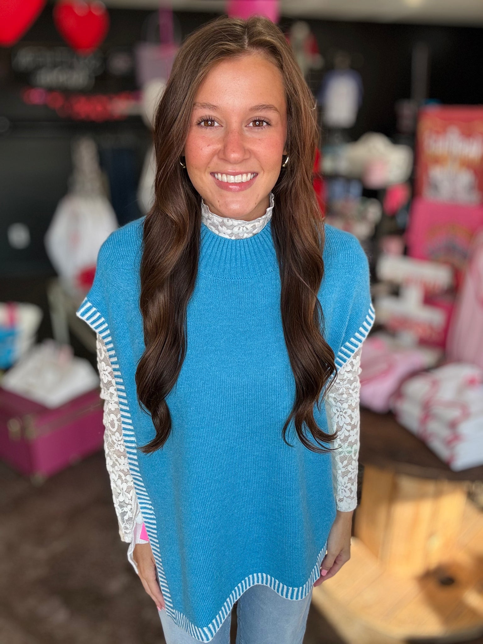 Cute blue mock neck short sleeve sweater with contrast stitching. Perfect casual top for everyday wear. This sweater has a boxy fit with tie details on the sides. Love to pair our lace top underneath now and easily add just a tank when the temps heat up. Shop this stylish sweater at Southern Charm Baldwyn.