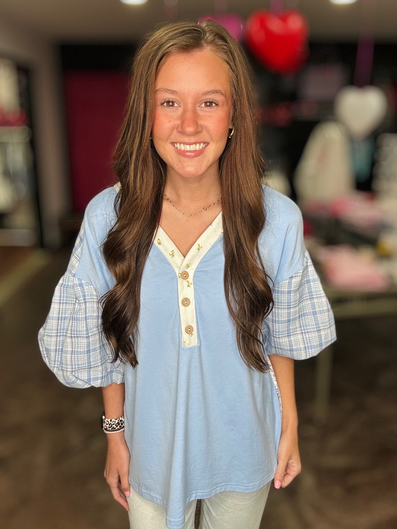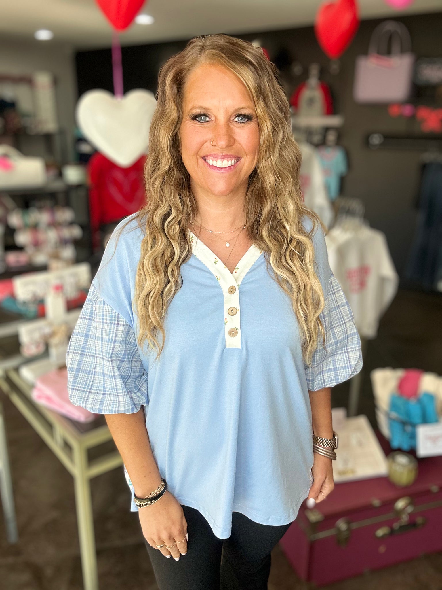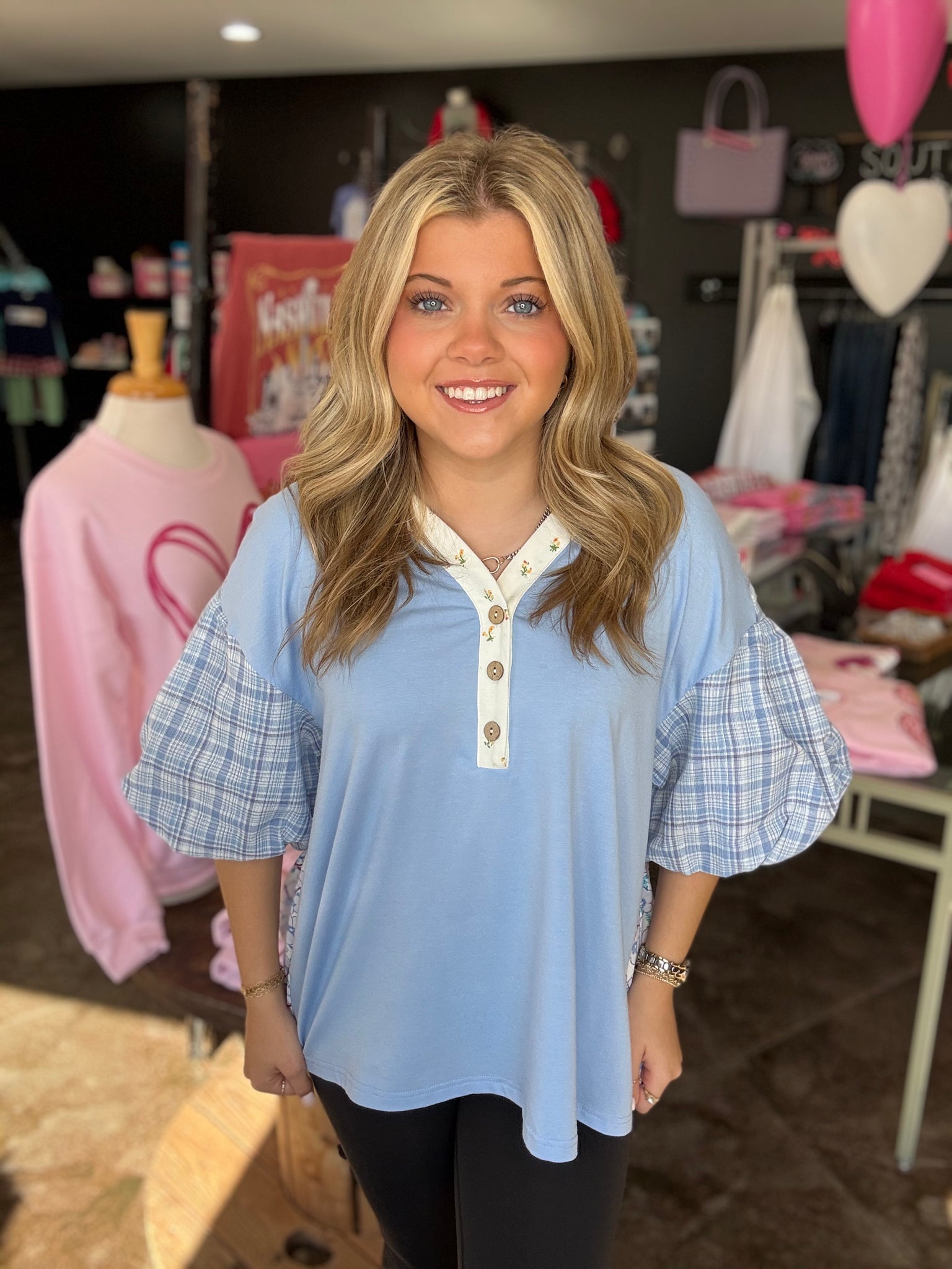This is a baby blue short sleeve top! It has plaid color block and bubble sleeves!. The patch work and button up detailing is too cute!