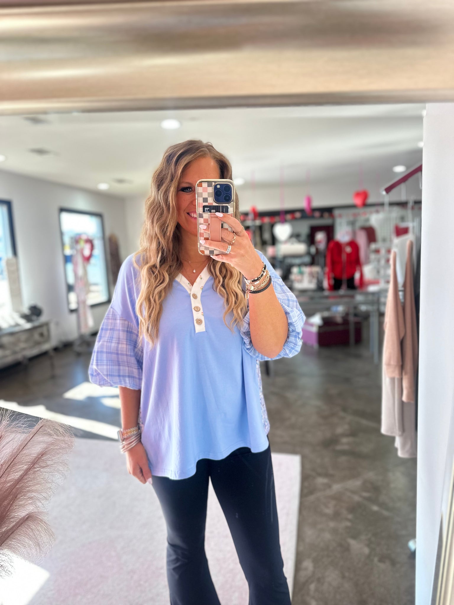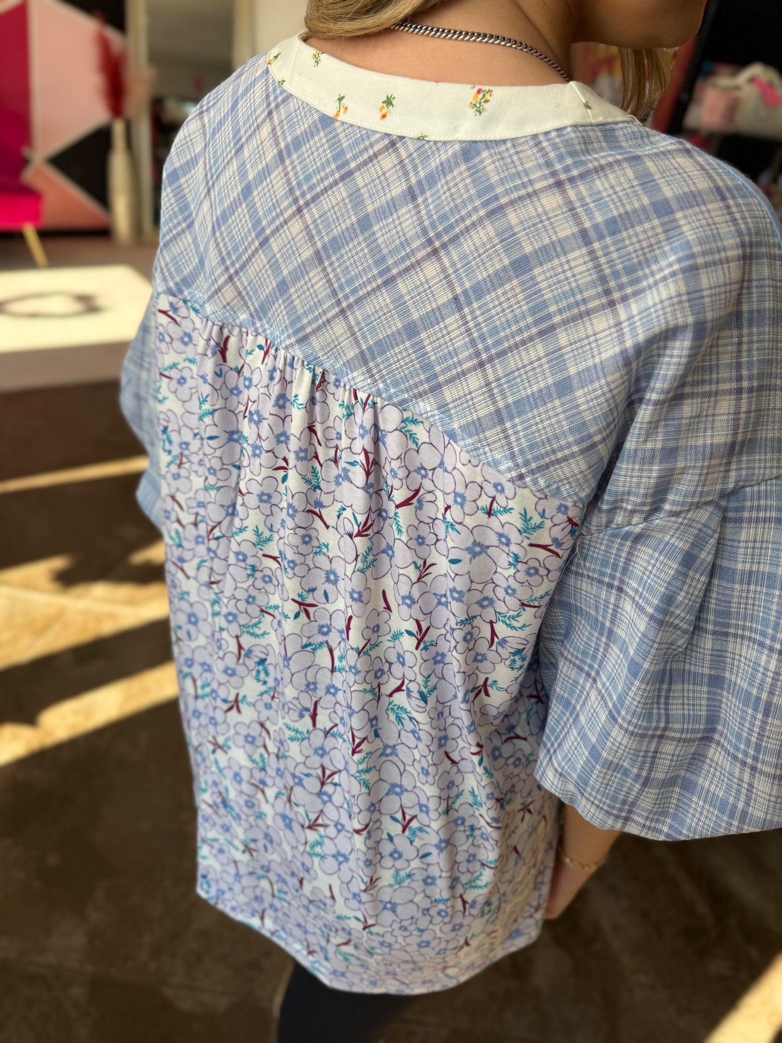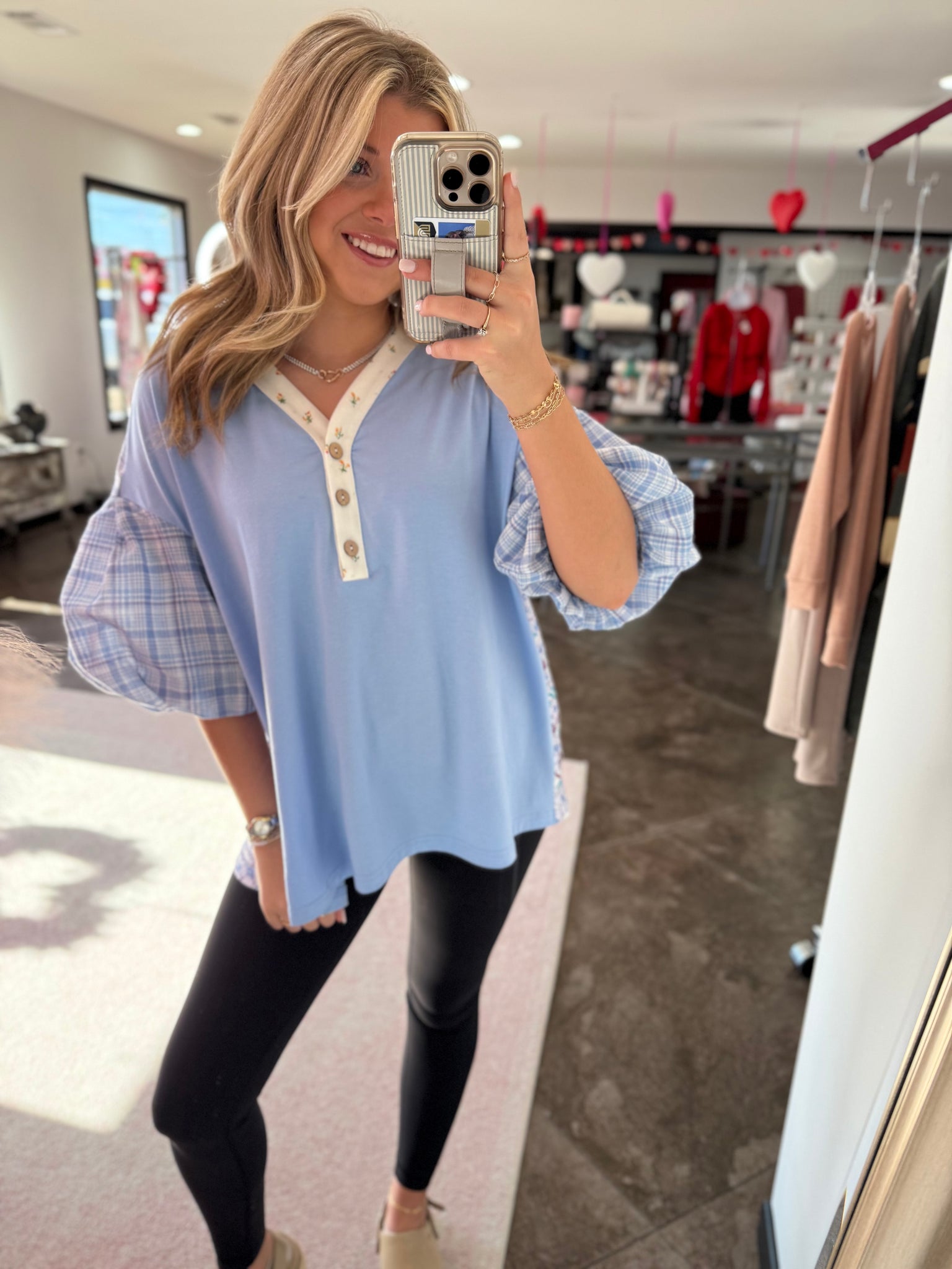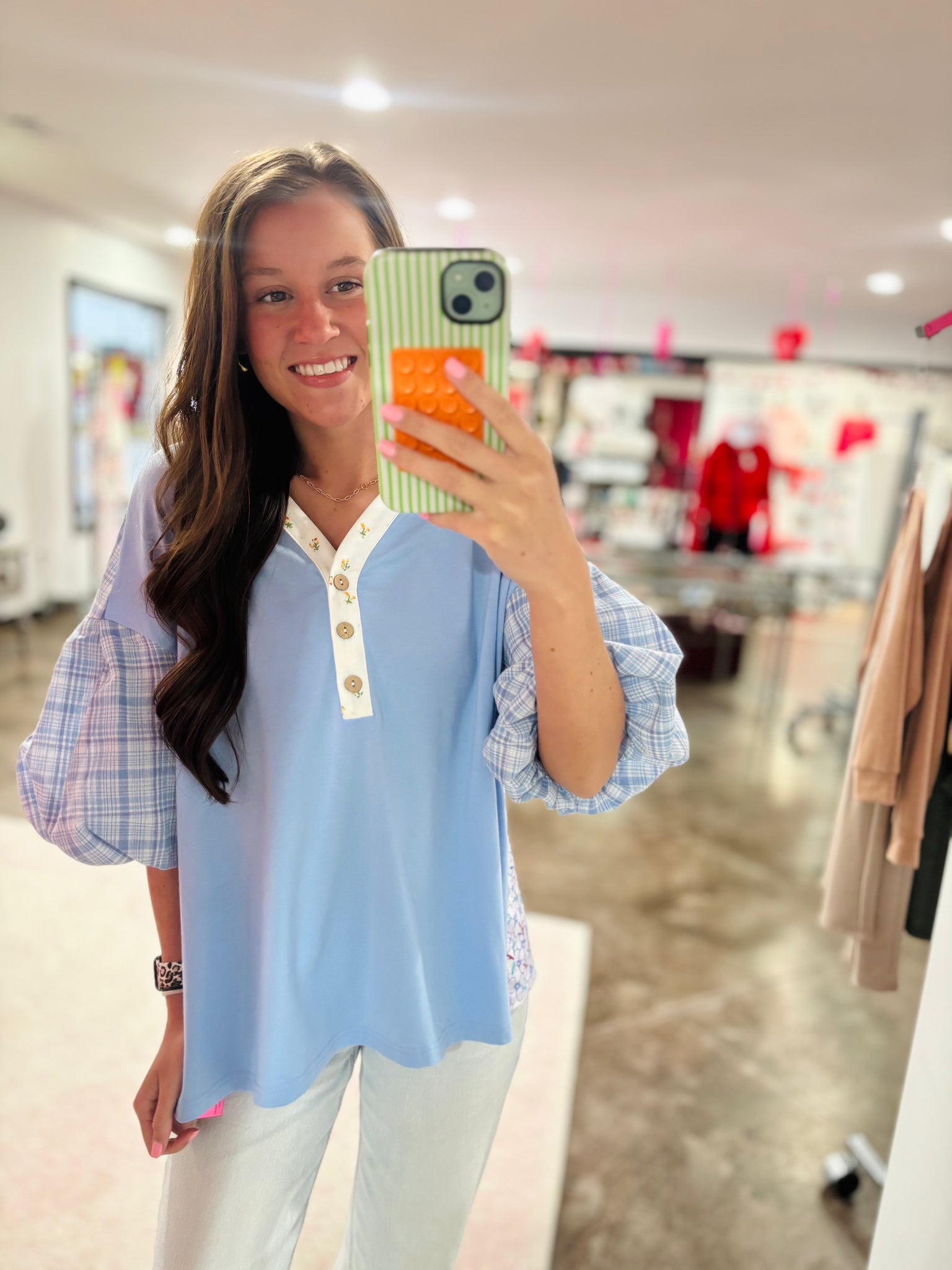 This is a baby blue short sleeve top! It has plaid color block and bubble sleeves!. The patch work and button up detailing is too cute!