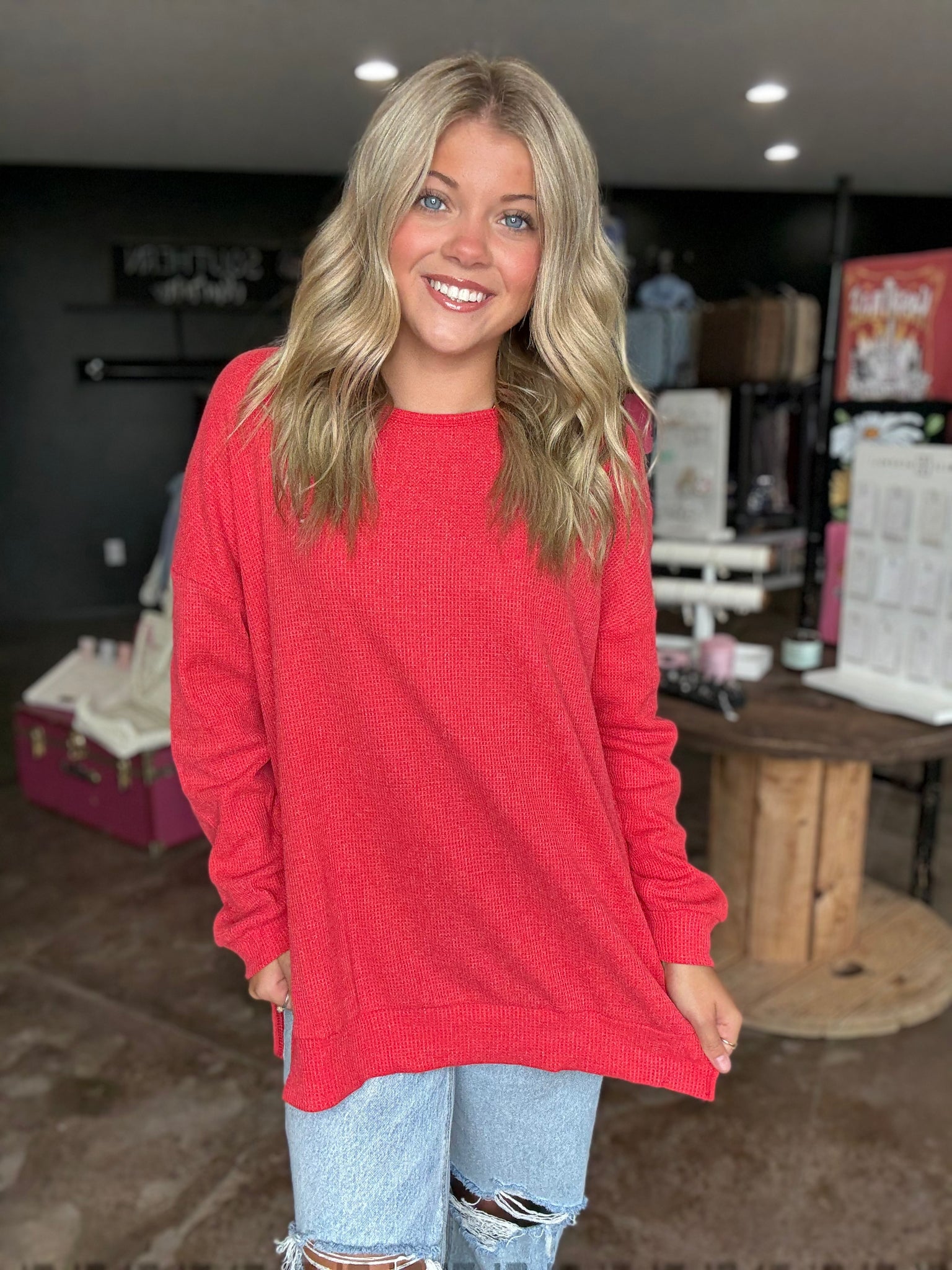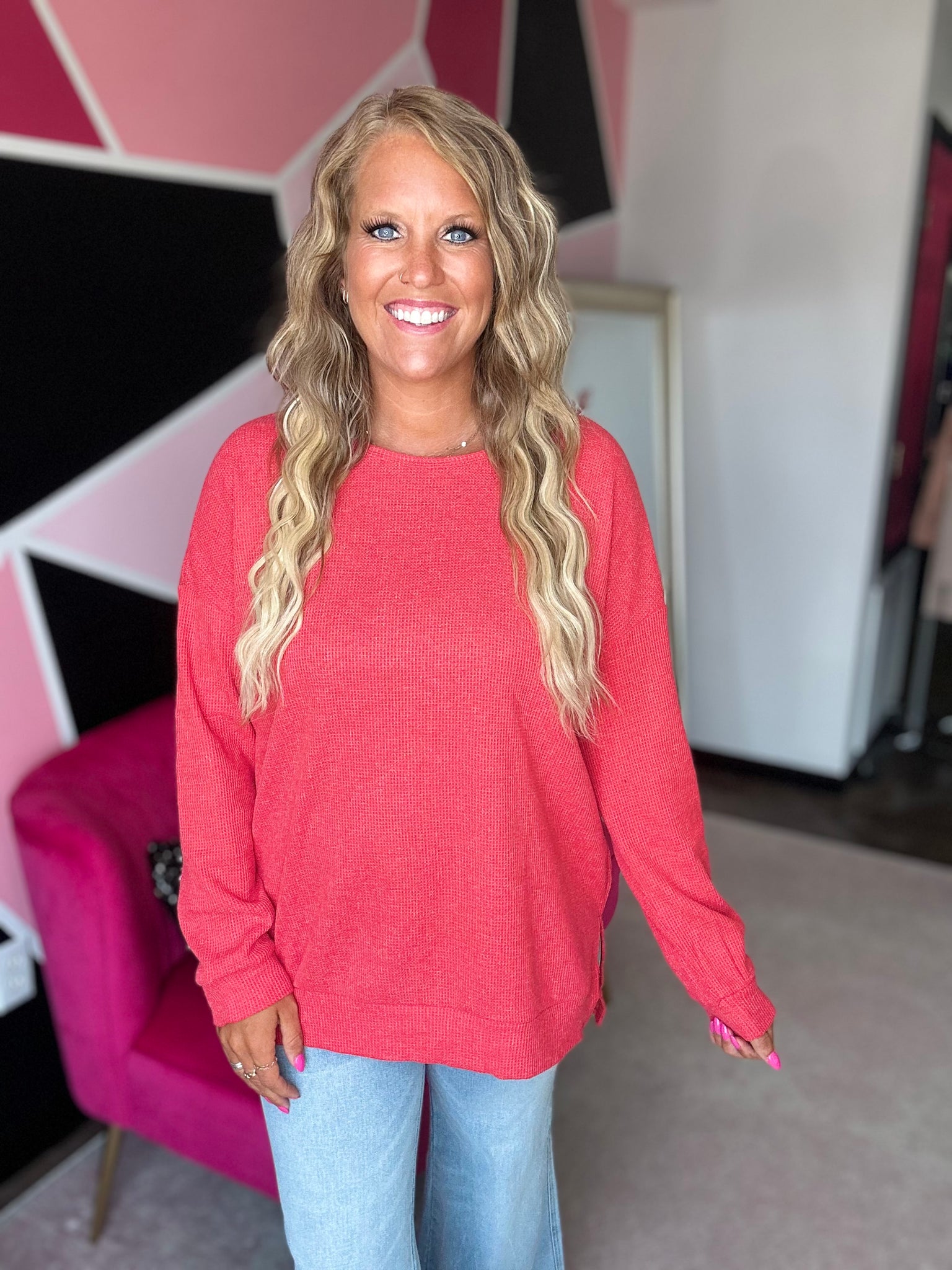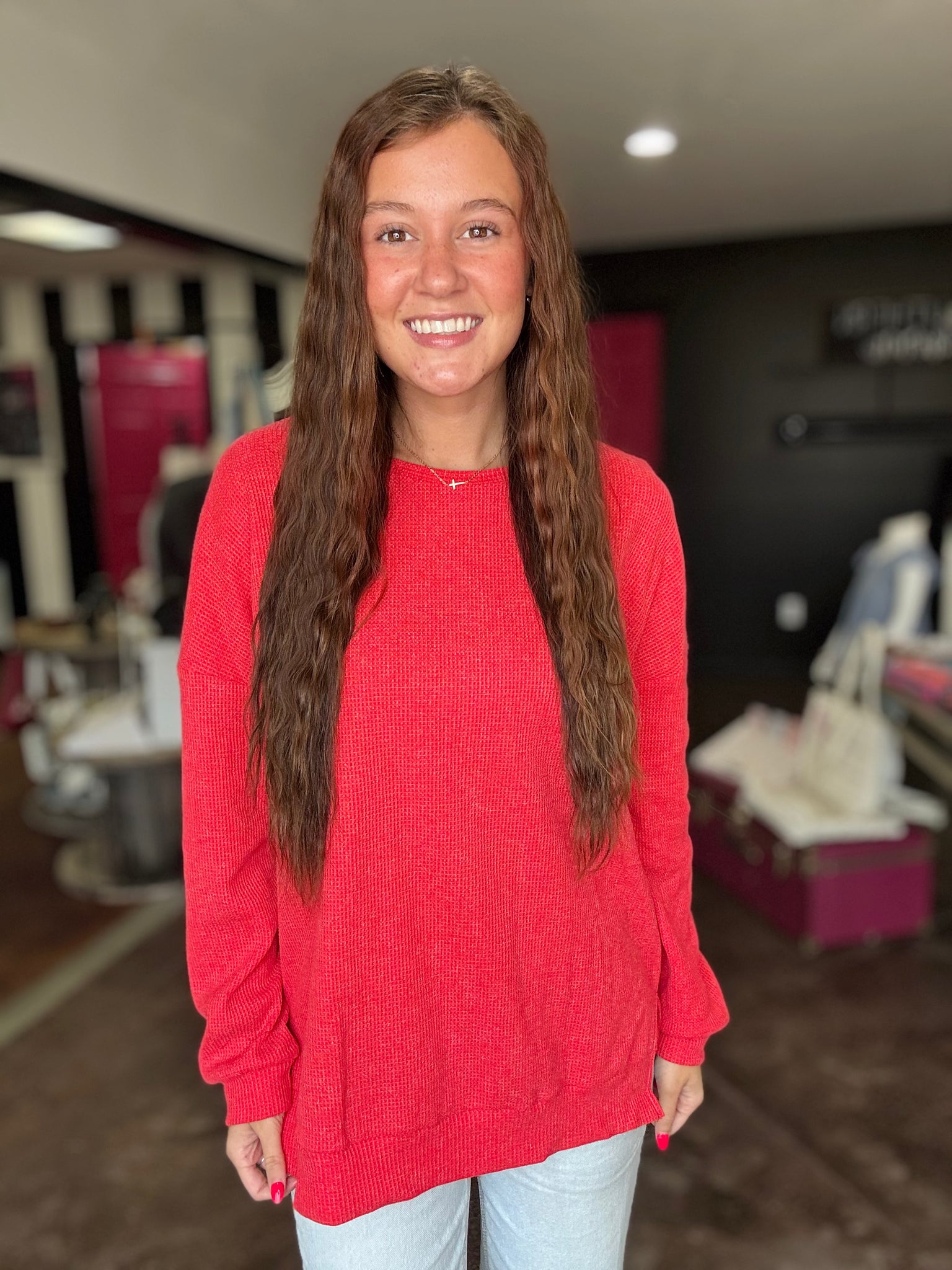 This is a fiery red waffle knit top! It has side slit. This is the perfect transition piece to add to your closet!