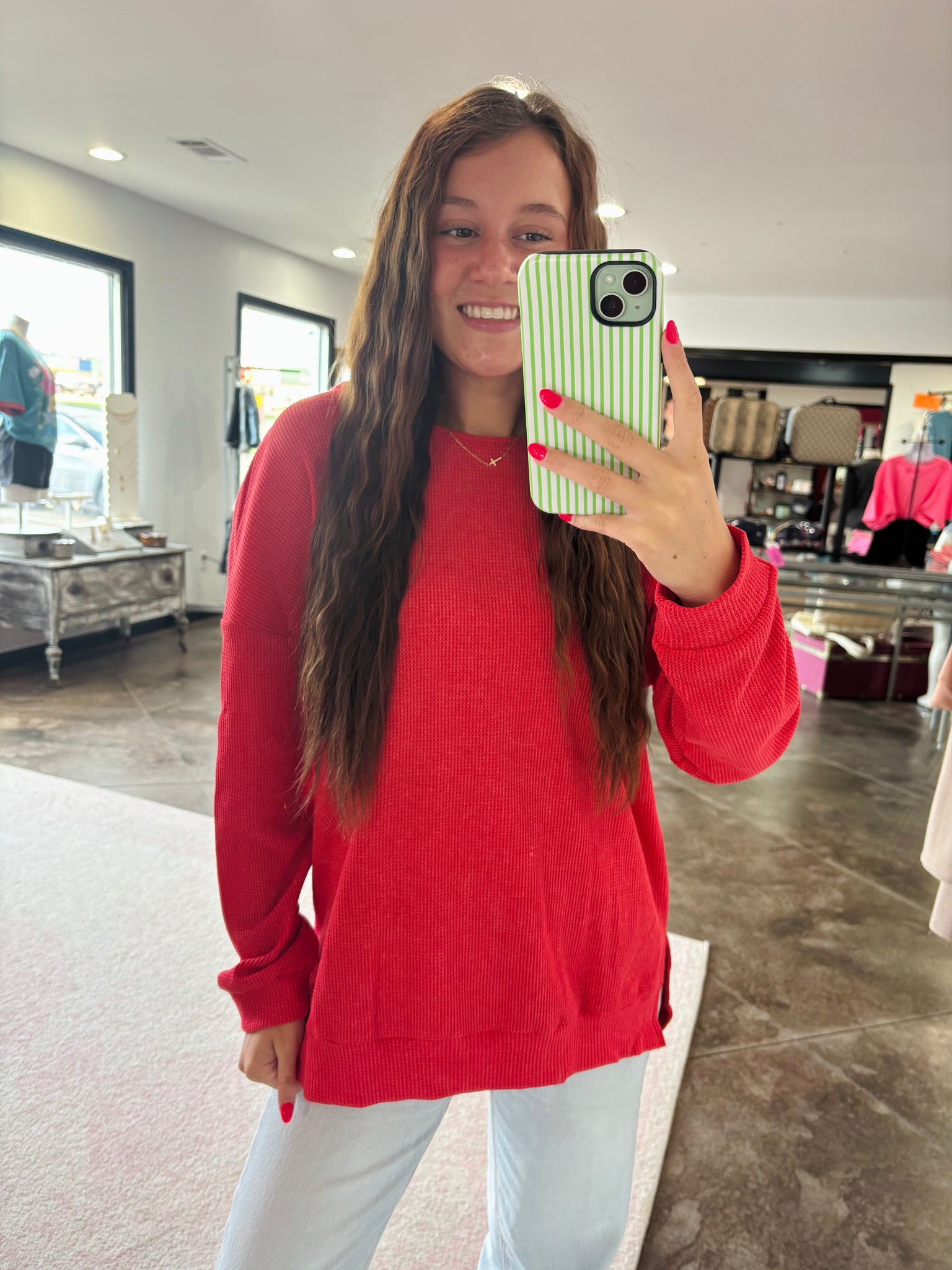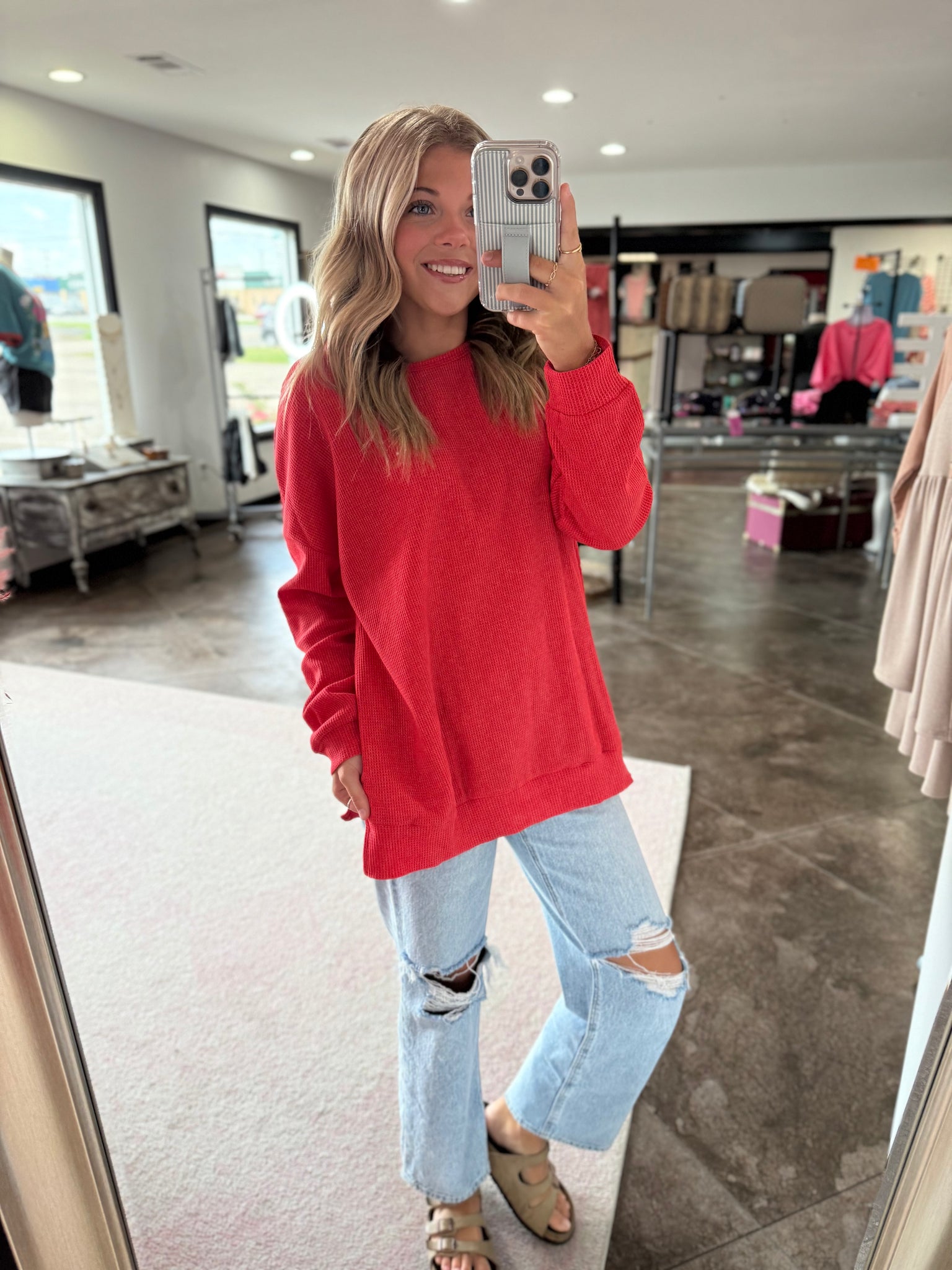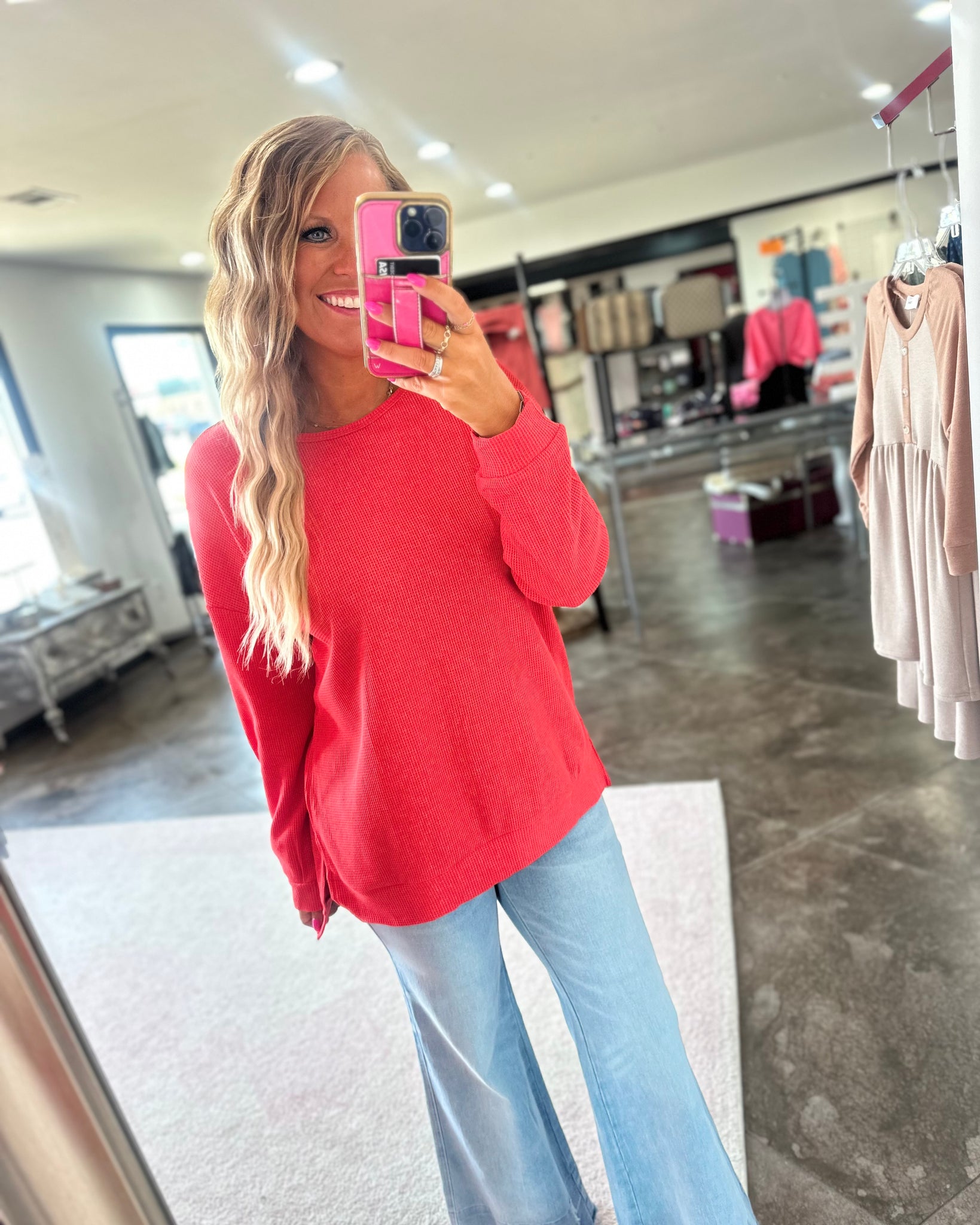 This is a fiery red waffle knit top! It has side slit. This is the perfect transition piece to add to your closet!