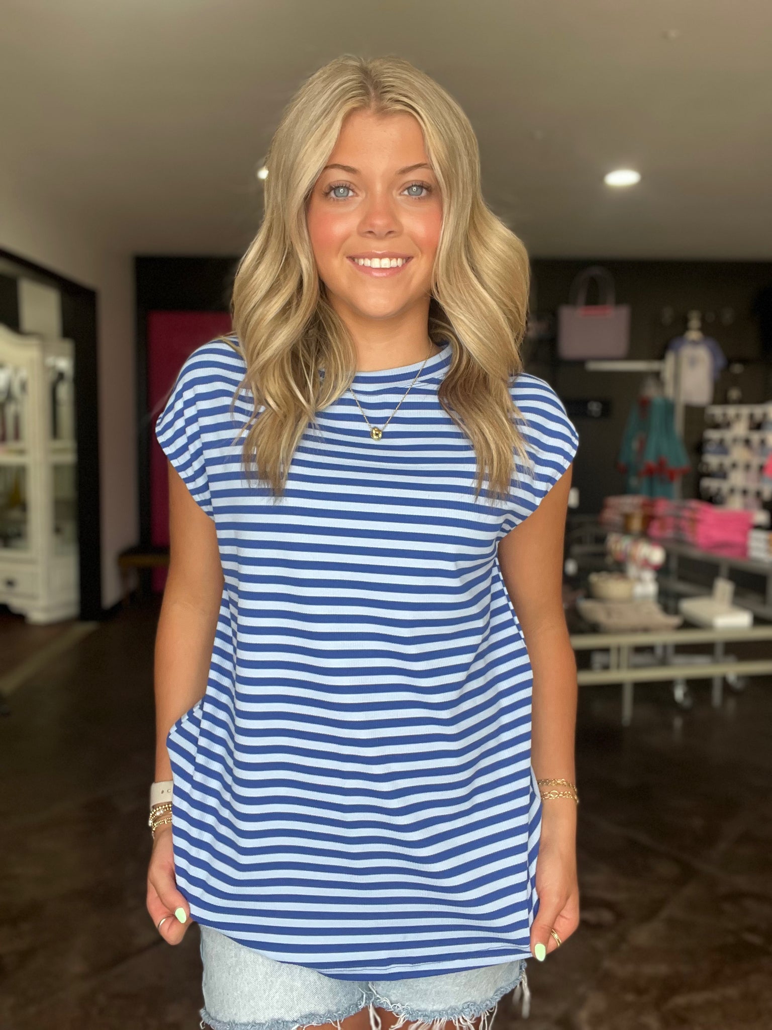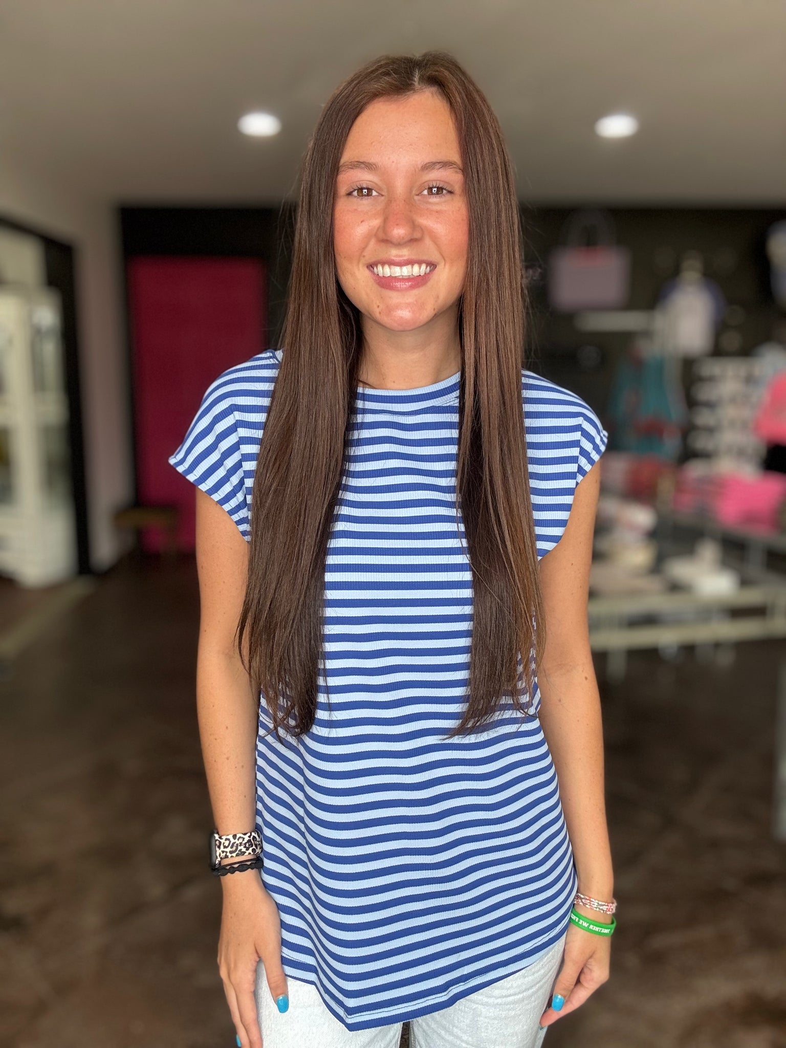 This is a sky blue striped top with a ribbed textured. It has cap sleeves and a round neck.