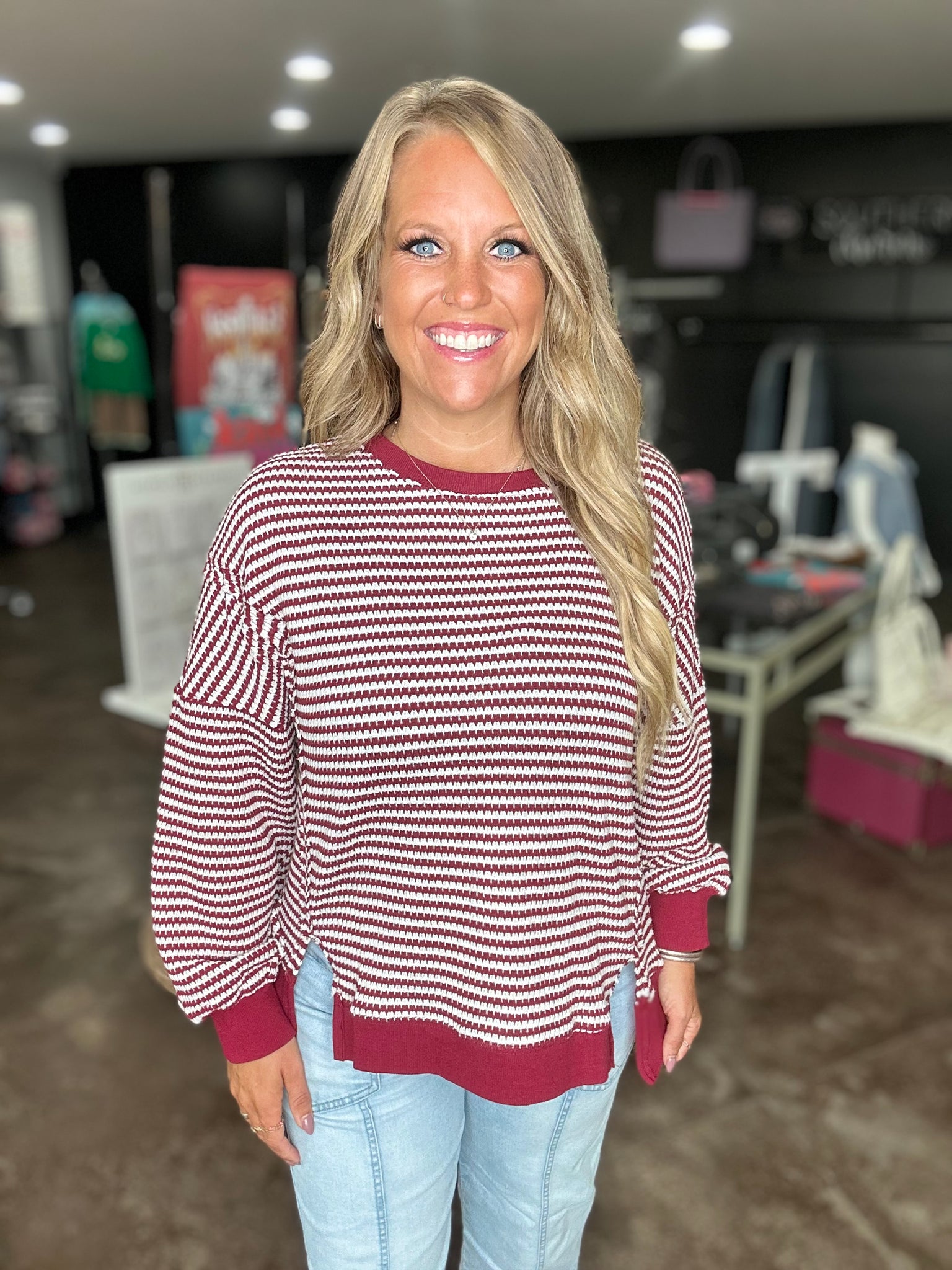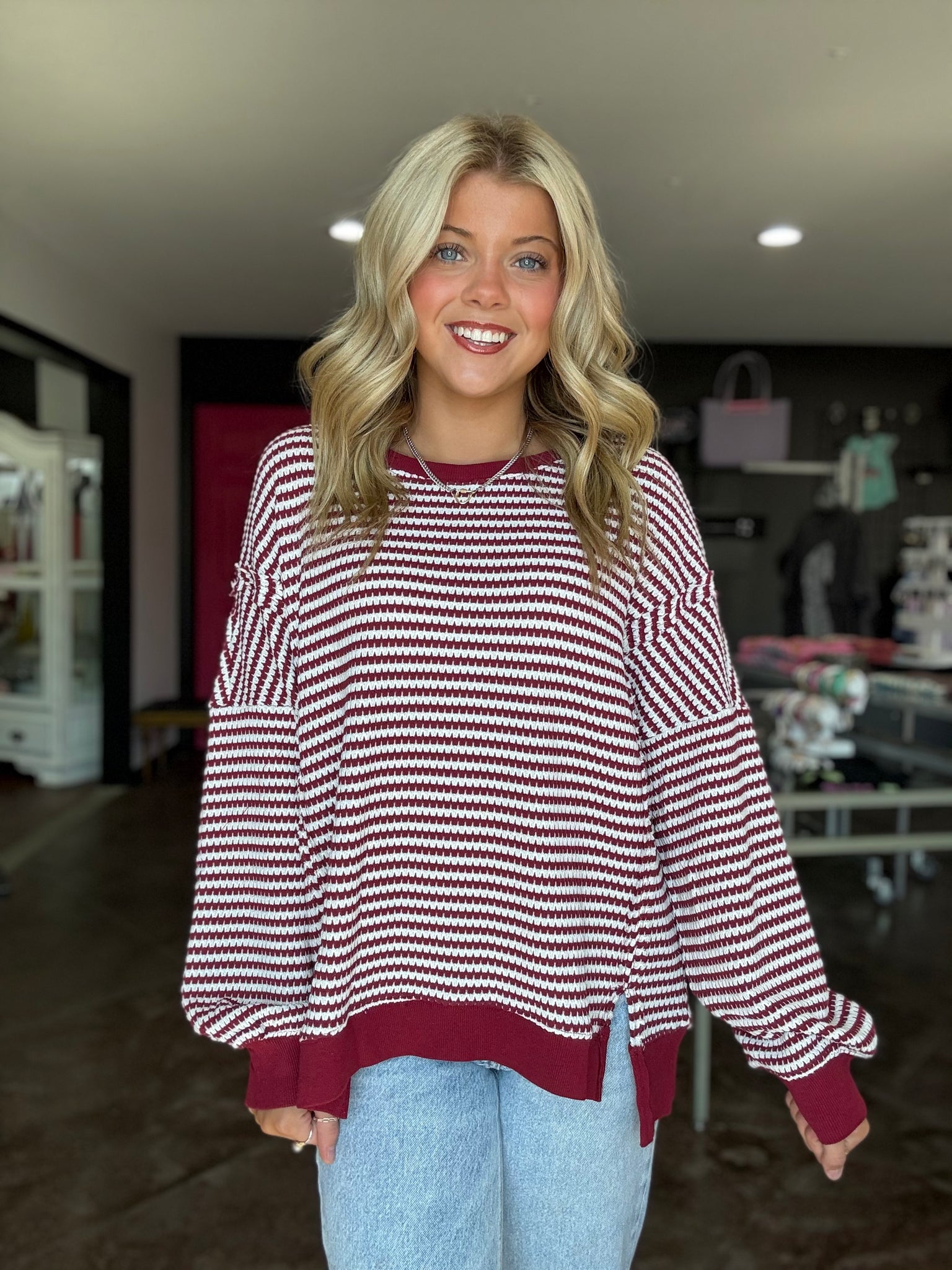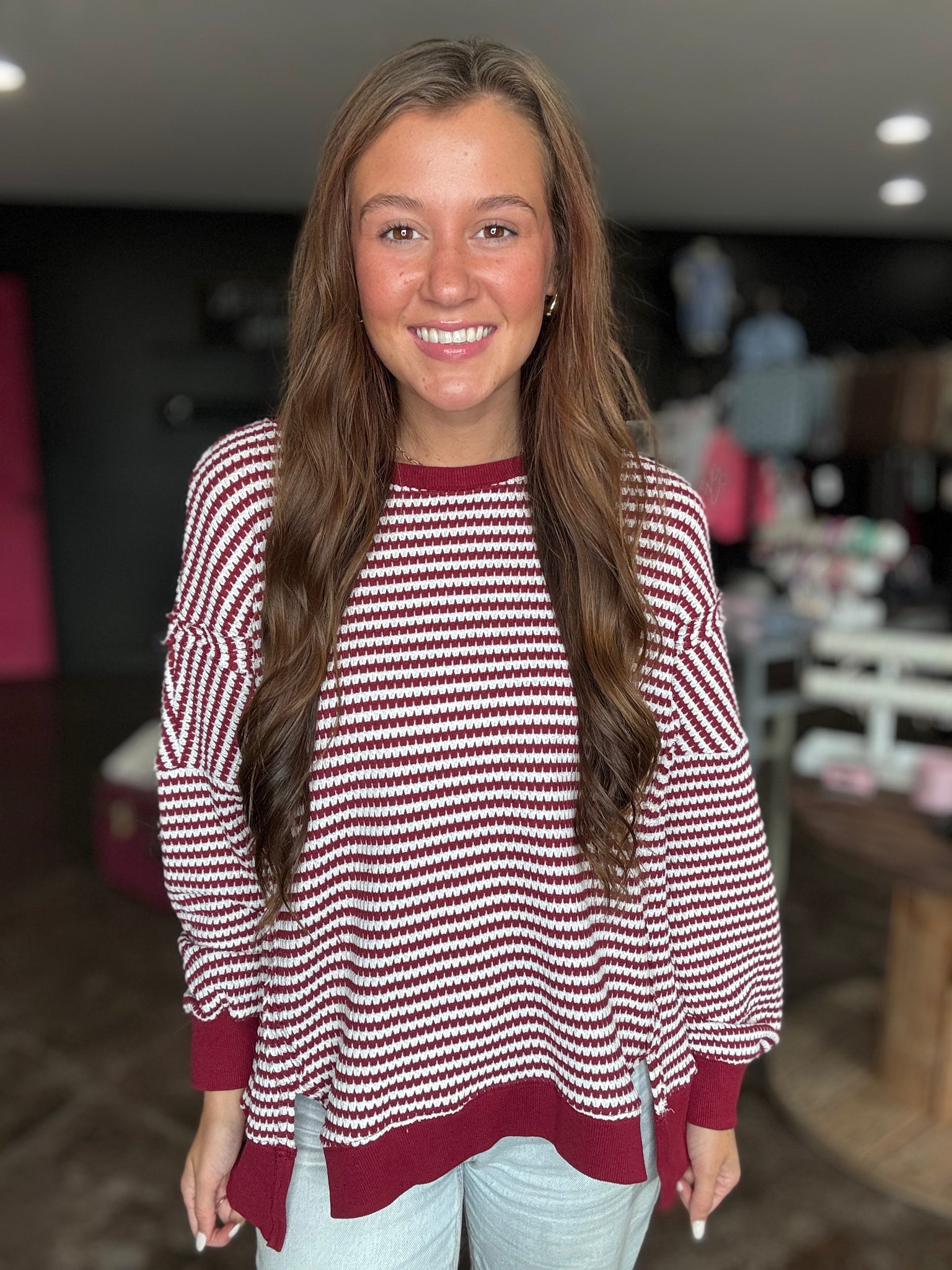 This is a burgundy striped top. It is made of this knitted material. The side slits make for a super comfortable fit!