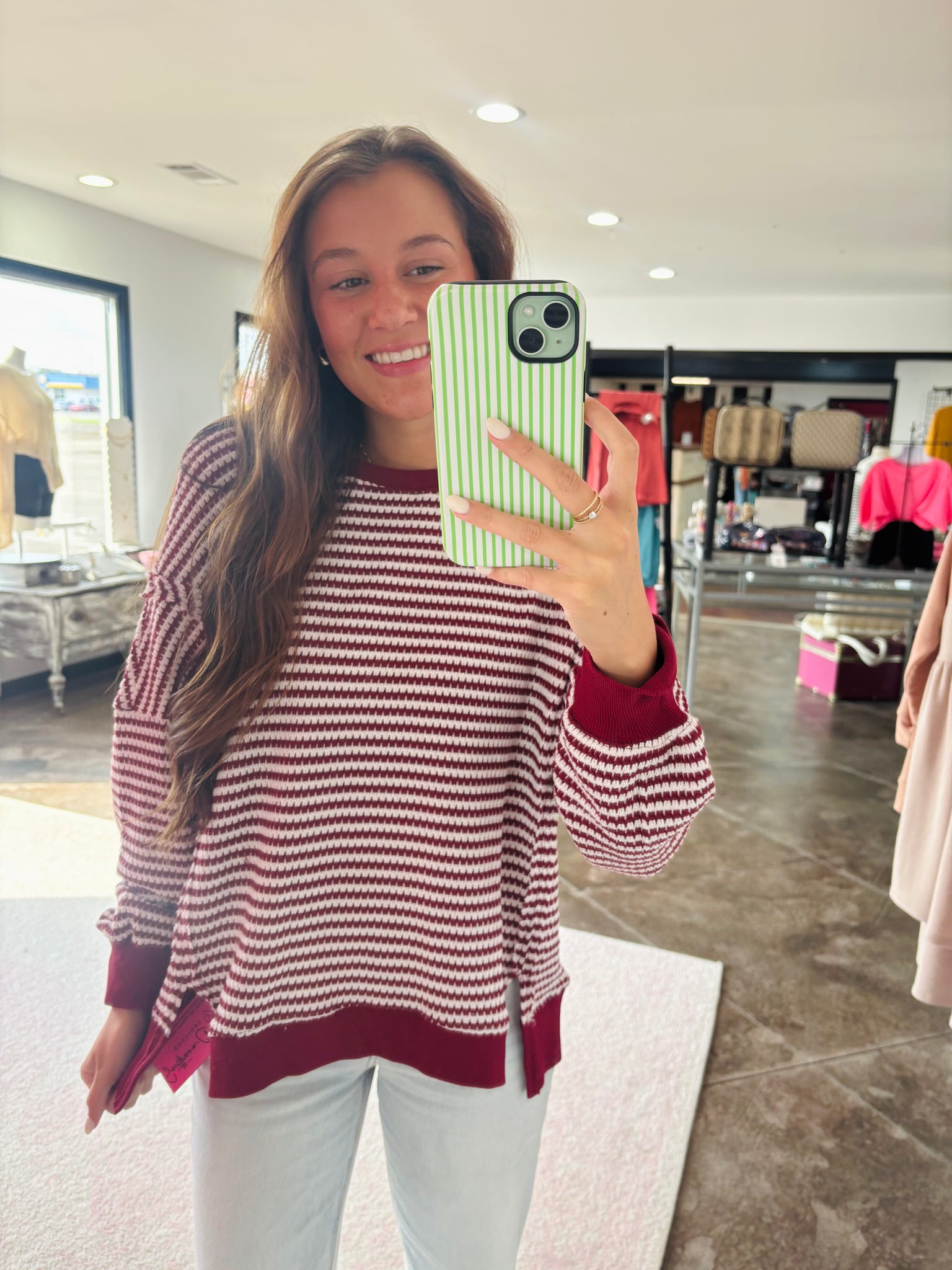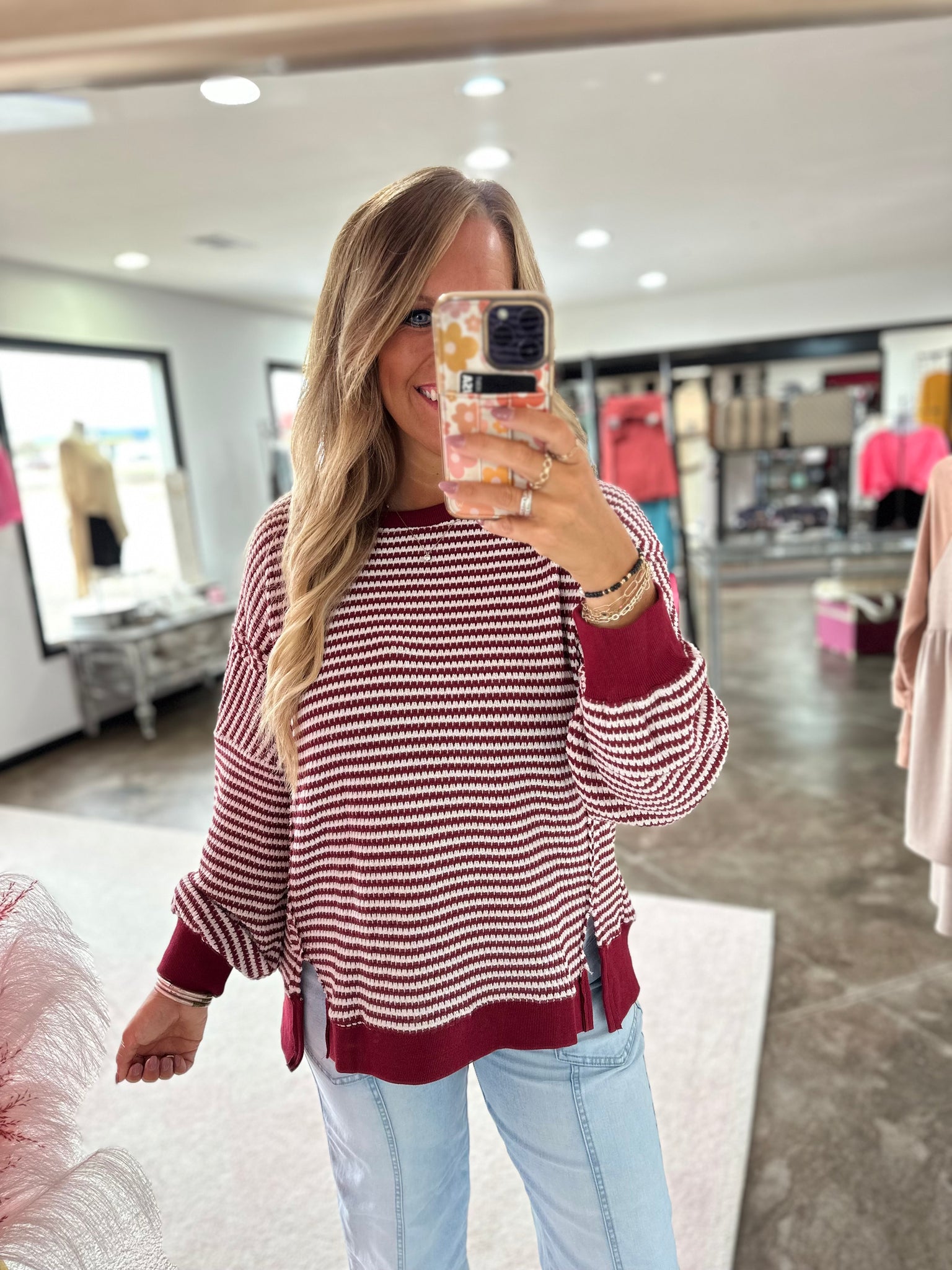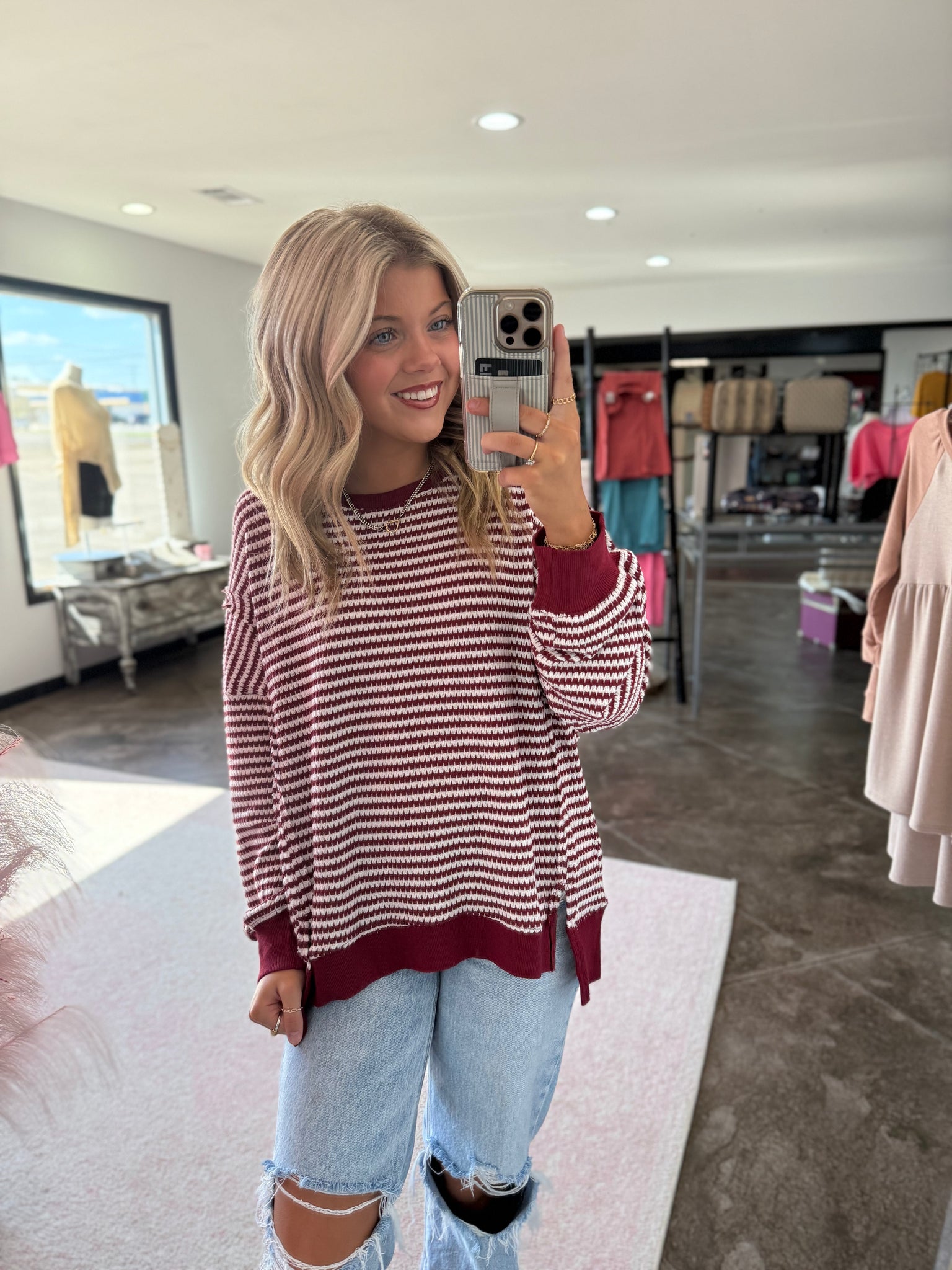 This is a burgundy striped top. It is made of this knitted material. The side slits make for a super comfortable fit!