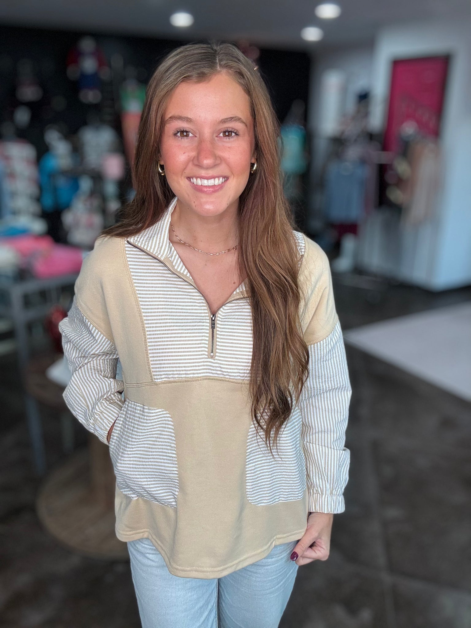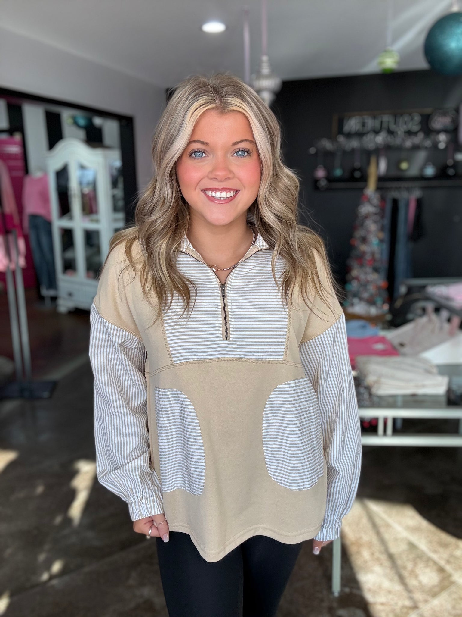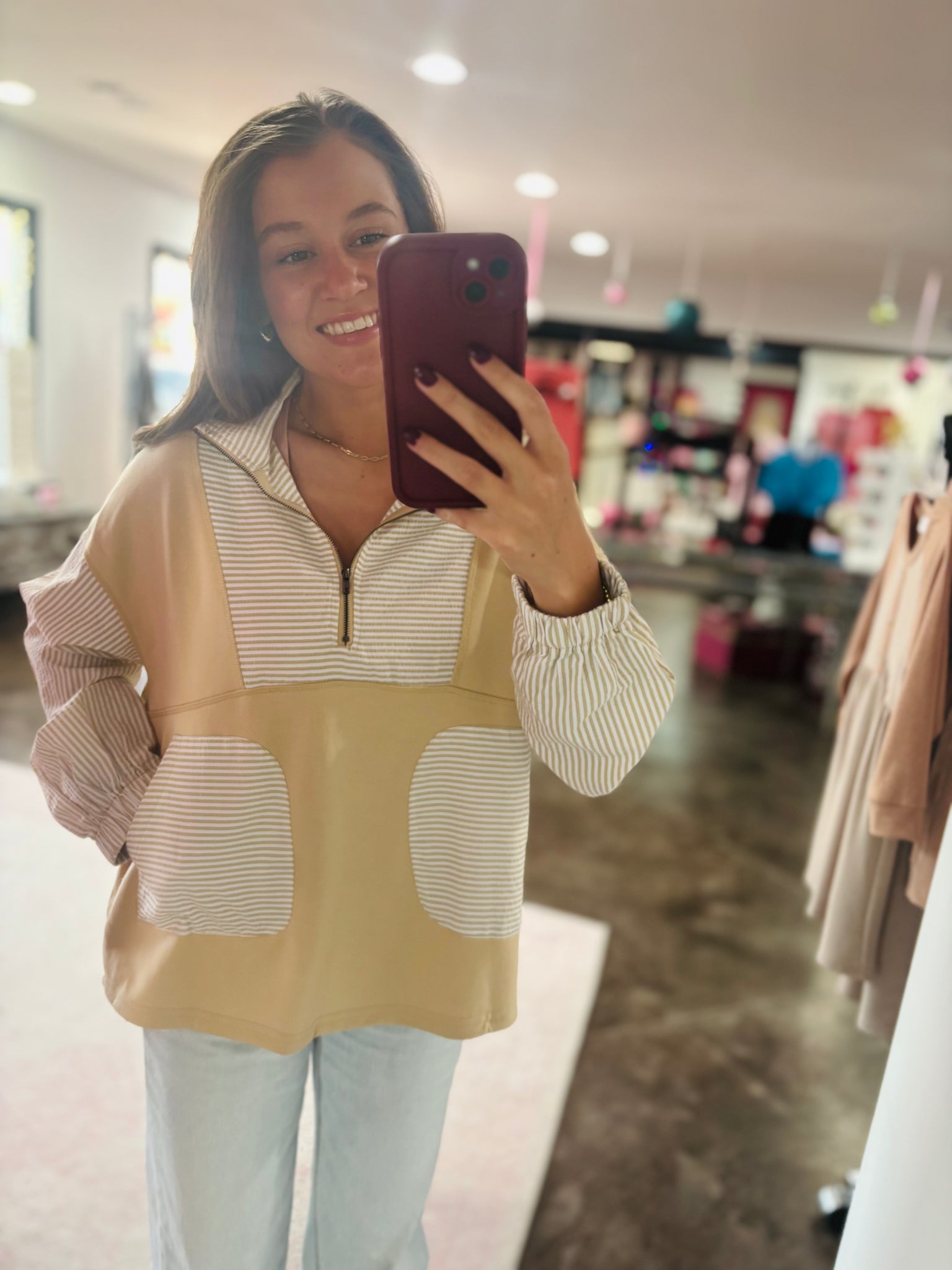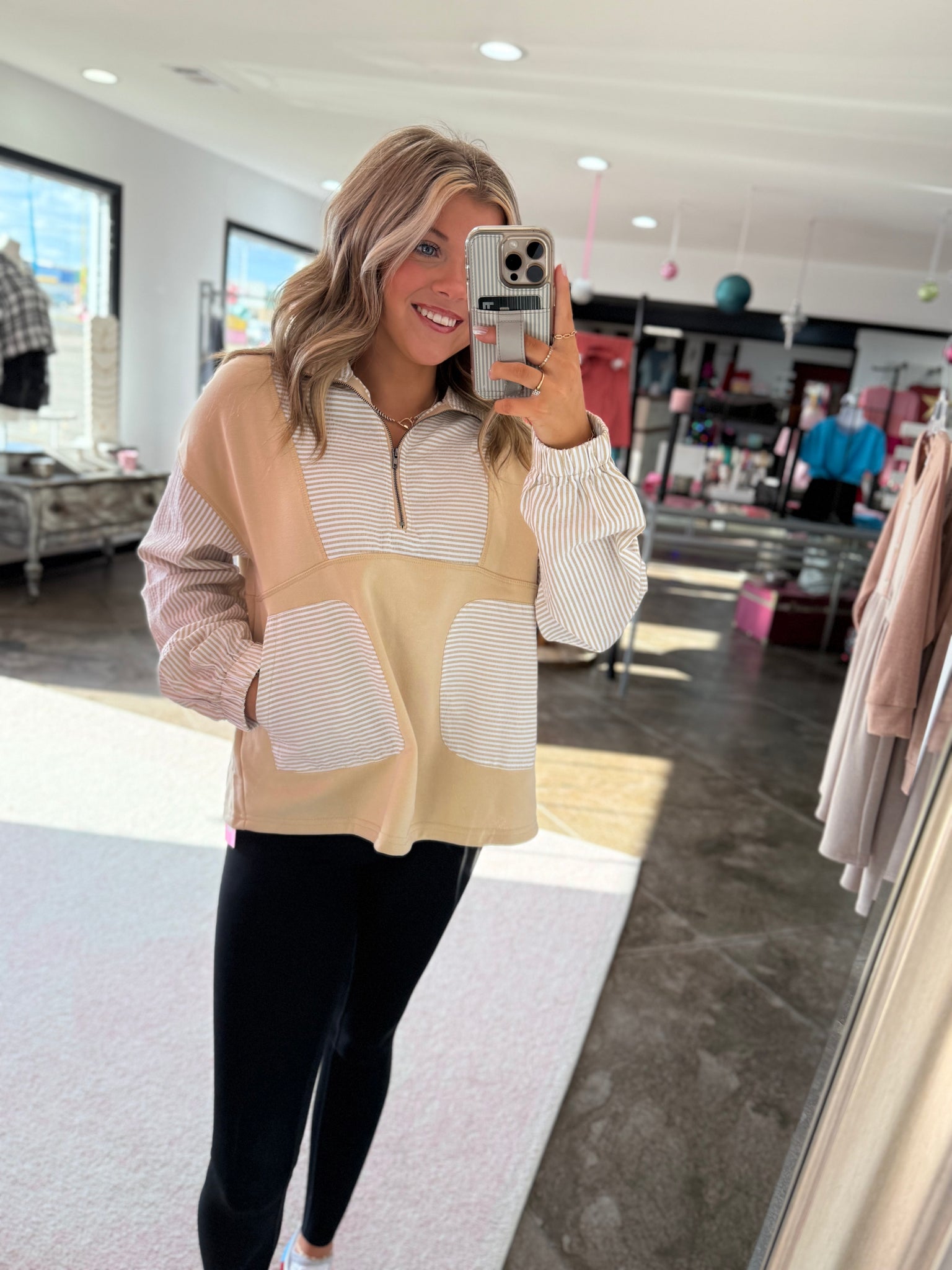 Neutral, quarter zip with stripe patchwork detailing. This top has on oversized, shorter fit.