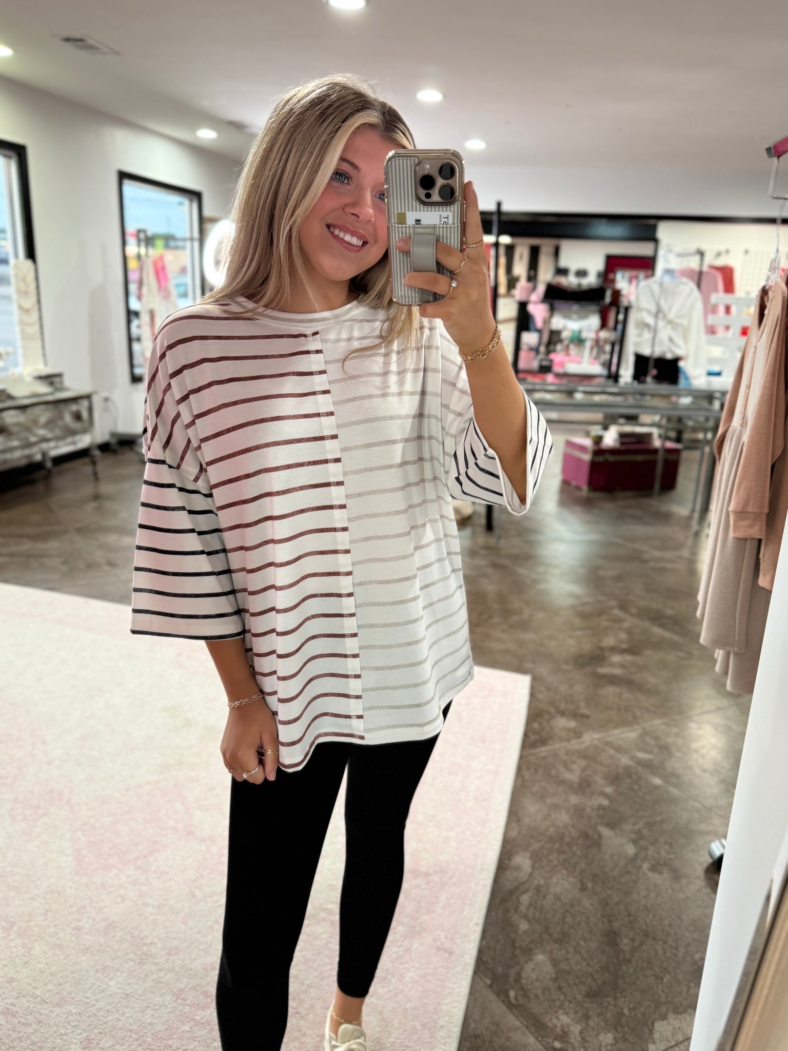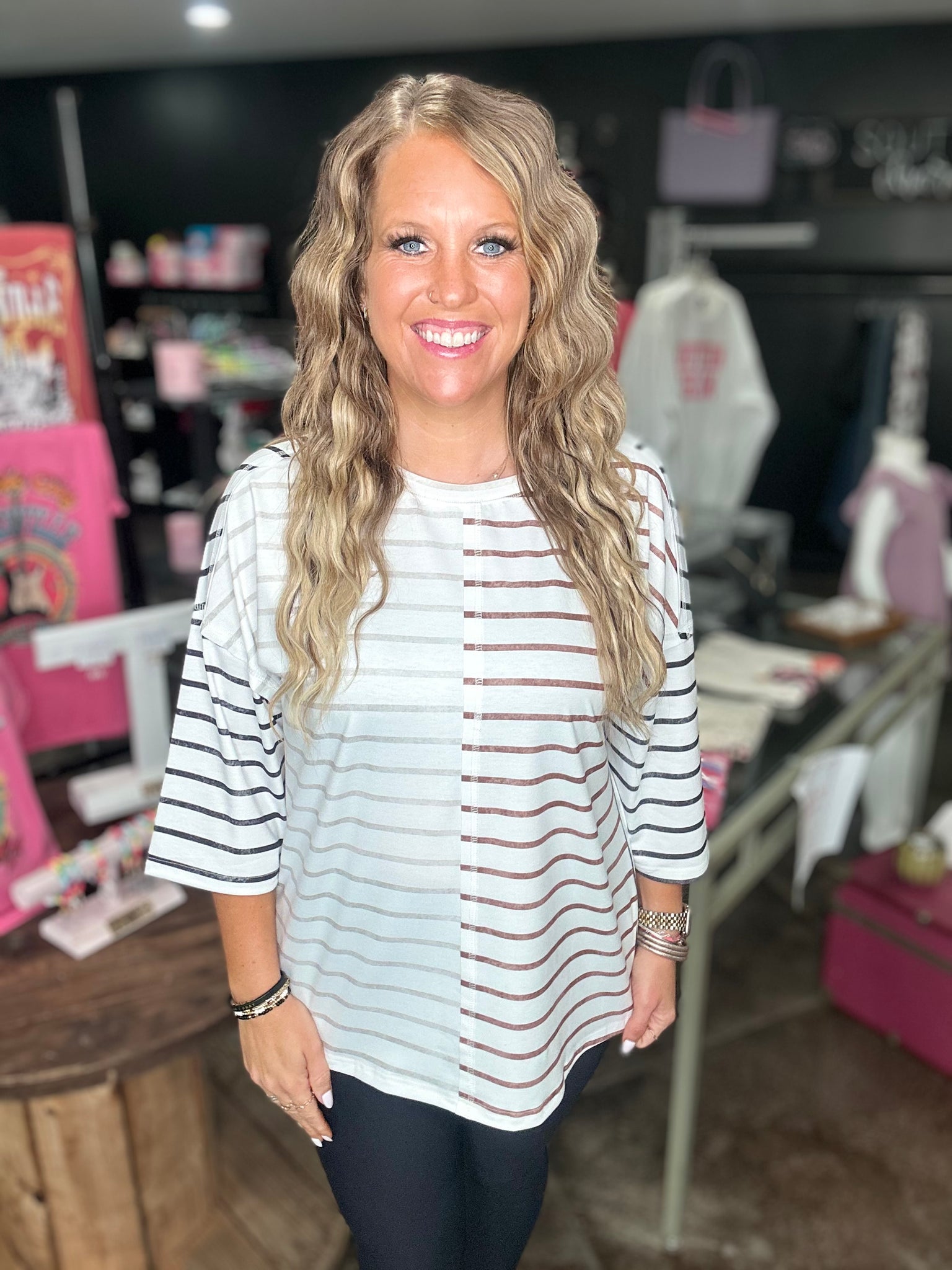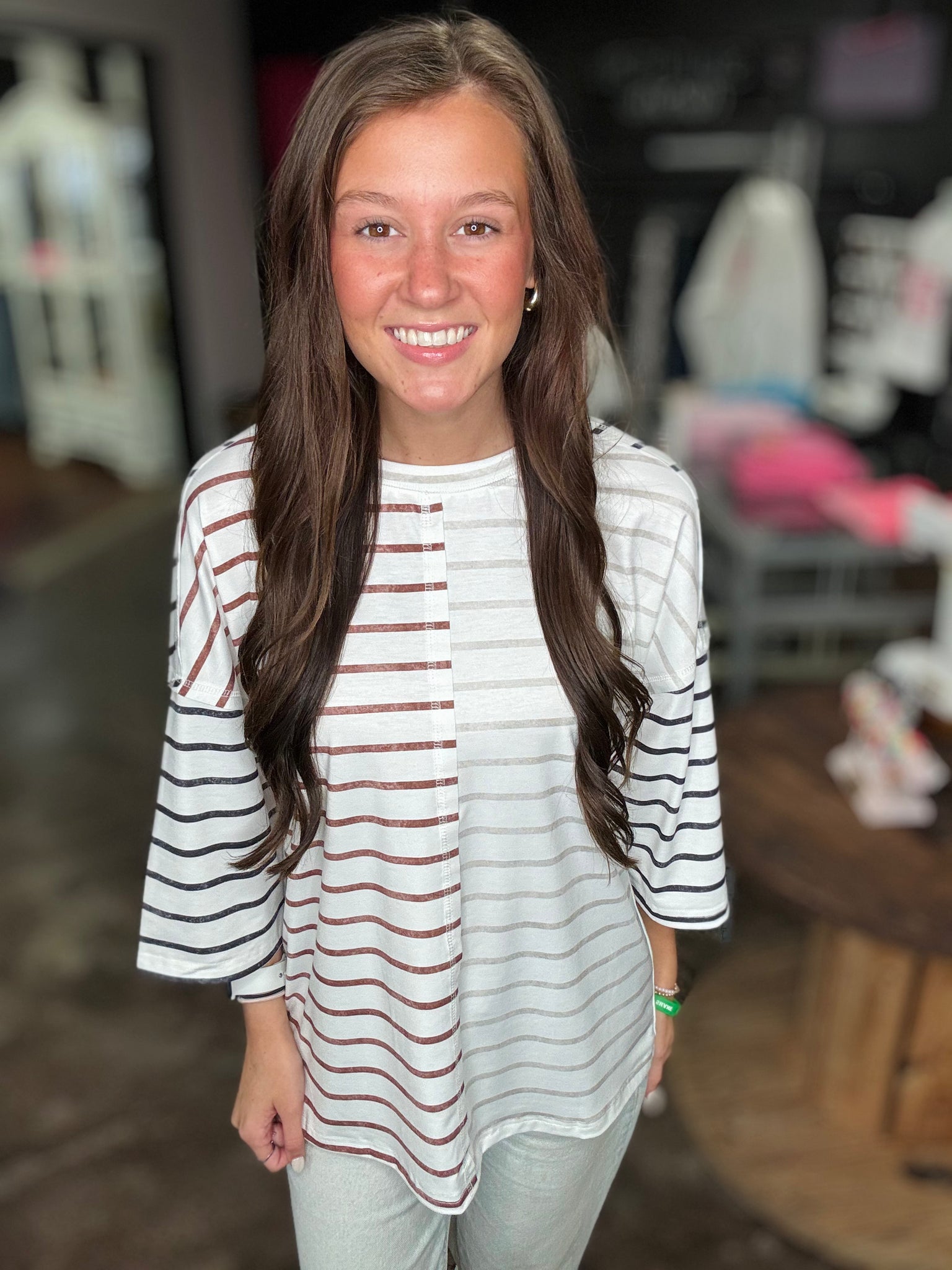 Khaki stripe colorblock top with 3/4 sleeves. This shirt has the best loose fit.