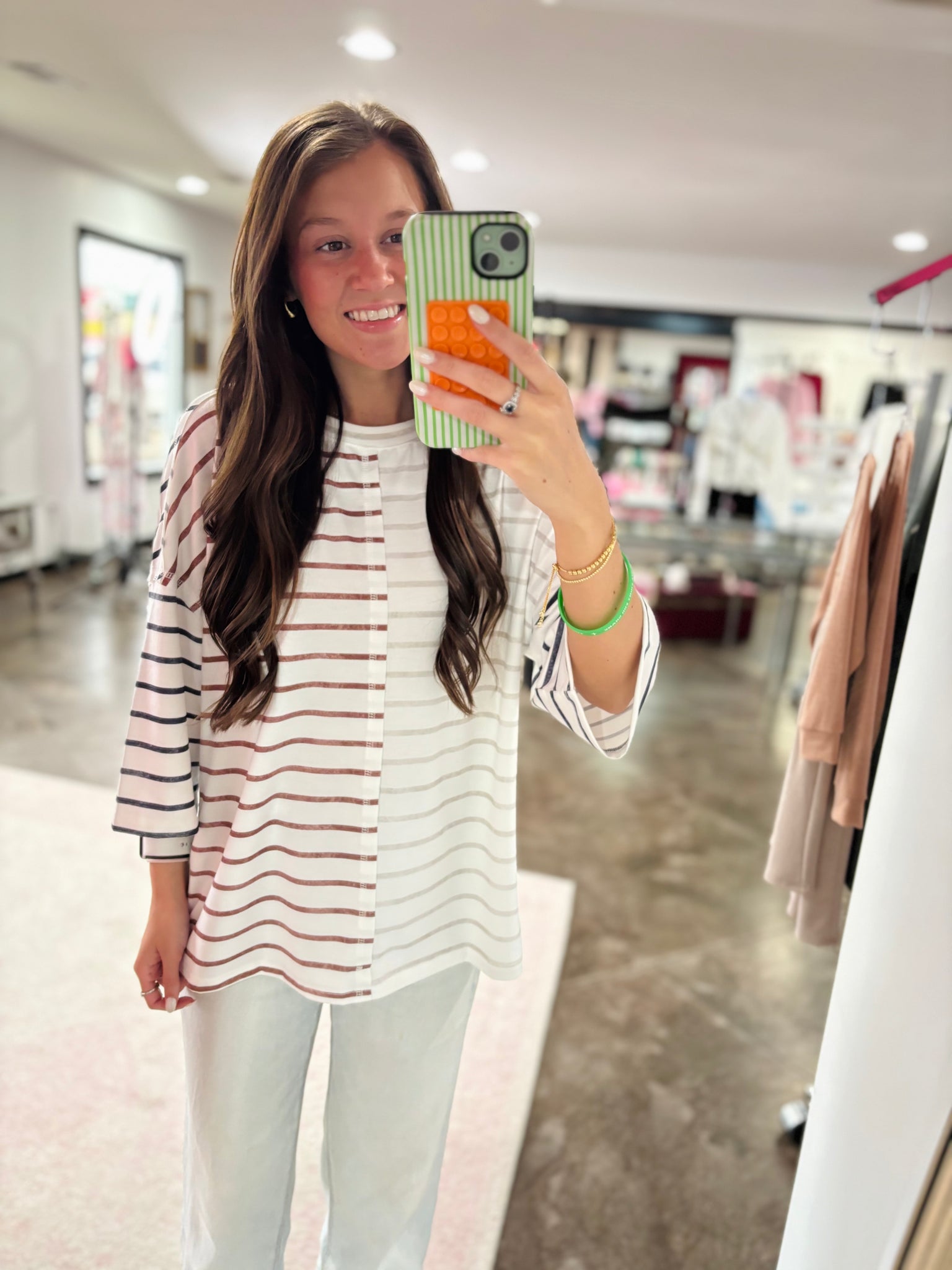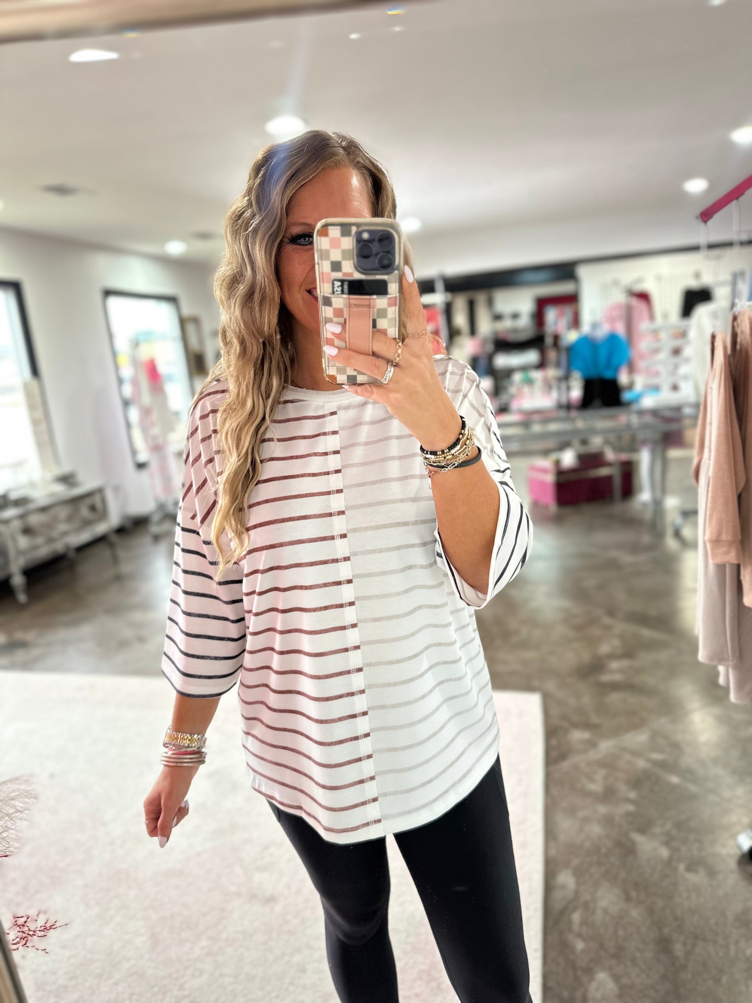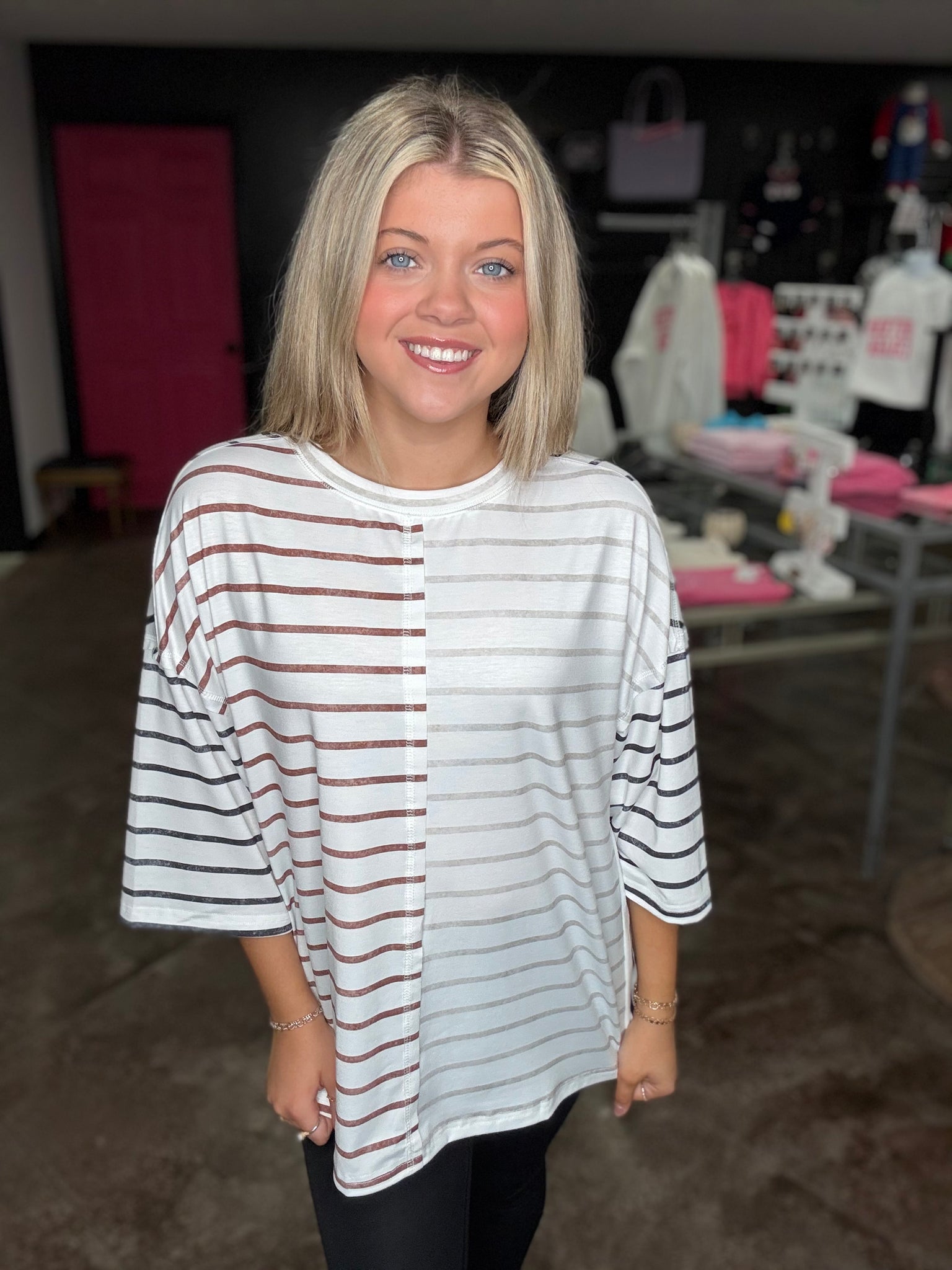 Khaki stripe colorblock top with 3/4 sleeves. This shirt has the best loose fit.