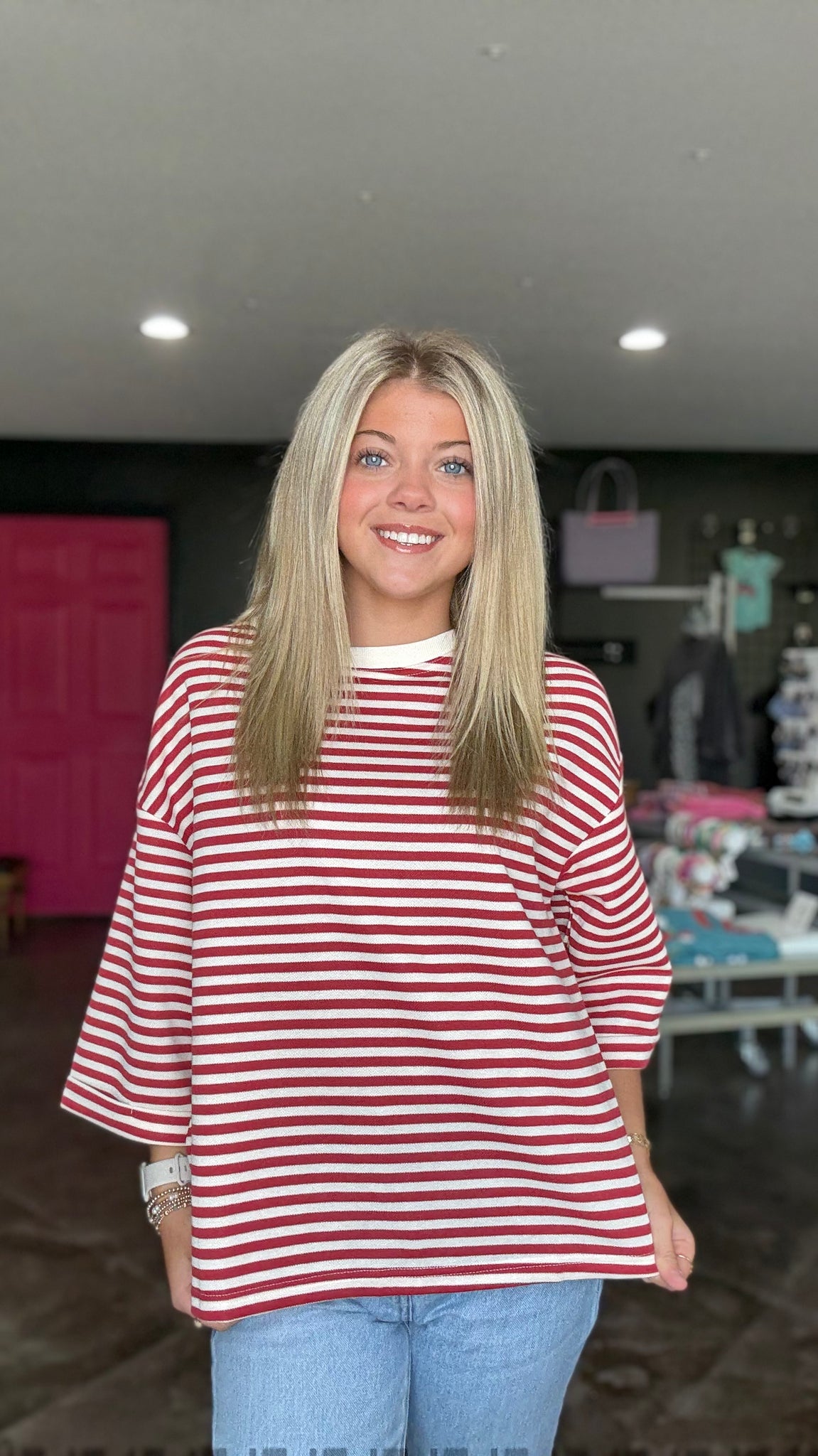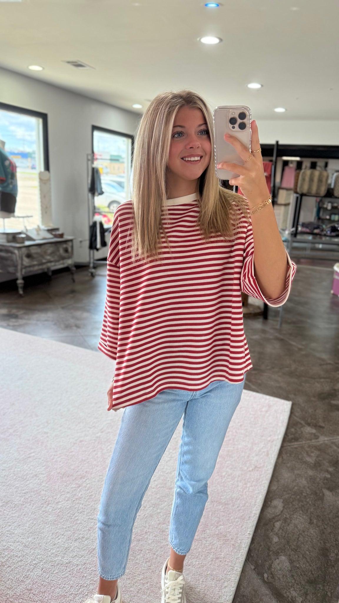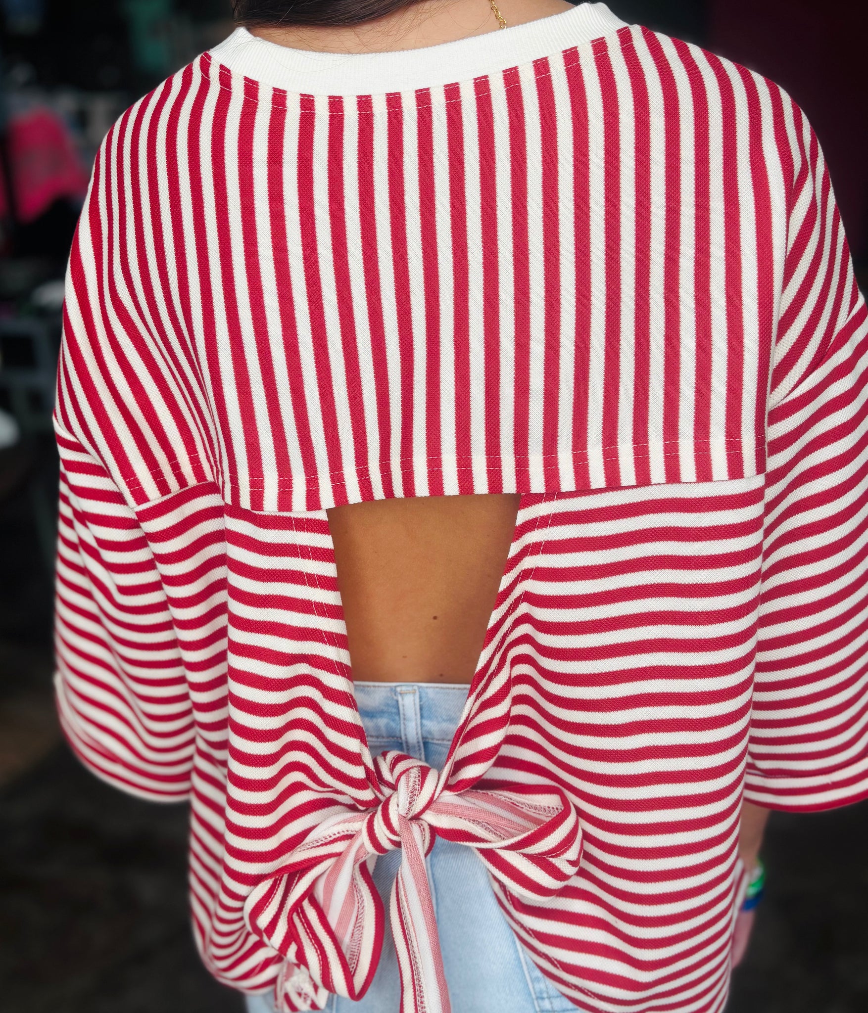 This is a red stripe top with a bow knot cut out back! It has a drop shoulder boxy fit with wide sleeves! This one is a MUST have!