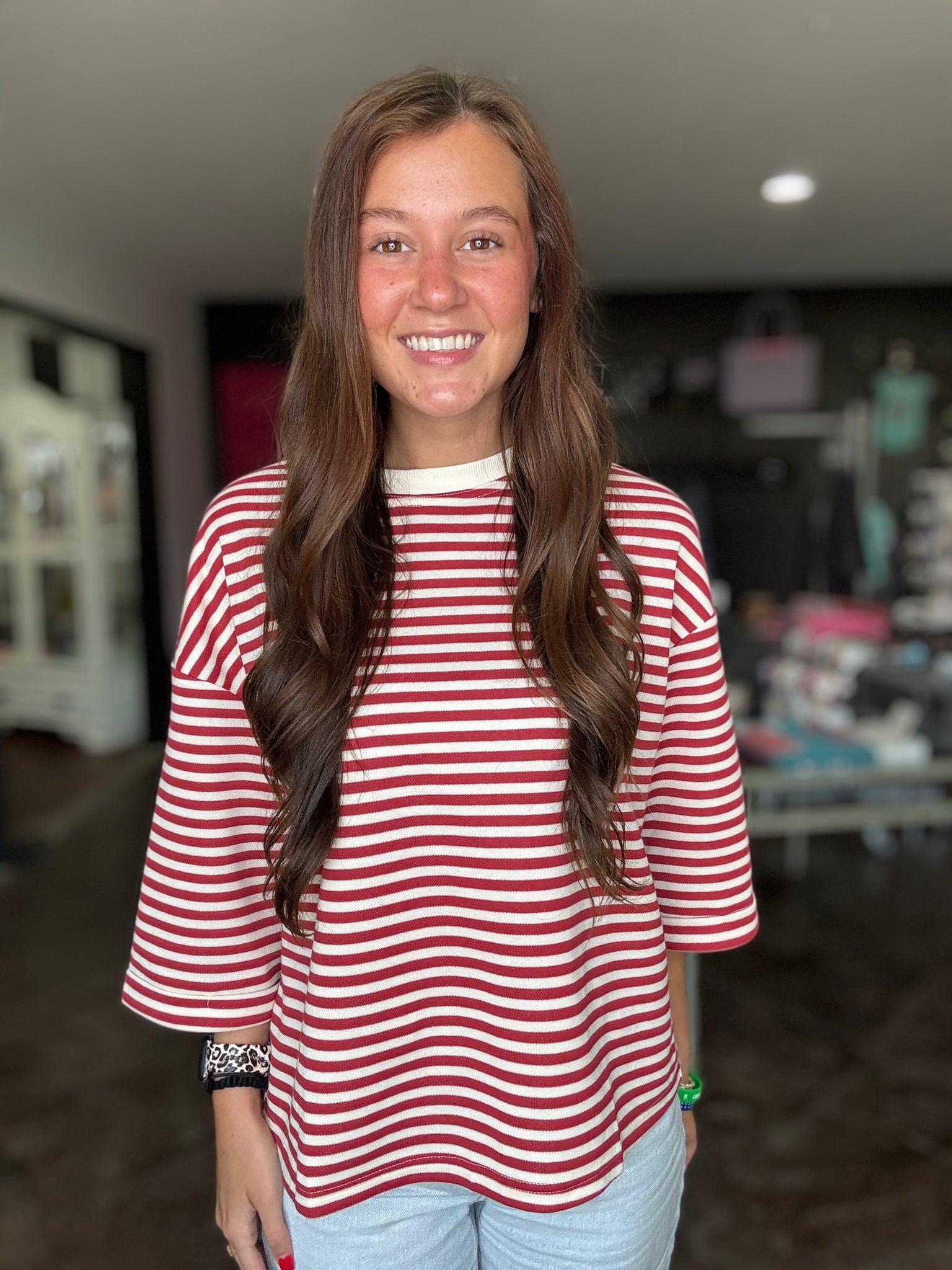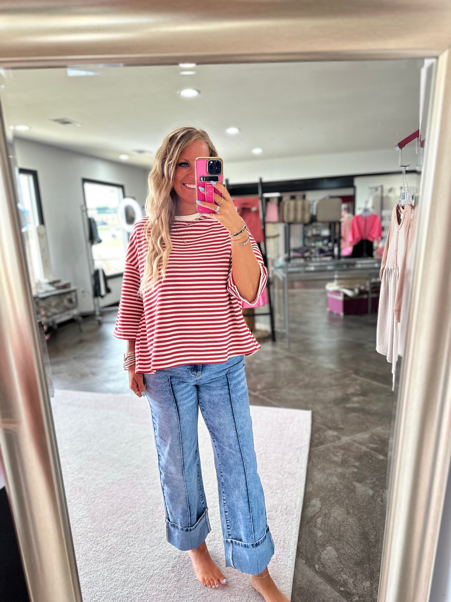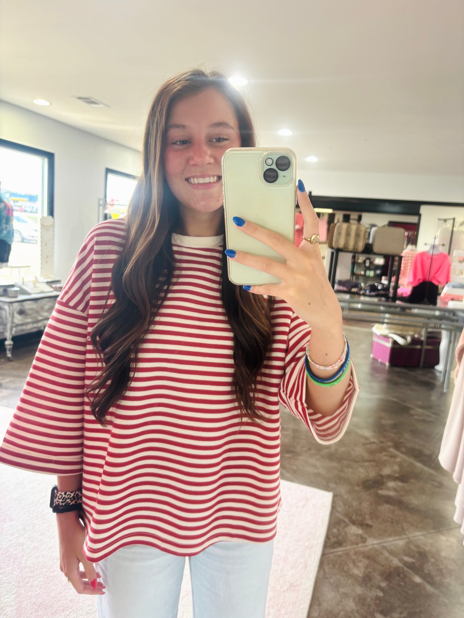 This is a red stripe top with a bow knot cut out back! It has a drop shoulder boxy fit with wide sleeves! This one is a MUST have!