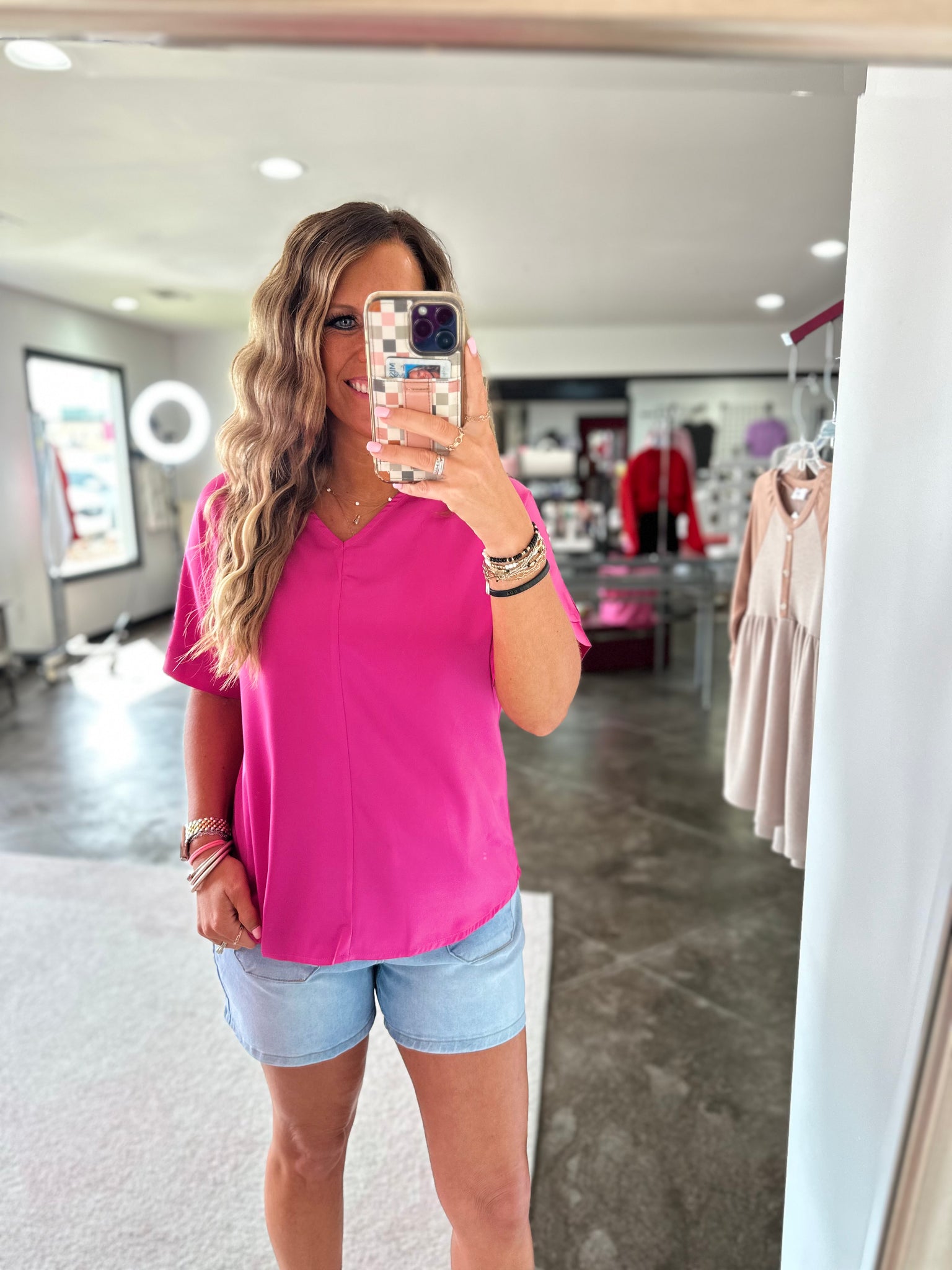 This is a bright pink short sleeve top. It is made of a silky material and has the cutest v-neck! This is the perfect top for our pink lovers!