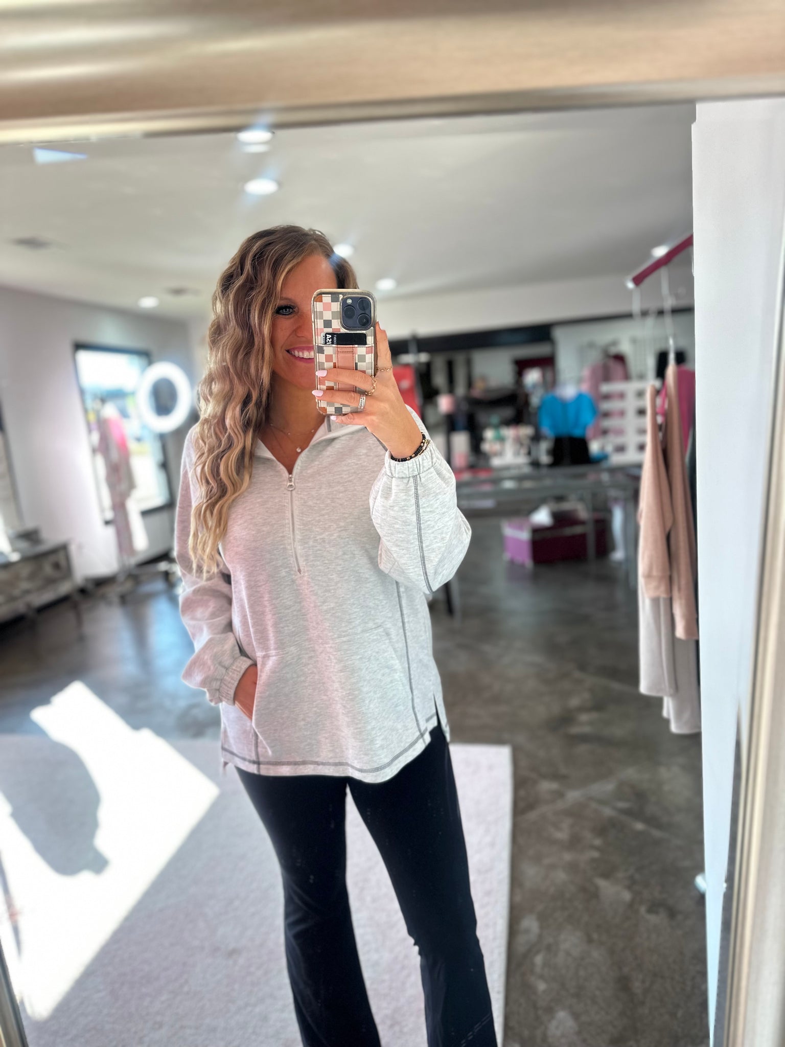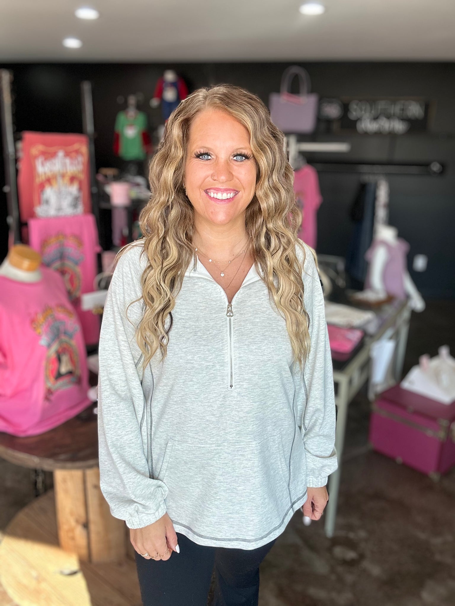 This is a light grey half zip! It has contrast seam detailing that adds the perfect touch!